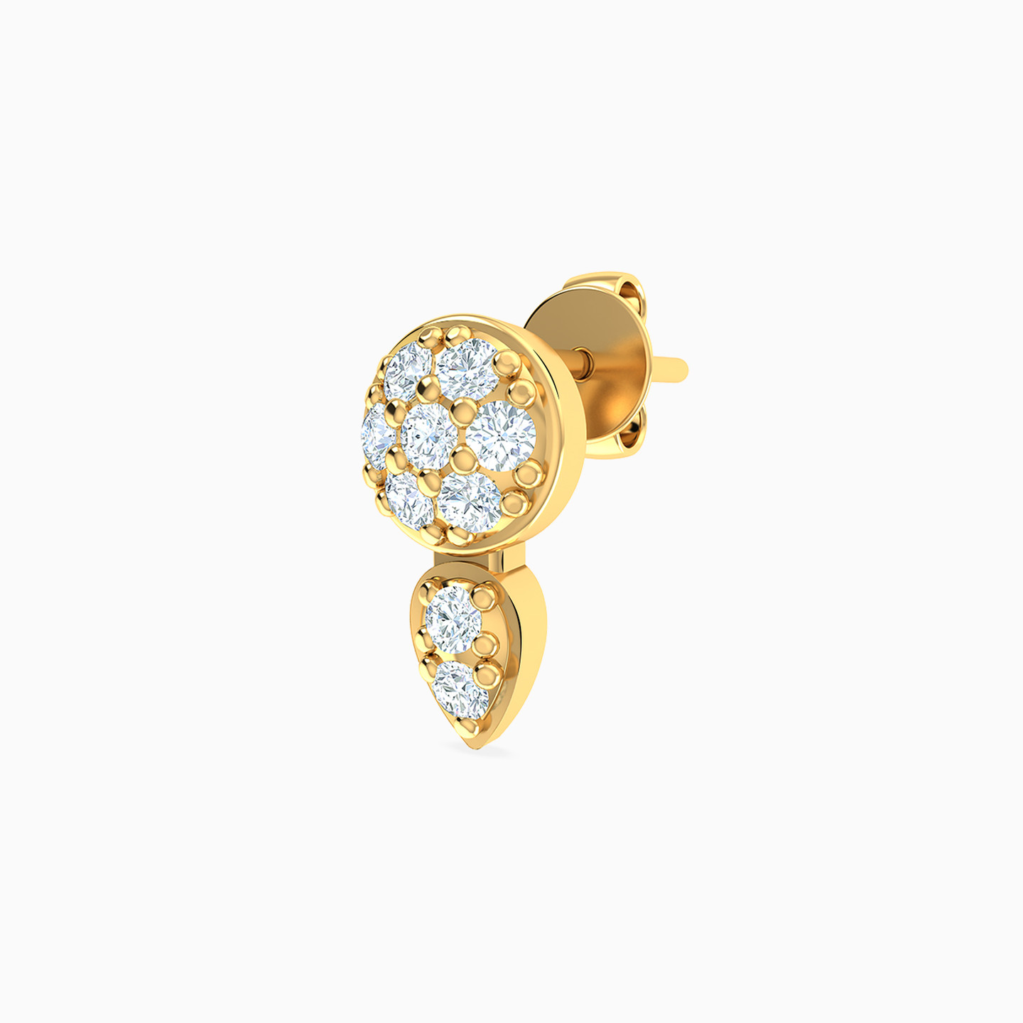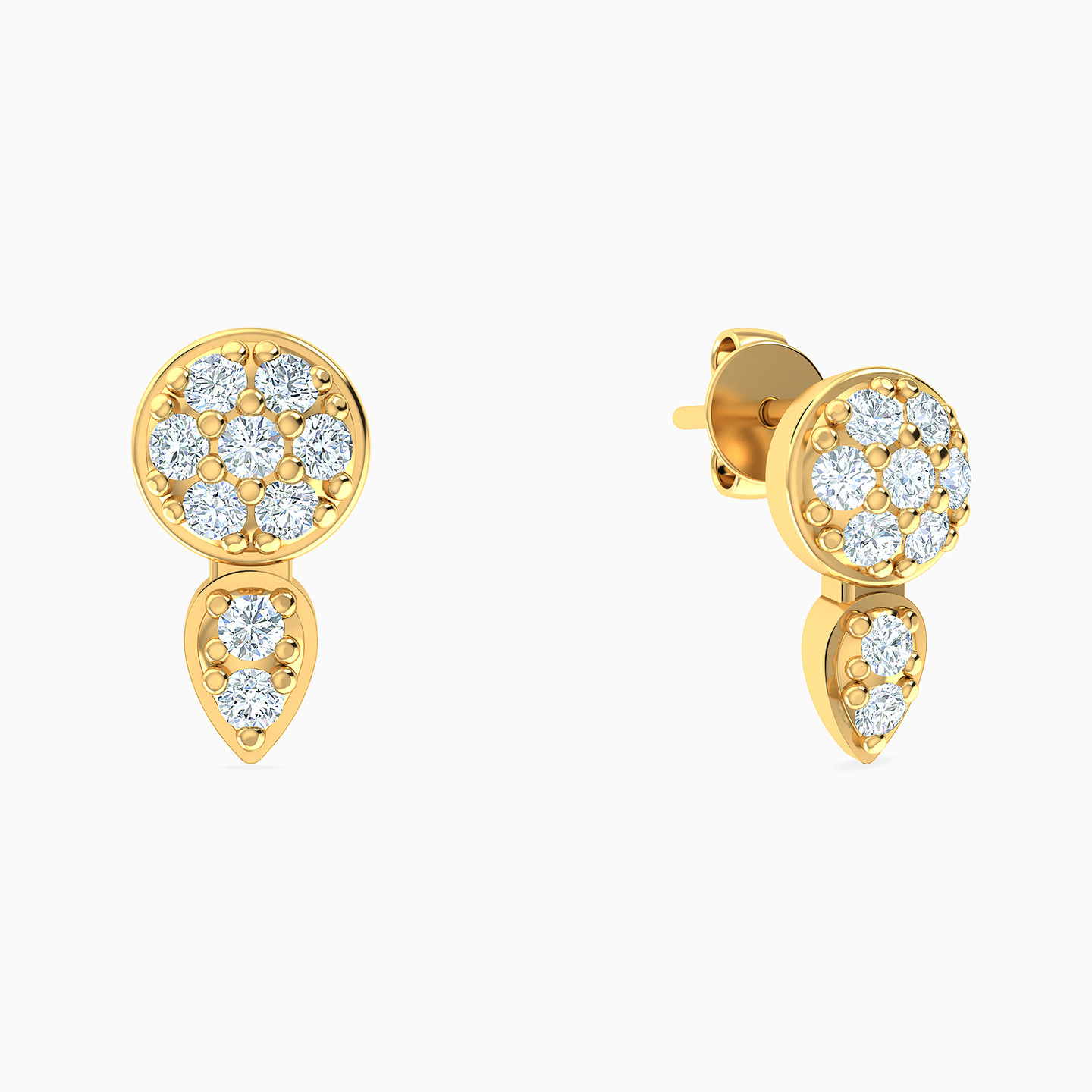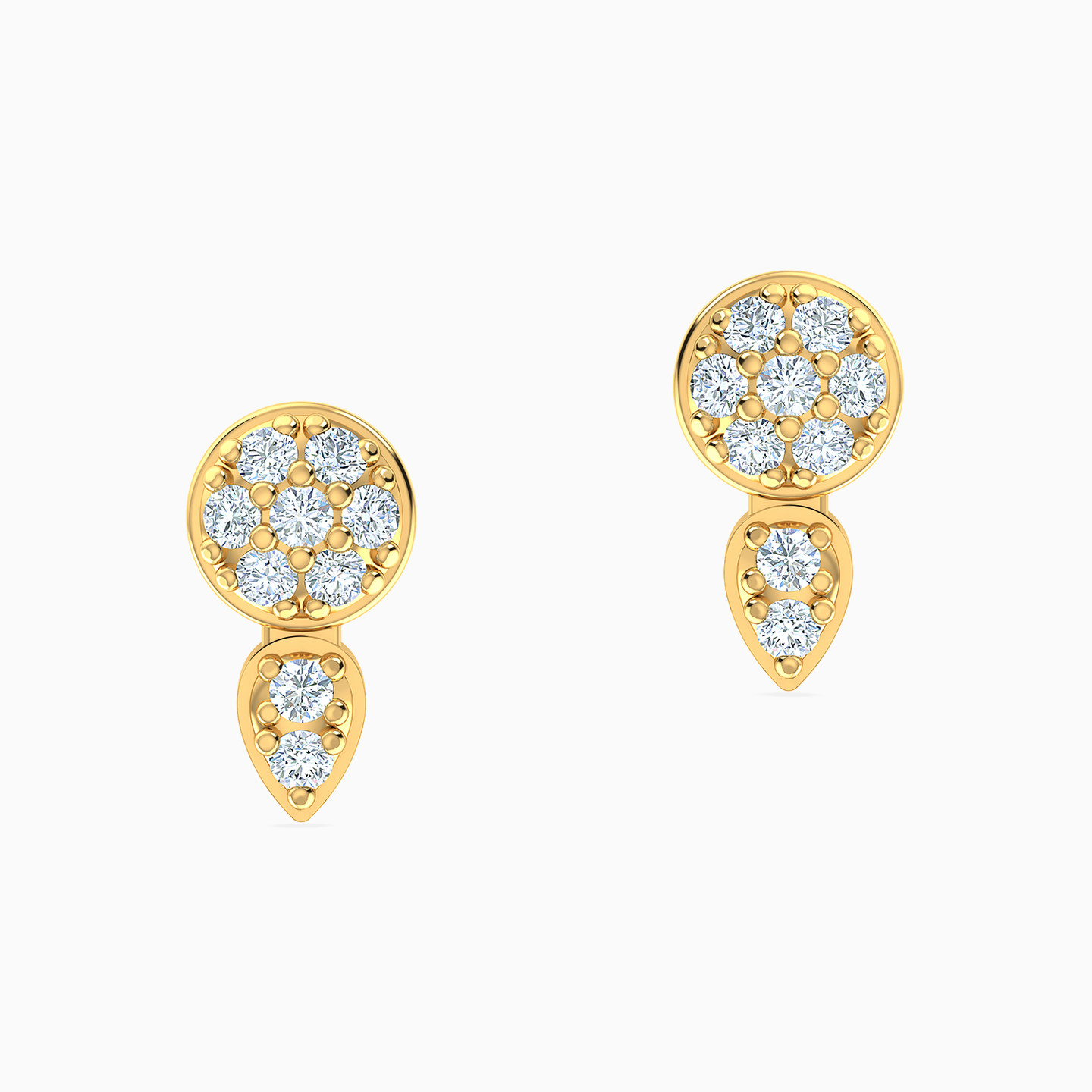 A timeless pair of studs from L’azurde Gold! Featuring a circular base studded with cubic zirconia stones and connected to a pear-shaped motif glistening with two beautifully set cubic zirconia, these studs look simply stunning. Crafted from 18-karat yellow gold, you can wear these studs for a workday or day out with the girls.