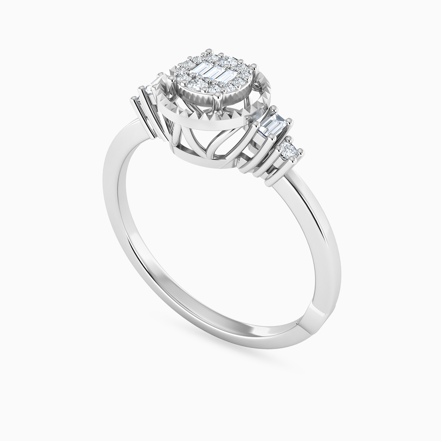 A brilliantly crafted statement ring by L'azurde Diamonds to make you dazzle wherever you go! Featuring a beautifully textured halo holding a circular frame studded with the most sparkling brilliant cut diamonds and baguette-cut diamonds, this ring sparkles from every angle. The open frame design and 18-karat white gold body add to the beauty of this ring.