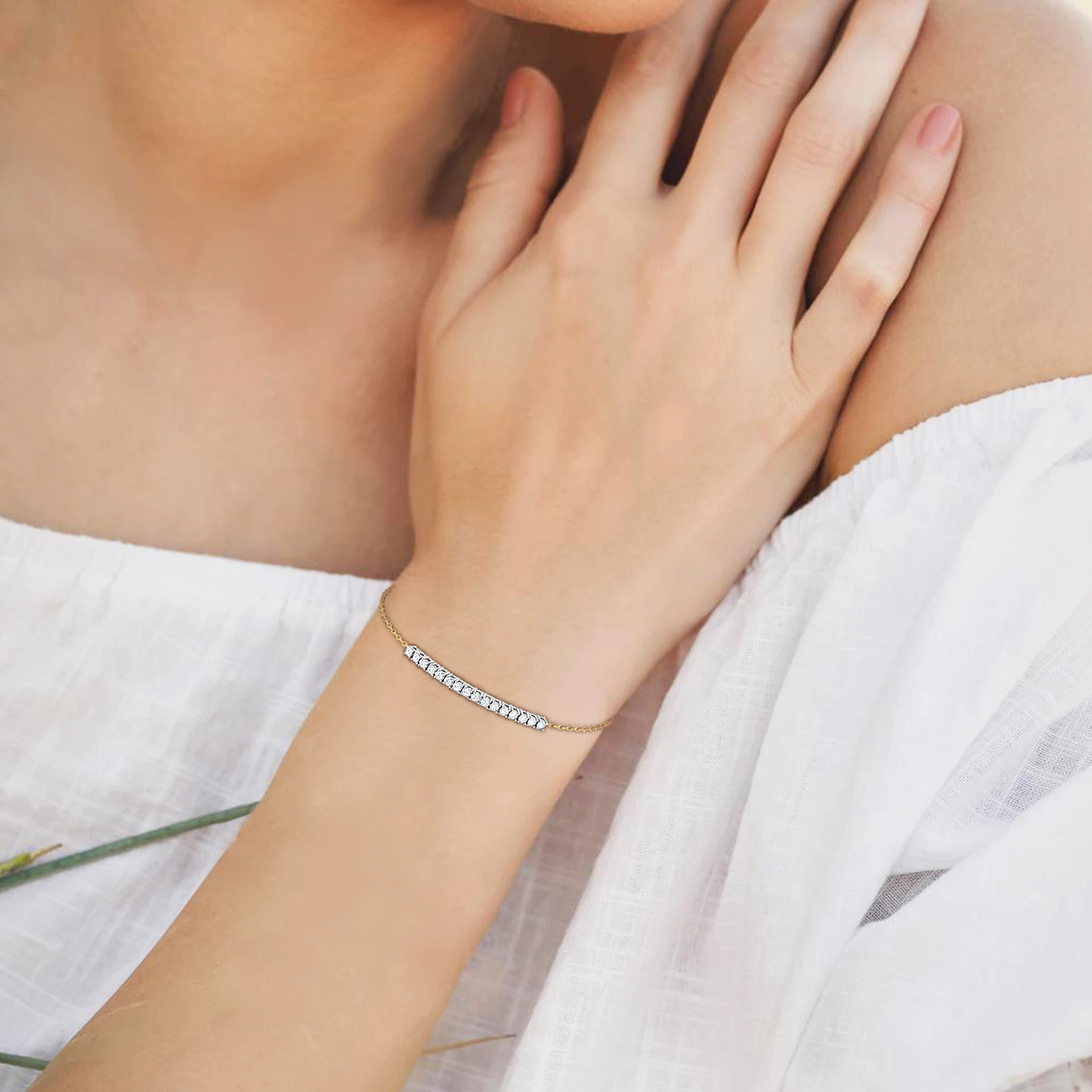 A dainty bracelet lined with shimmering diamonds, radiating elegance in every detail. This delicate piece is perfect for adding a touch of refinement to daily outfits or evening wear—an essential for timeless beauty.