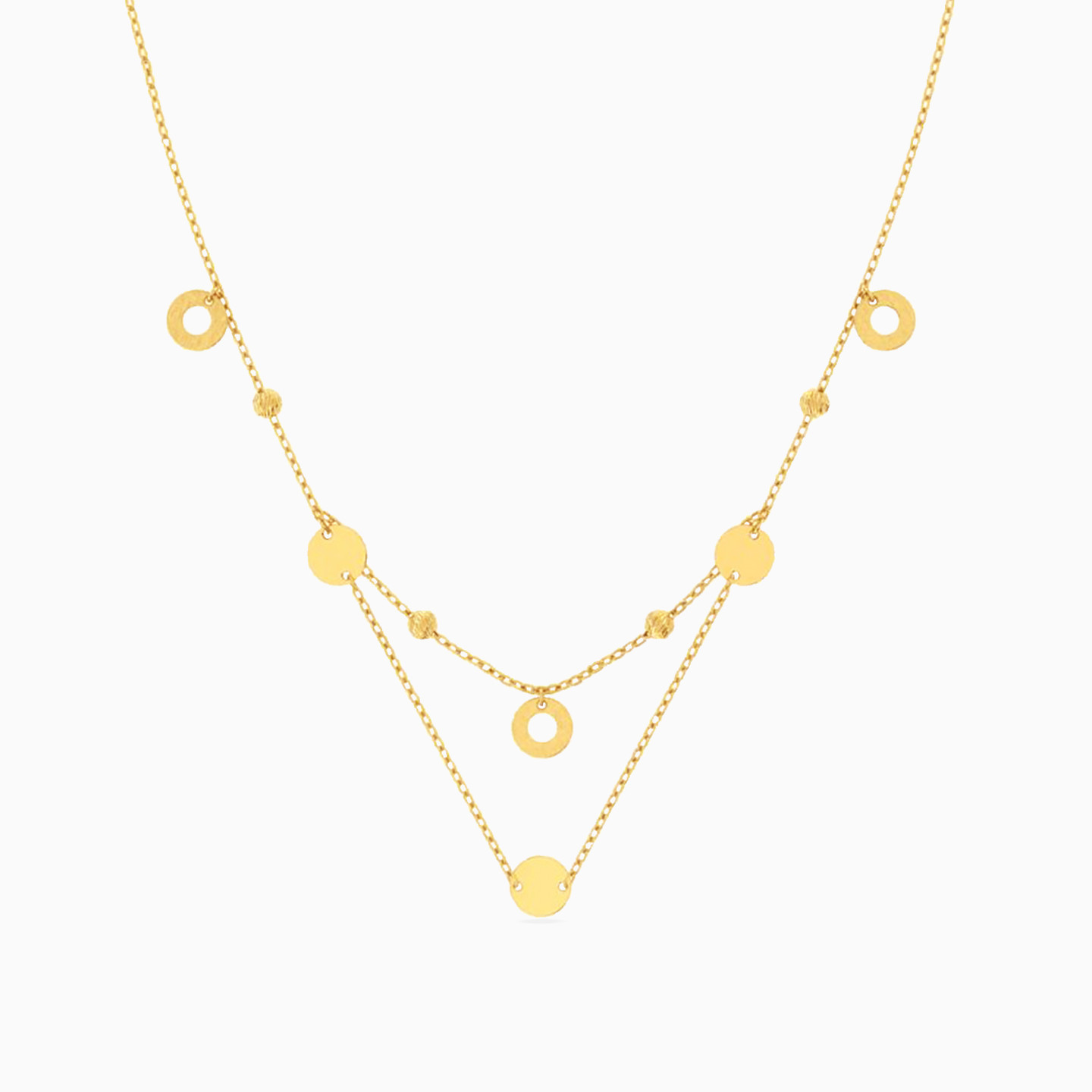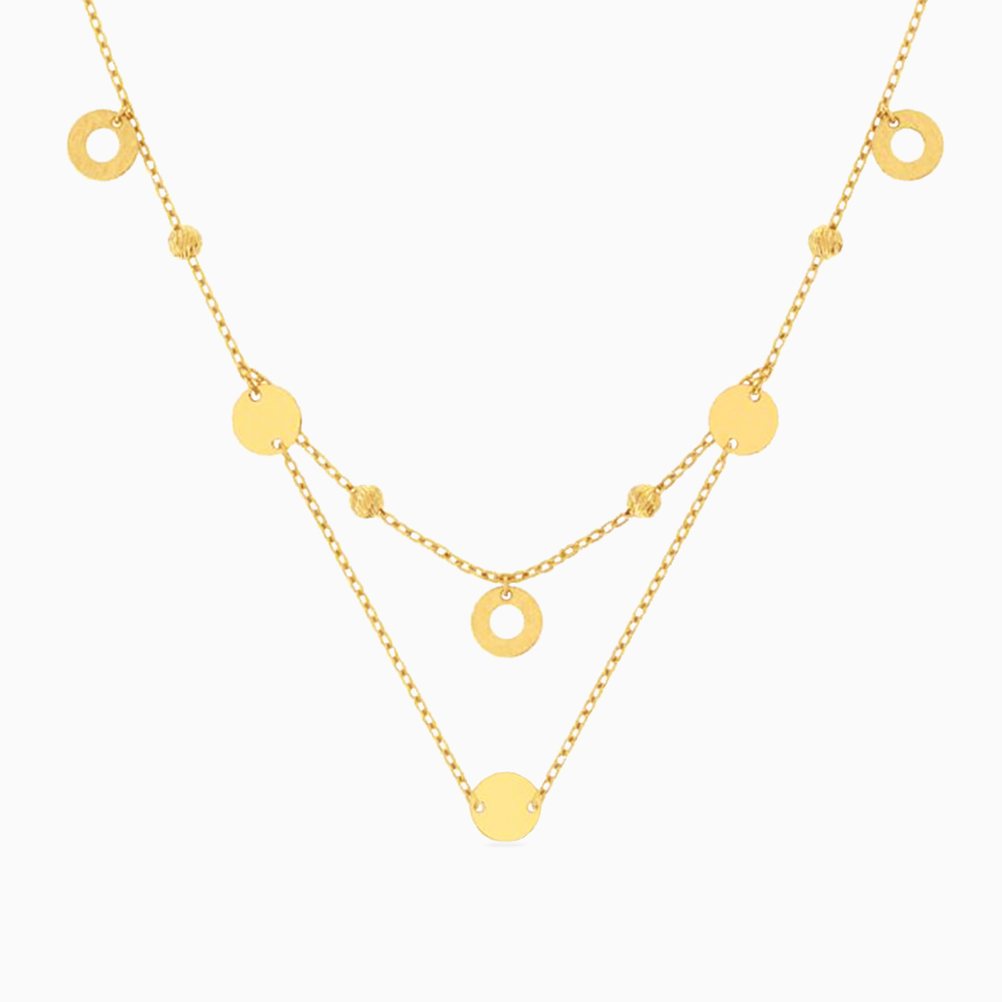 Add a touch of playfulness to your everyday wardrobe with this layered necklace from Miss L’. Featuring solid and cut out circles in 18-karat yellow gold, this piece works well with formal as well as casual wear and will transition with you from day to evening. Wear it over a collared shirt or a boat neckline for a classy look.