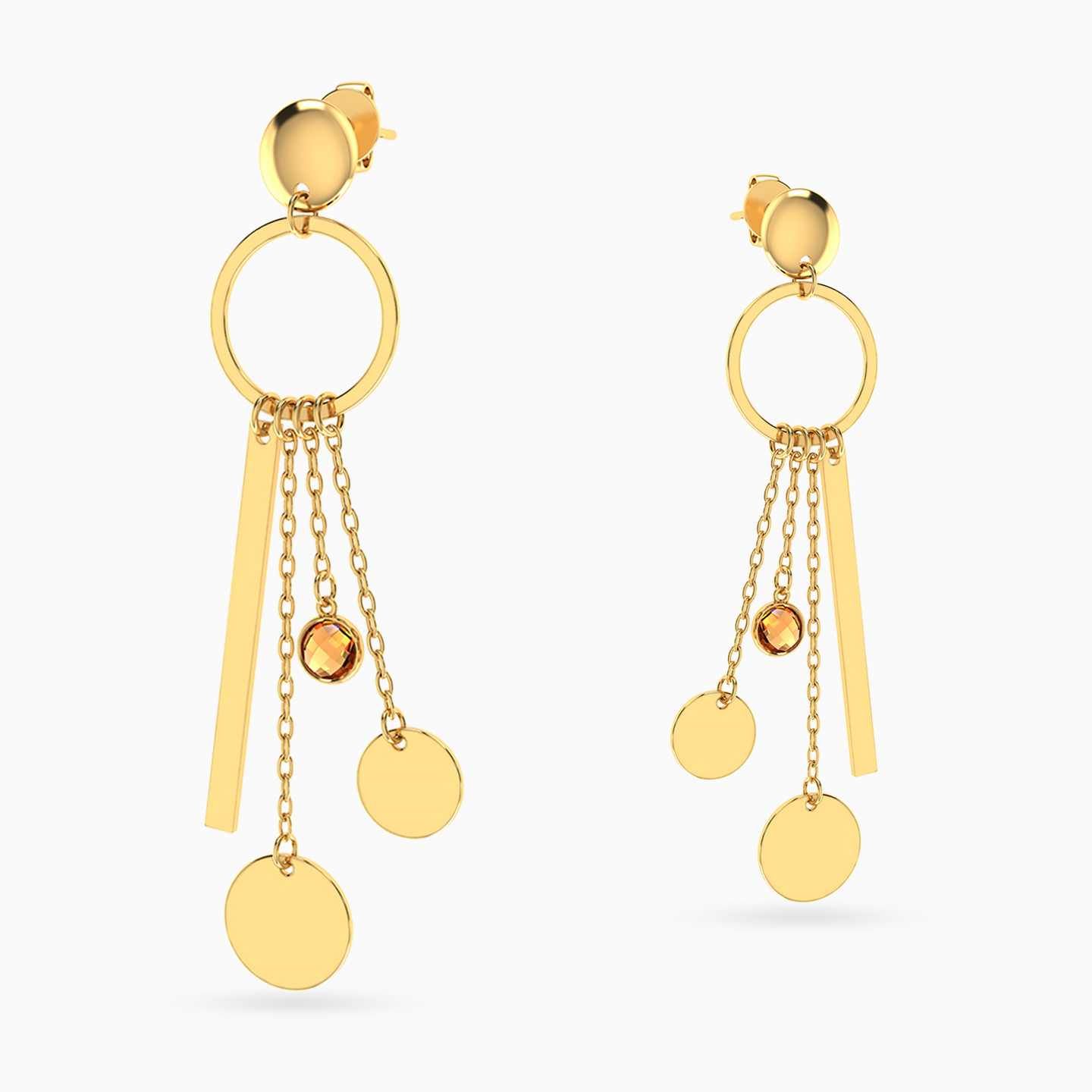 Playful elegance in motion. These Lazurde Gold drop earrings feature a polished circle from which delicate chains, discs, and a warm-toned stone gracefully dangle. A modern design with a lively spirit, perfect for adding personality to your look or gifting with style.