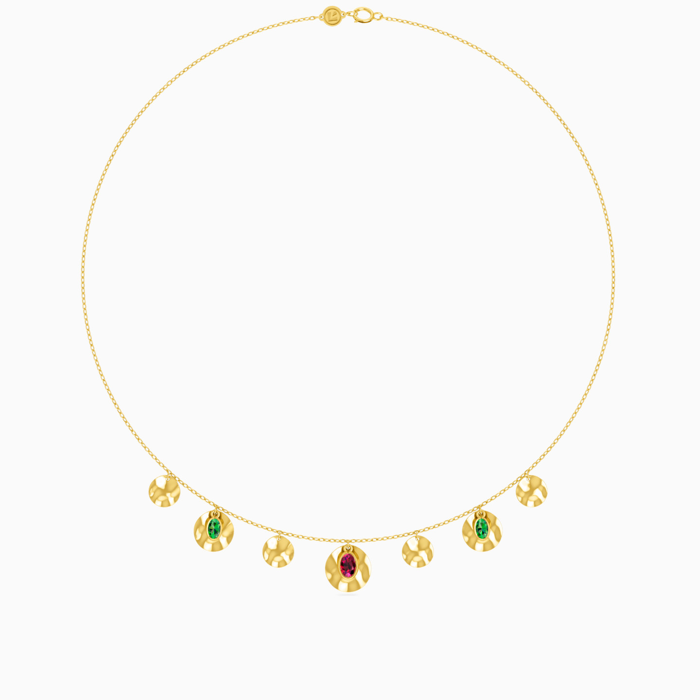 Wear a masterpiece with this artistic creation from Instyle! This stunning 18K yellow gold necklace features a series of round textured charms, each adorned with a smaller oval-shaped charm set with an oval-shaped colored stone. The contrast between the textured gold and the luminous stones creates a captivating harmony of elegance and artistry. A perfect blend of movement, color, and sophistication, this necklace is a timeless statement piece that adds a refined yet playful touch to any look.