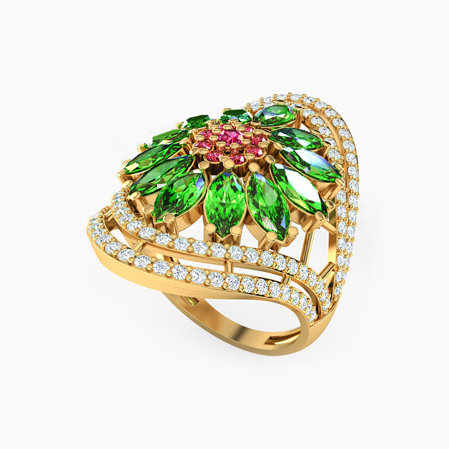 It's amazing how a single accessory can have such a dramatic presence. This jaw-dropping colored stone ring from L'azurde Gold owes its beauty to the eye-catching emerald green and fuchsia colored stone flower with dazzling zirconia accents shining from a beautiful 18-karat yellow gold setting. What a spectacular ring to add a touch of luxurious sparkle and color to every outfit.