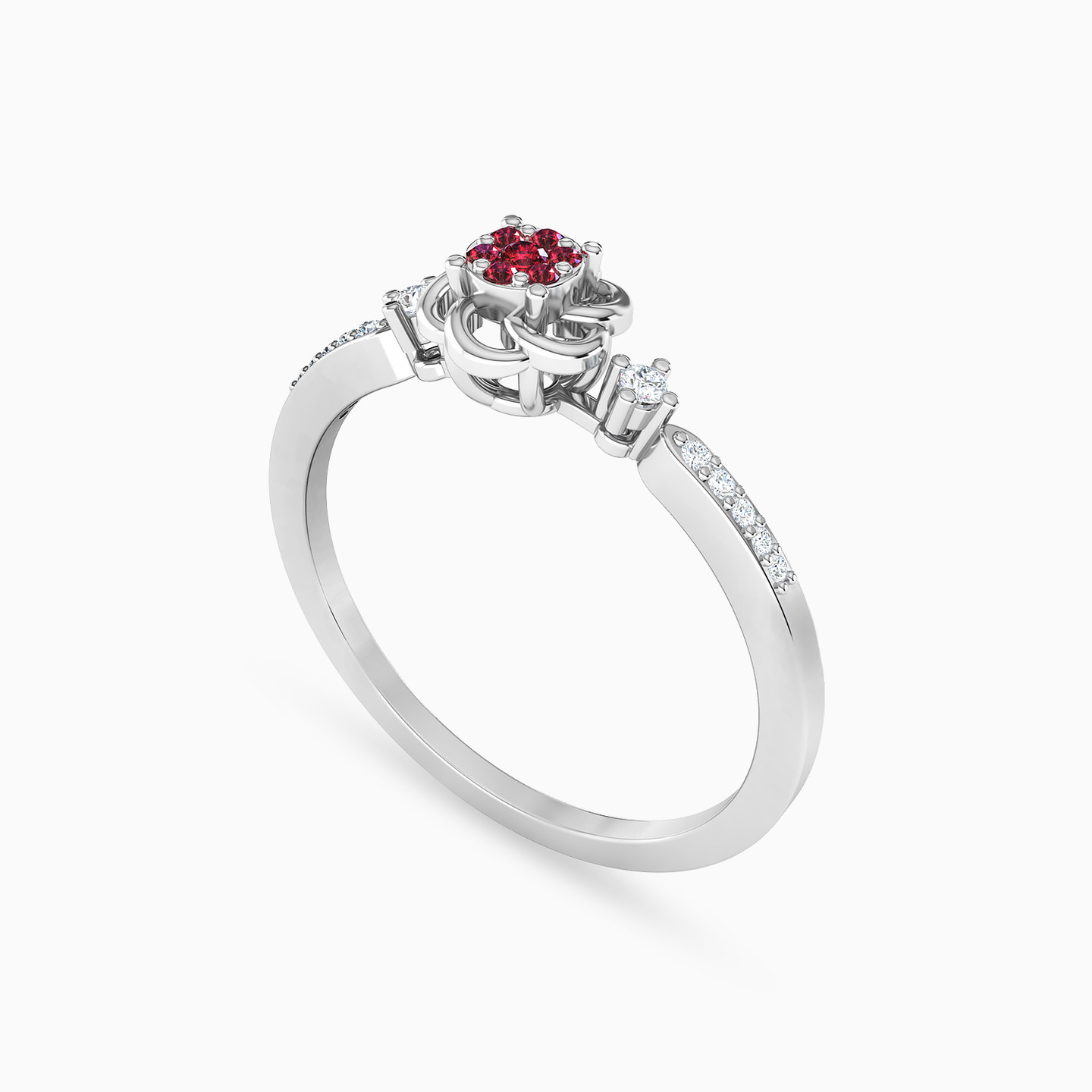 An exquisite and absolutely enhancing 18-karat white gold statement ring from L’azurde Diamonds. Its captivating design showcases a breathtaking flower motif crafted from interconnected threads of white gold. The center of the flower is adorned with dazzling round-shaped red colored stones, while the surrounding petals glisten with the radiance of 0.13-carat brilliant-cut diamonds, illuminating the sleek band. Prepare to be enchanted by the beauty of this extraordinary piece.