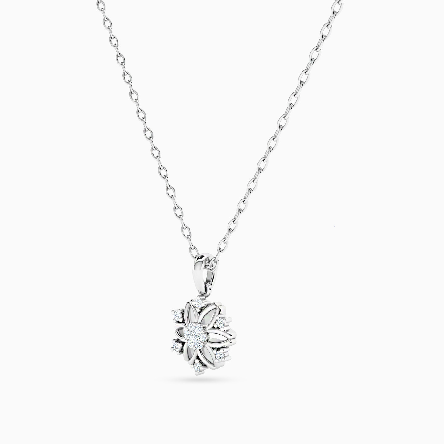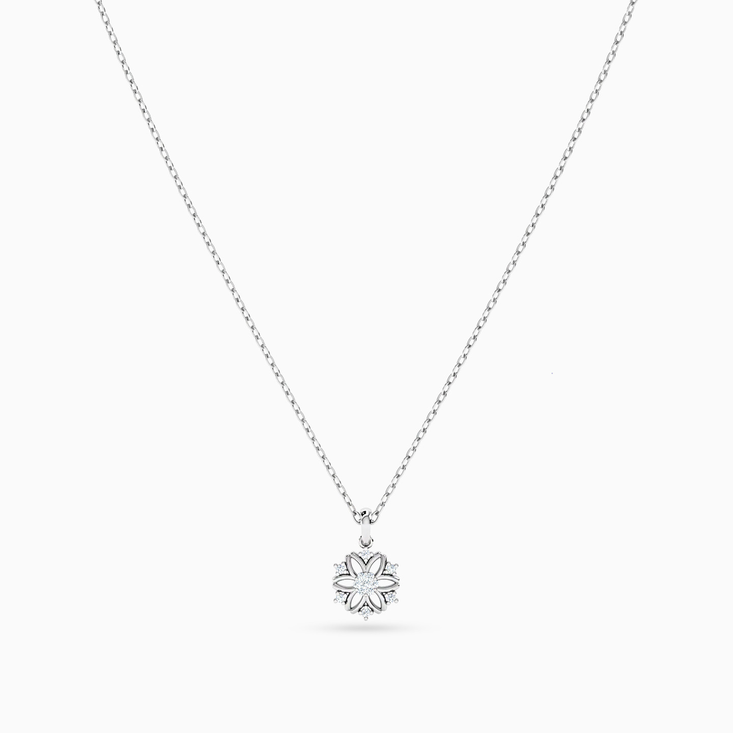 This 18-karat white gold pendant necklace by L'azurde Diamonds is our attempt to capture the beauty and wilderness of a wildflower. It features an eye-catching wildflower pendant with a diamond-studded core and shiny petals crafted with precision. The dazzling 0.08-carat brilliant cut diamond set on three prongs on each of the petals makes this pendant sparkle from every angle. A beautiful pick for any occasion.