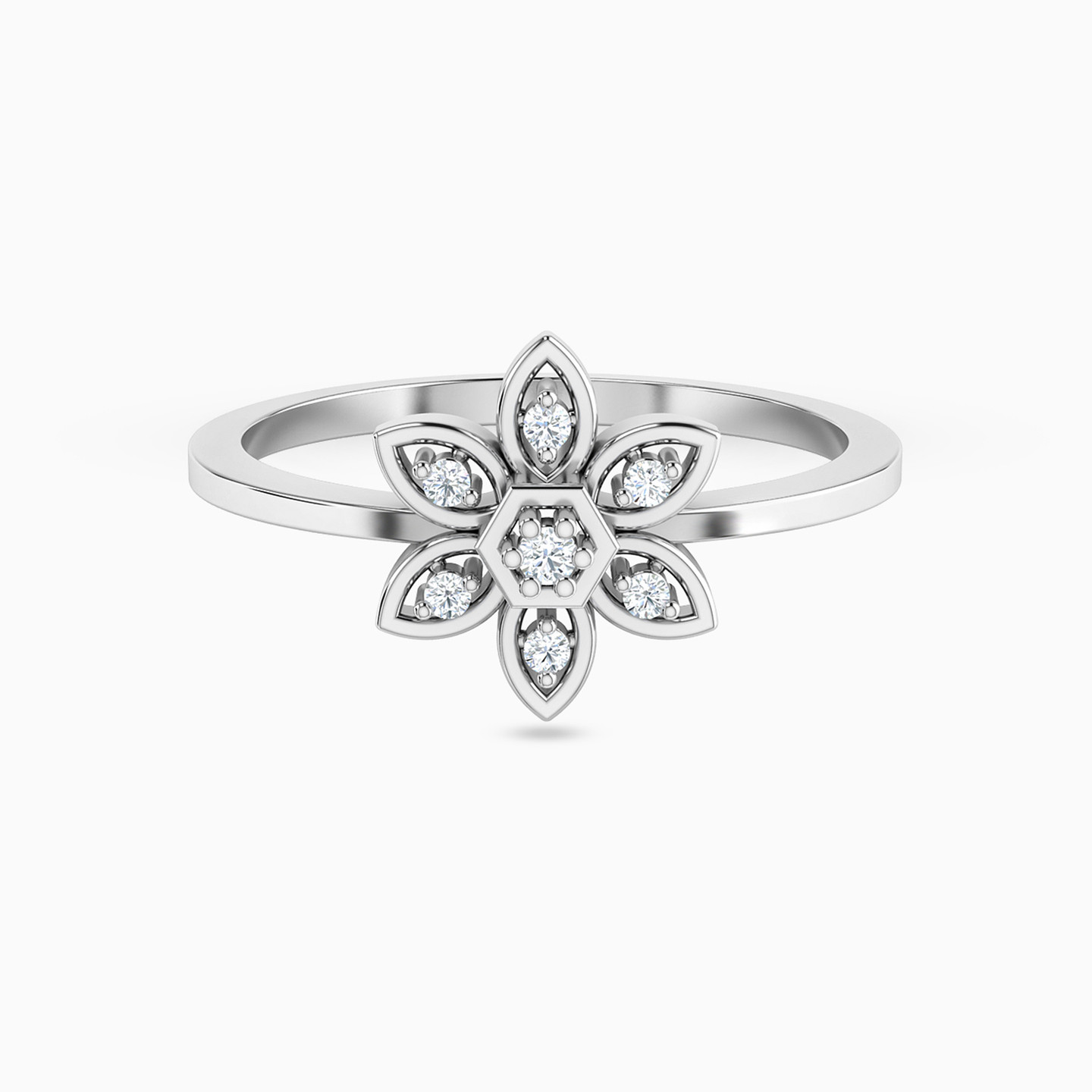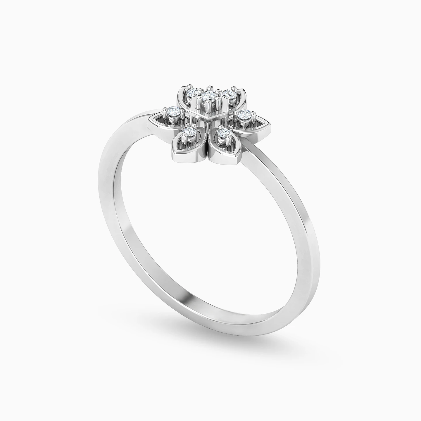 Utter classiness lies in the simplicity of this ring from L'azurde Diamonds. The flower motif that sits to the center of the slim 18-karat white gold band is studded with brilliant cut diamonds. This piece makes a great gift and will work from day to evening.