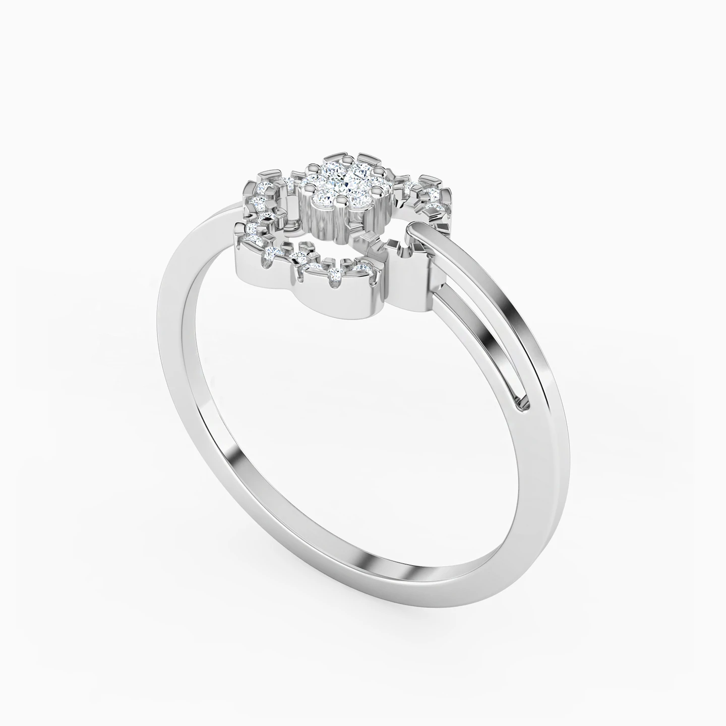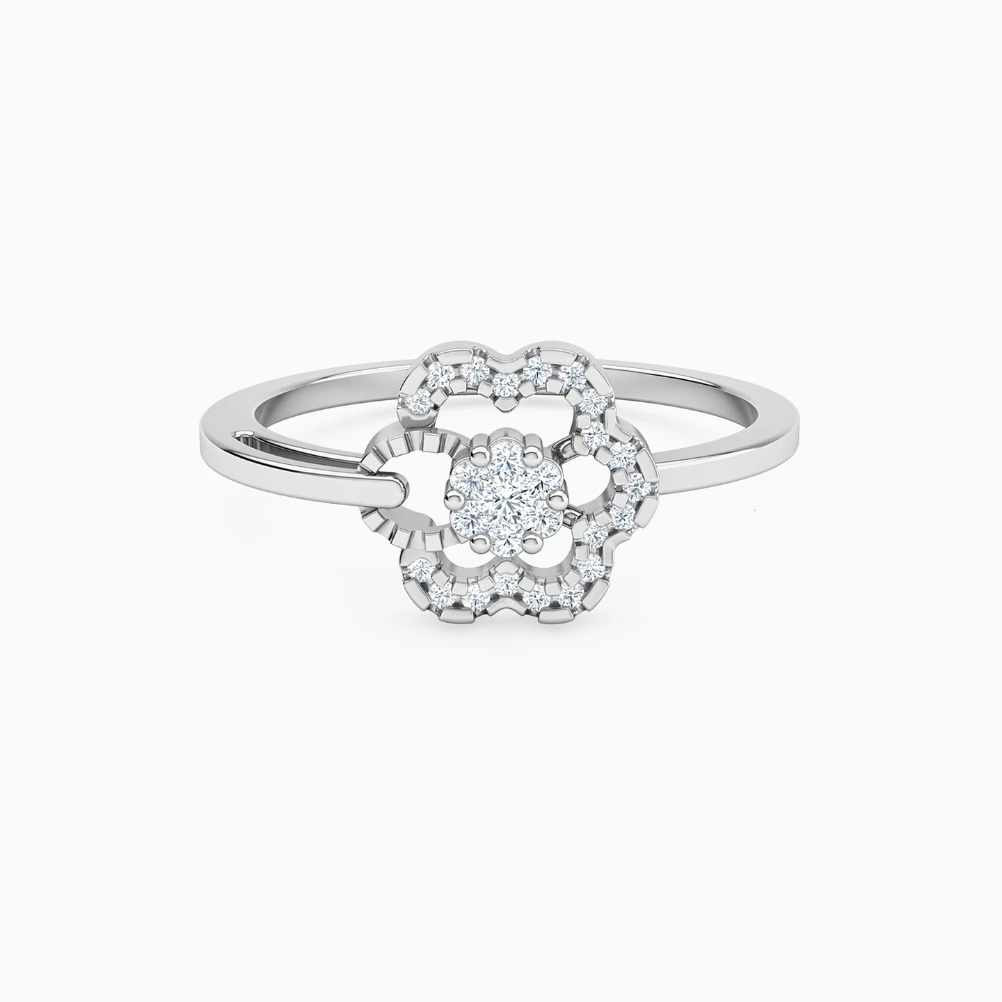 A stunning flower silhouette creates the most dazzling centerpiece in this statement ring by L'azurde Diamonds. It features 0.11-carat brilliant cut diamonds lining the frame in a beautiful groove-like design with just one petal featuring a lovely ribbed texture - this unique touch gives this ring an edgy and chic appeal. Crafted from 18-karat white gold, this ring makes the perfect pick for days when you need something different to make you stand out.