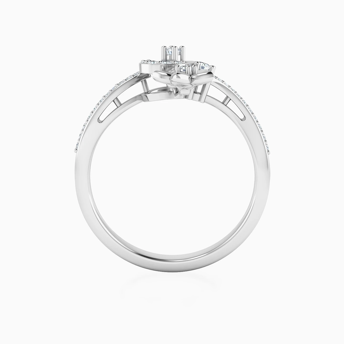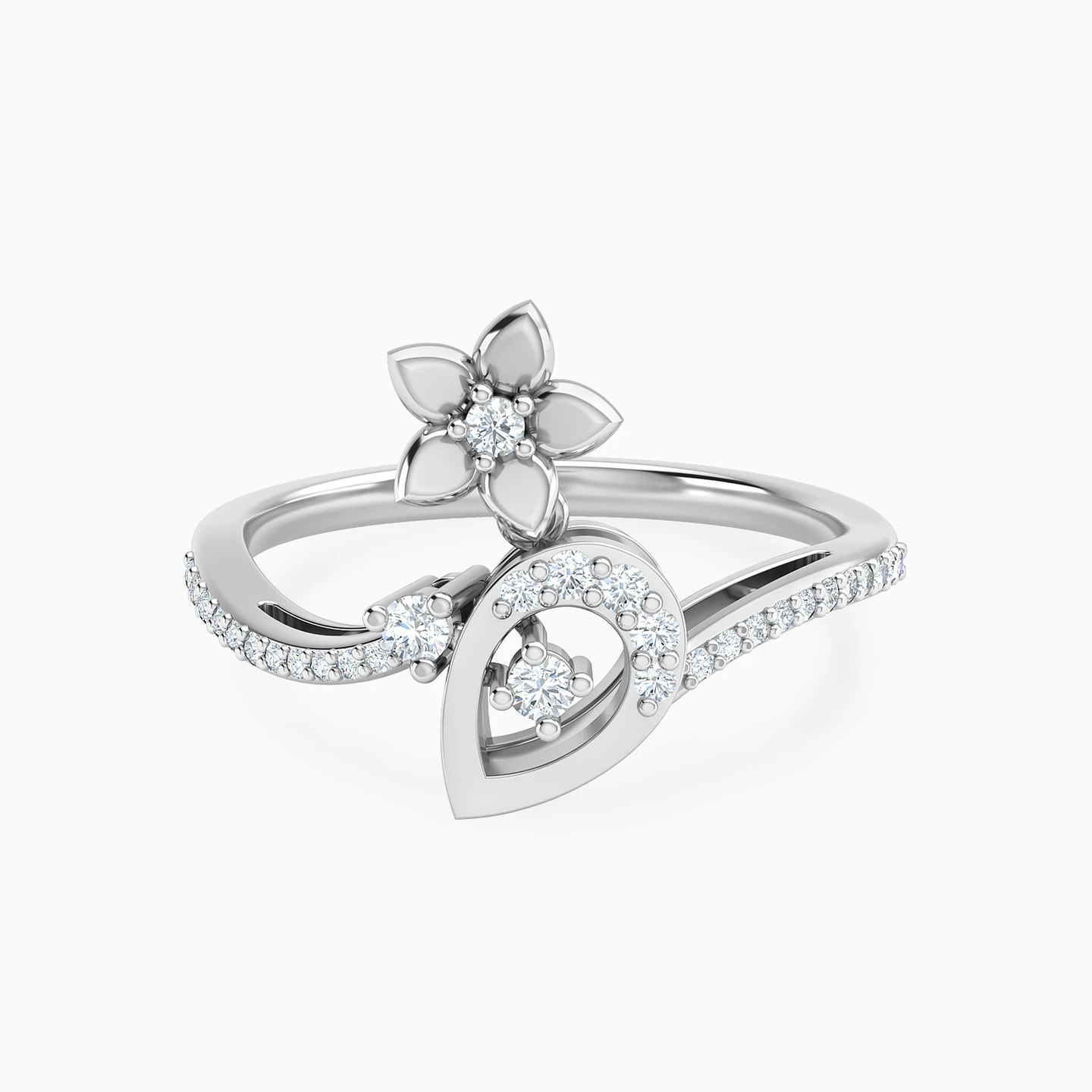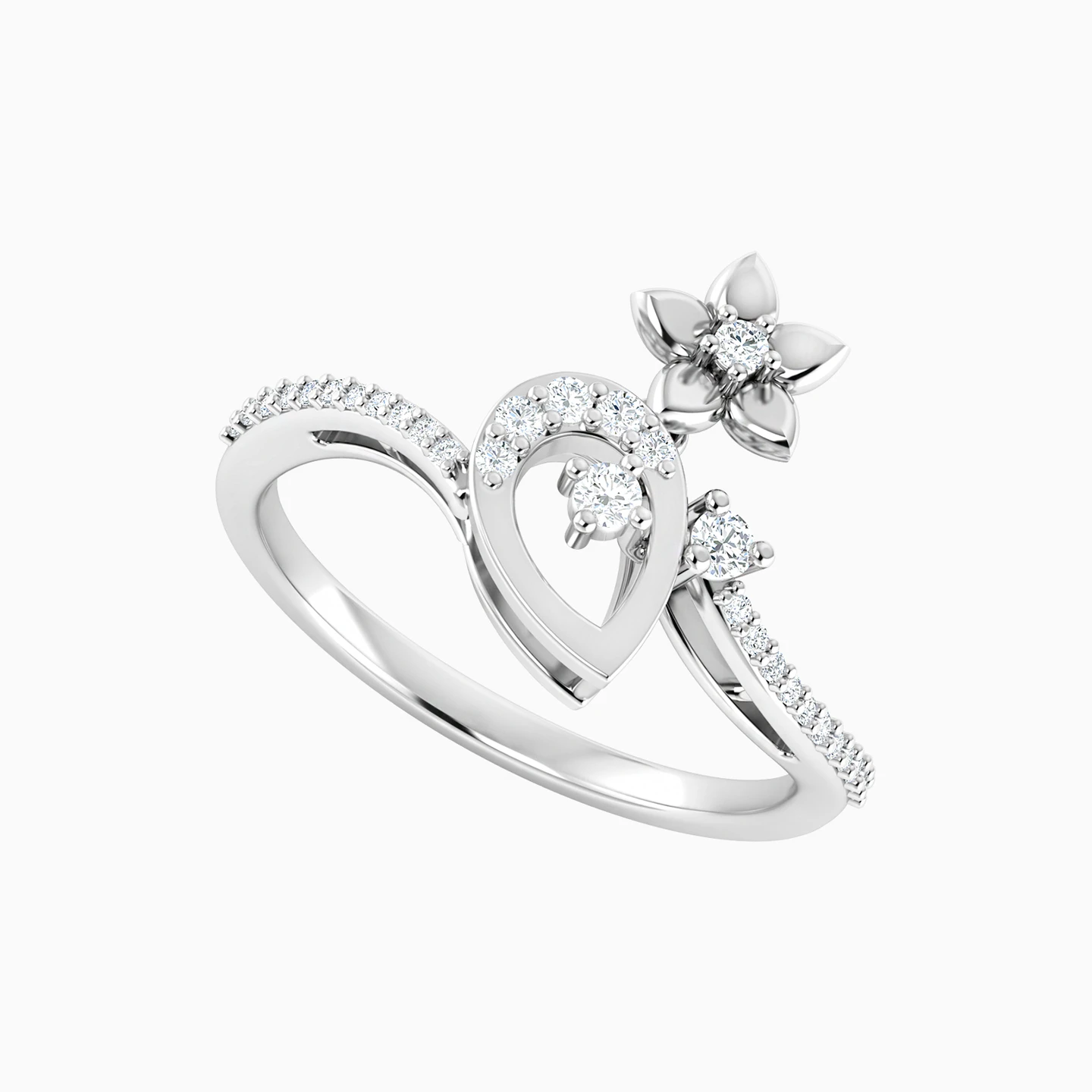 A special piece from L'azurde Diamonds that will make you fall in love all over again! A sleek diamond-studded band with soft curves and a gorgeous teardrop-shaped centerpiece comes in an 18-karat white gold body. But the icing on the cake is the most beautiful and pretty flower sitting perfectly on top of the centerpiece. With this stunner on your finger, you will be a sight to behold.