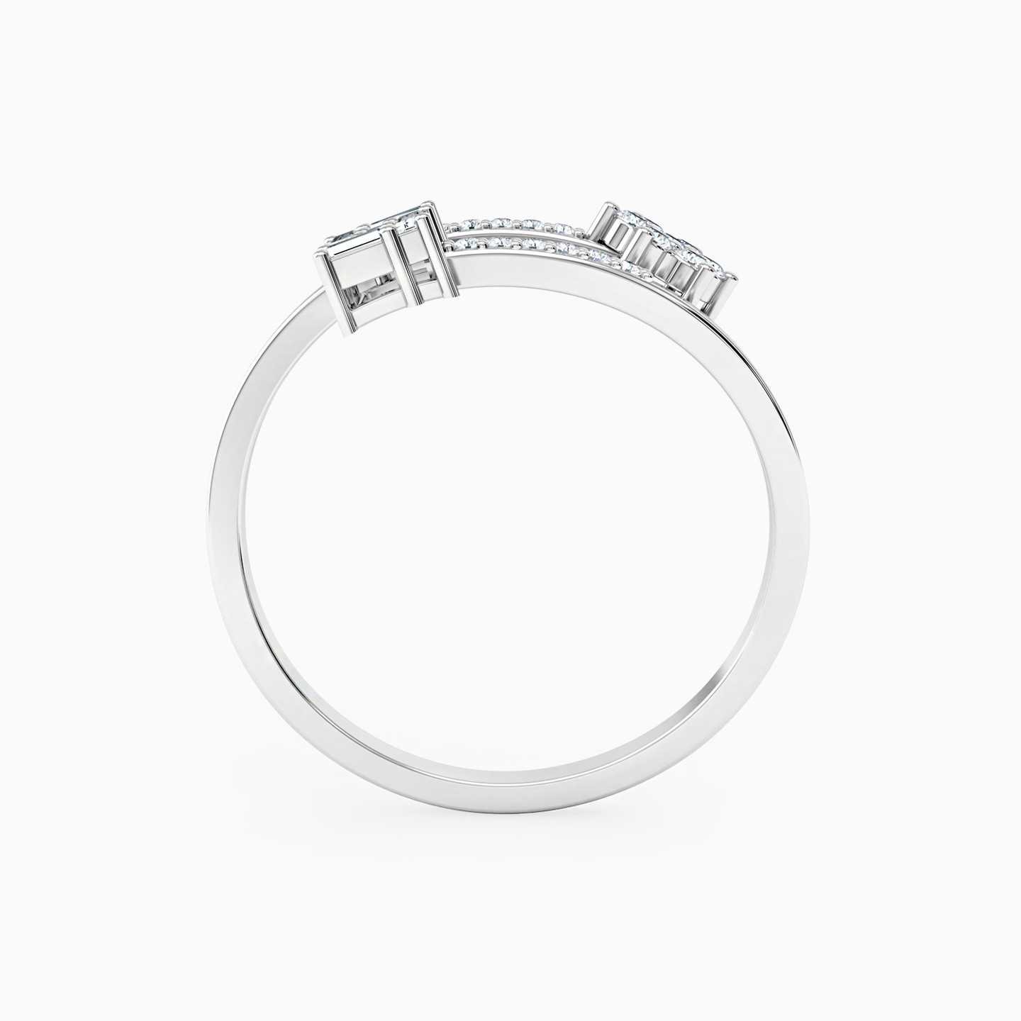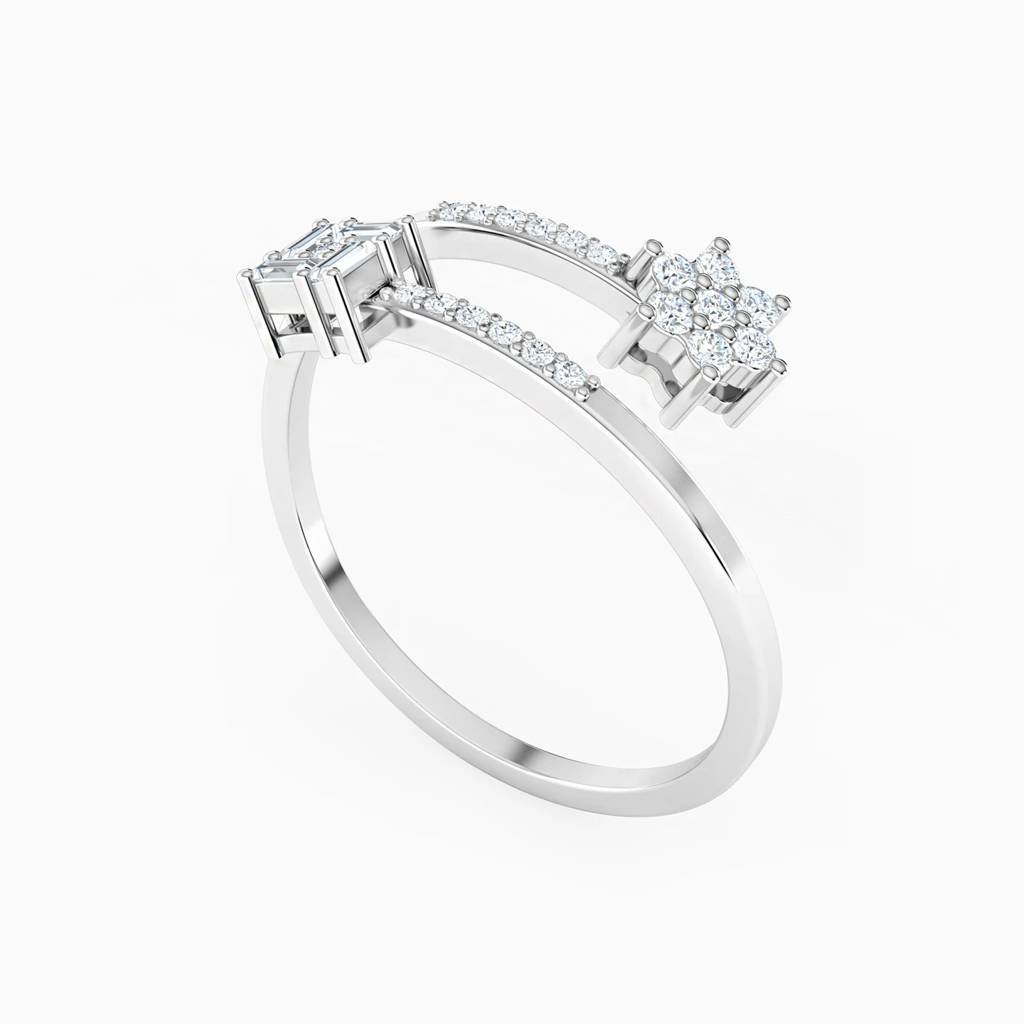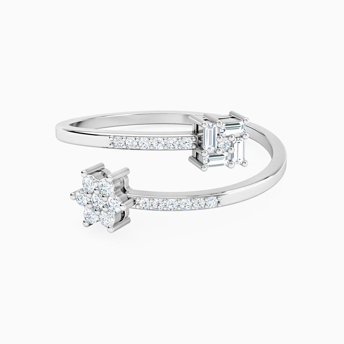 Equal parts classy and equal parts bold! This bypass ring by L'azurde Diamonds features a sparkling flower motif on one head studded with 0.16-carat brilliant cut diamonds and a square-shaped motif studded with baguette-cut diamonds on the other. Wear this 18-karat white gold ring with just about anything in your closet for a sizzling look.