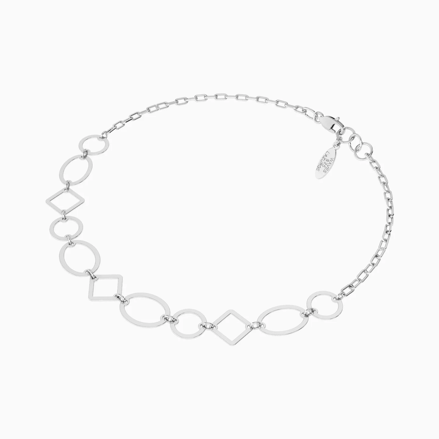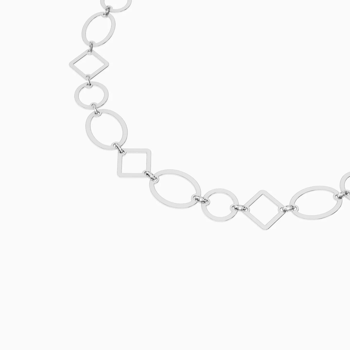 Shapes that move in elegant harmony. This Waves silver chain bracelet from the Equinox Collection features a sequence of geometric loops—rectangle, oval, and round—linked together in a fluid chain that moves with effortless rhythm along the wrist. Modern and expressive, it reflects individuality and confidence—an elegant everyday piece and a thoughtful gift for someone who appreciates distinctive geometric design.