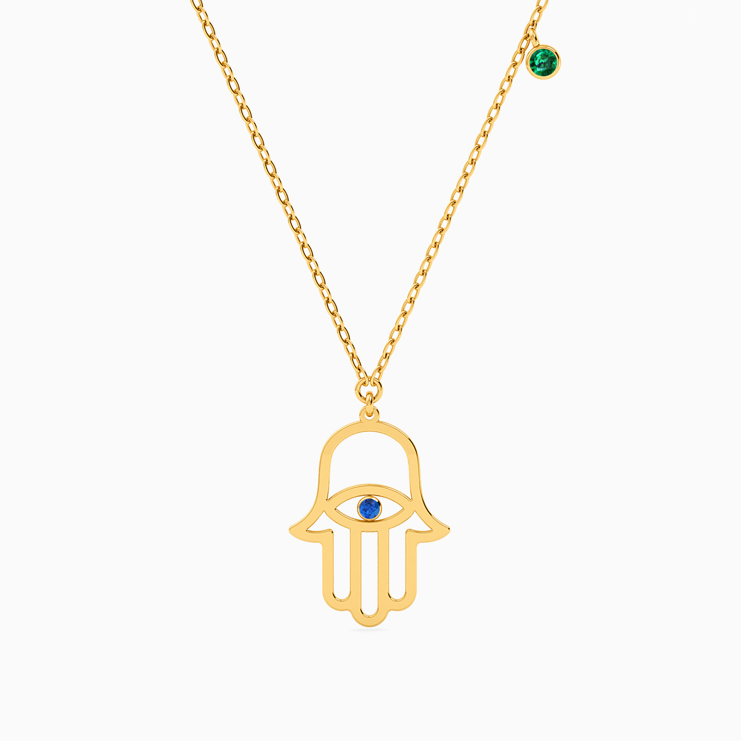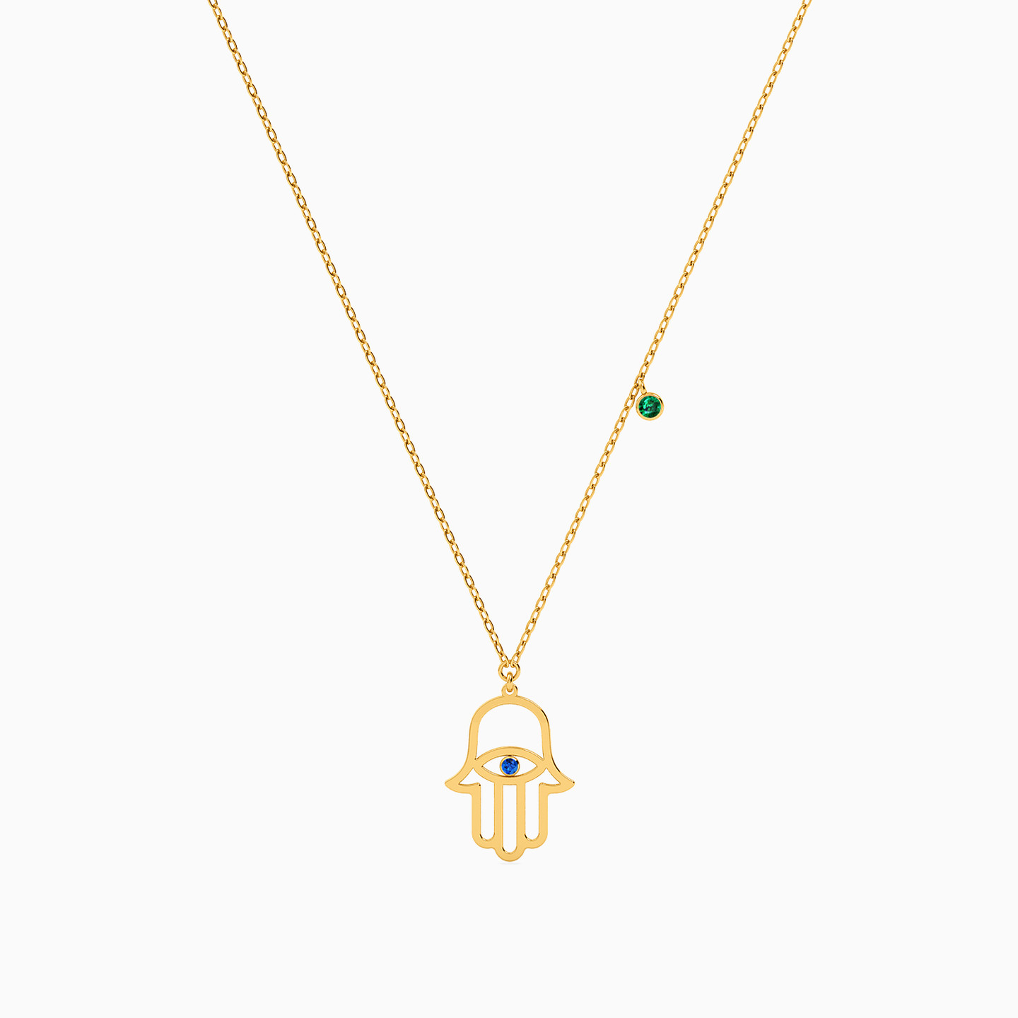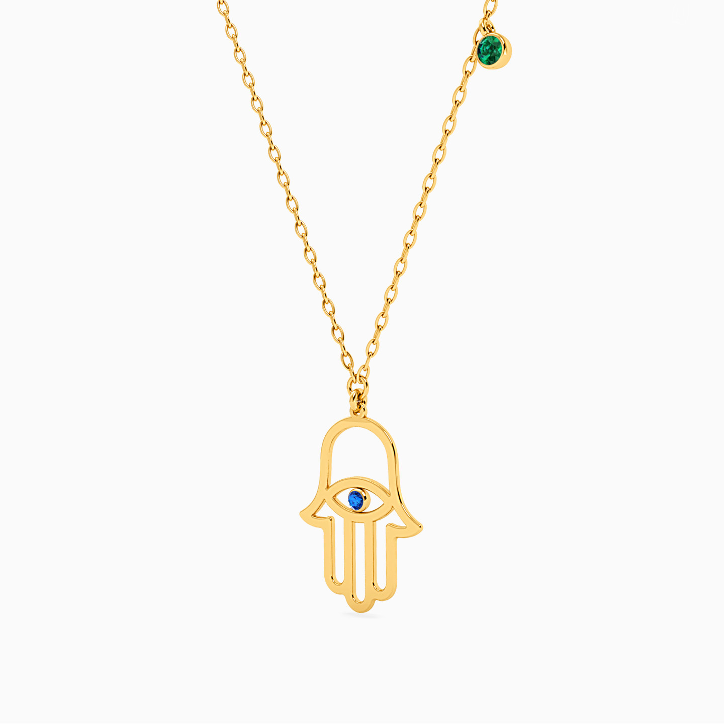 A simple piece often brings out the maximum effect, like this hamsa necklace from L’azurde Instyle. The petite blue stone within the hamsa pendant resembles an eye, while a green stone daintily sits on the 18-karat yellow gold chain. Wear yours over evening wear paired with matching hamsa accessories from our collection.