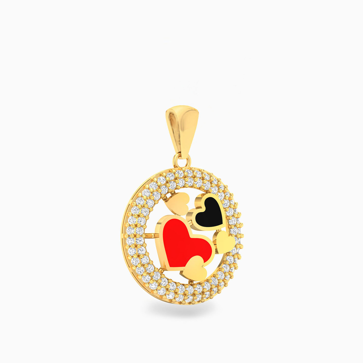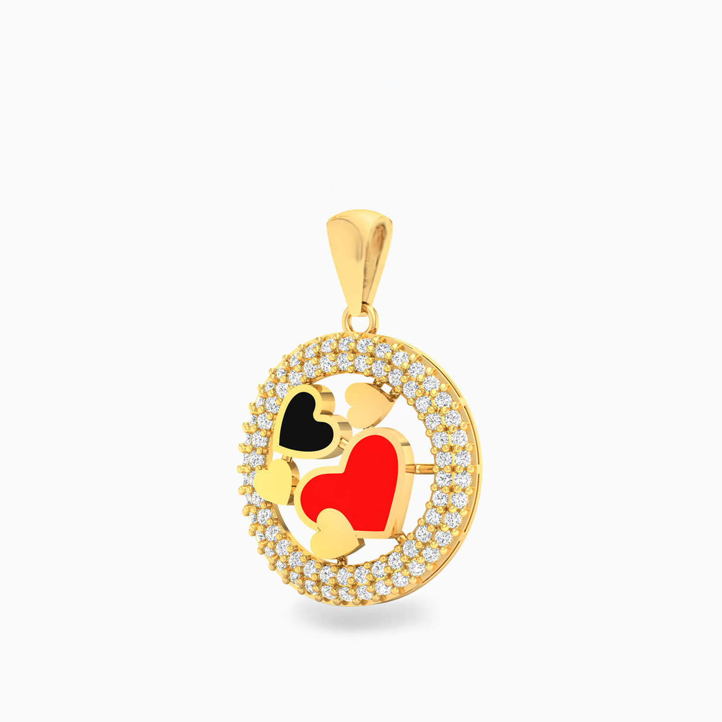 Give your daytime and evening looks a romantic touch by wearing this stylish heart pendant by L'azurde Gold. Cast in 18-karat yellow gold, this chic piece features an open circle frame sparkling with cubic zirconias,with floating colored enamel hearts at its center. We love how charming and elegant this piece is and how easily it can enhance any outfit.