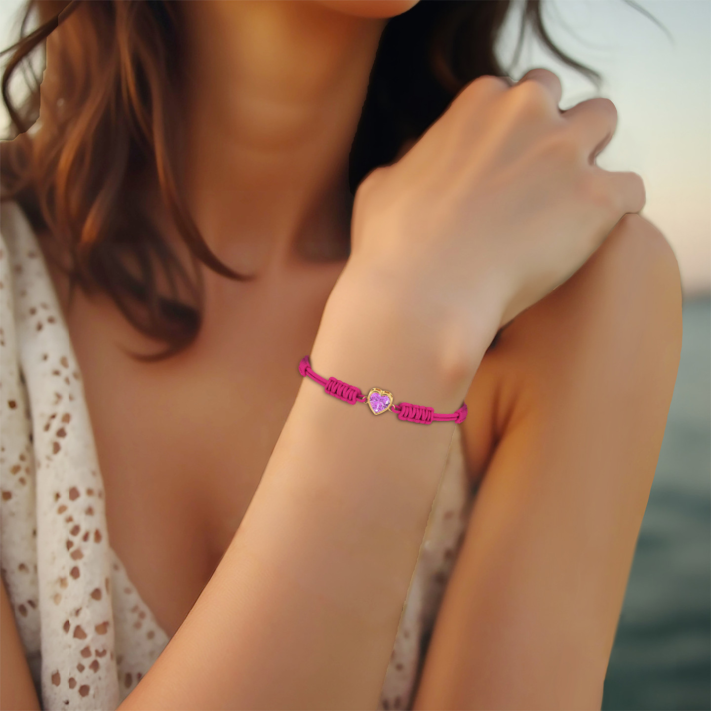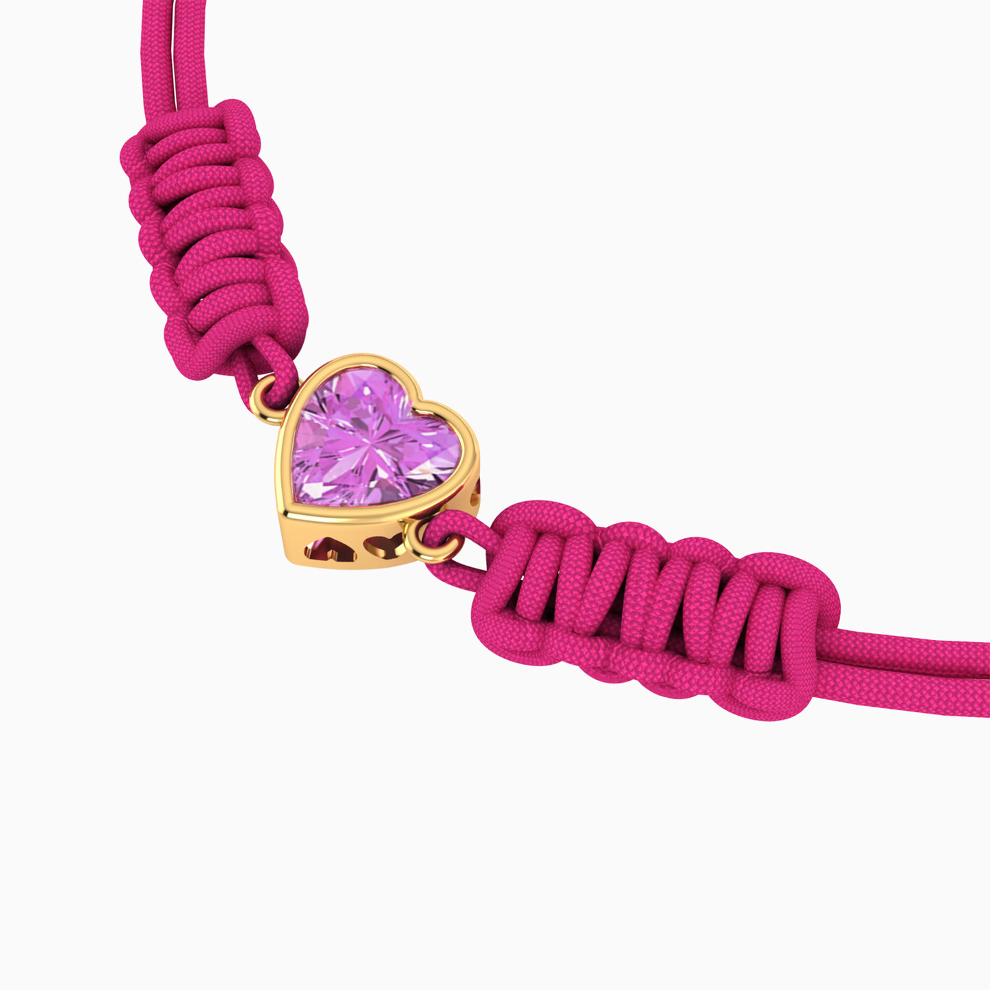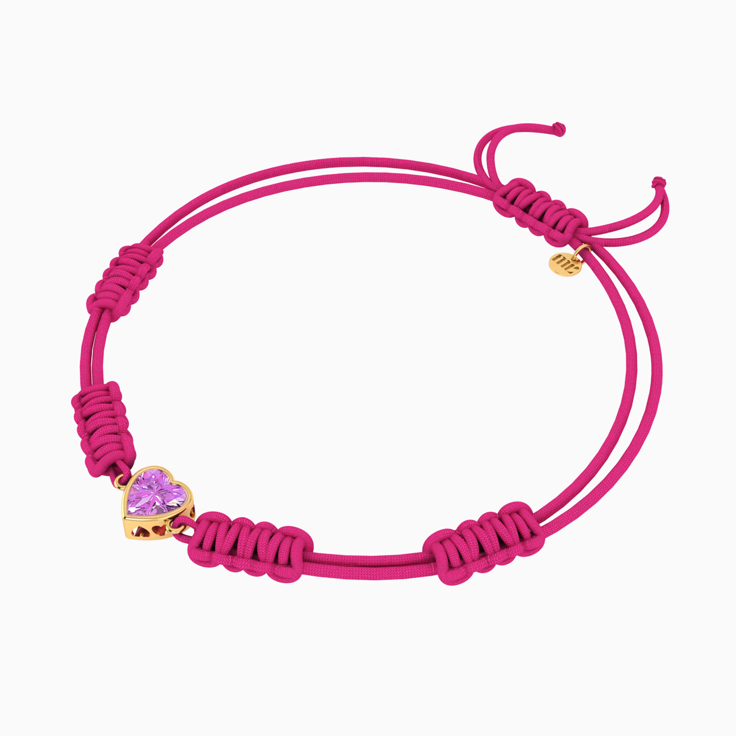 Tie your love with a sparkle. This vibrant Miss L’ bracelet features a bright fuchsia cord and a golden heart charm set with a dazzling pink stone—symbolizing affection, strength, and joyful energy. A playful gift to celebrate friendship or self-love, perfect for adding color and confidence to any day.