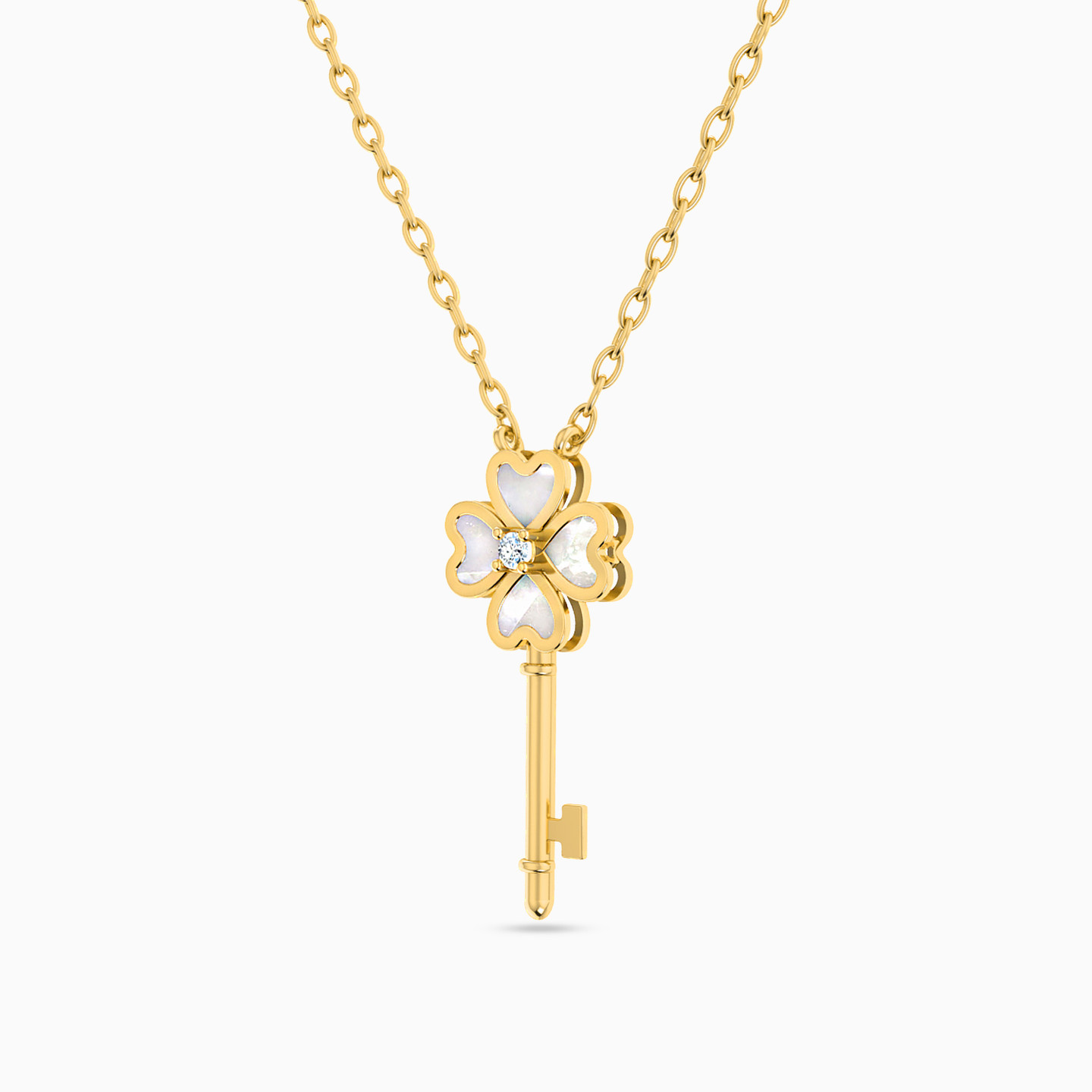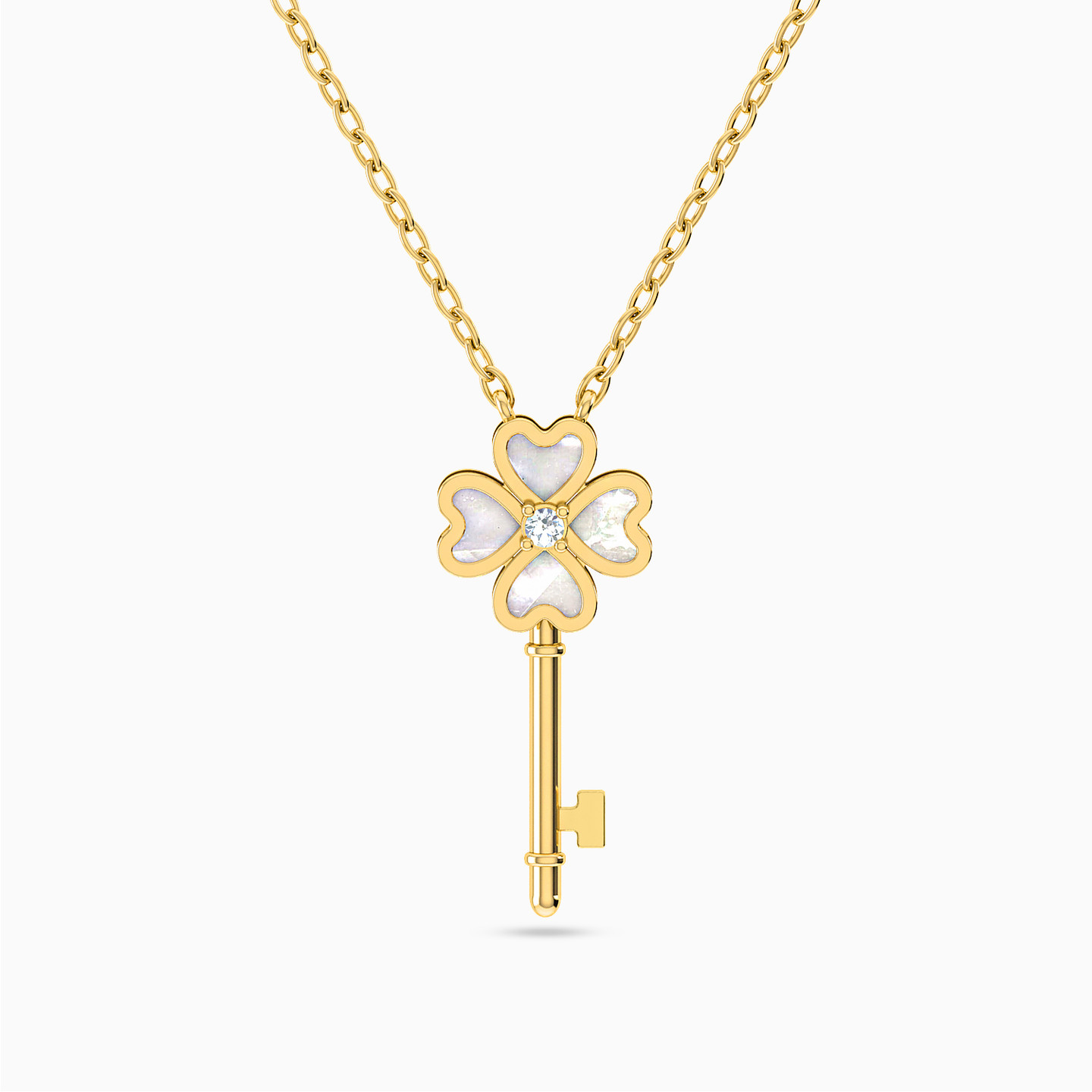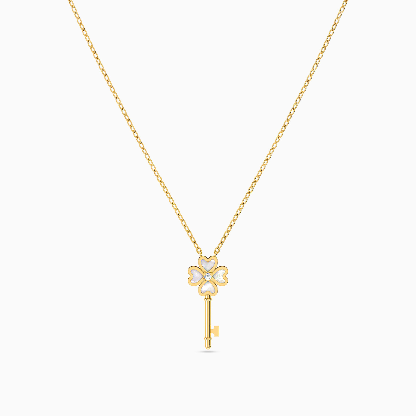We love this key necklace from L’azurde Instyle for its graceful white stone hearts that embellish the pendant in a distinct shape to form a four-leaf clover. Cast in 18-karat yellow gold, this piece will work beautifully over day to evening outfits. Wear yours with petite stone earrings to complete the look.