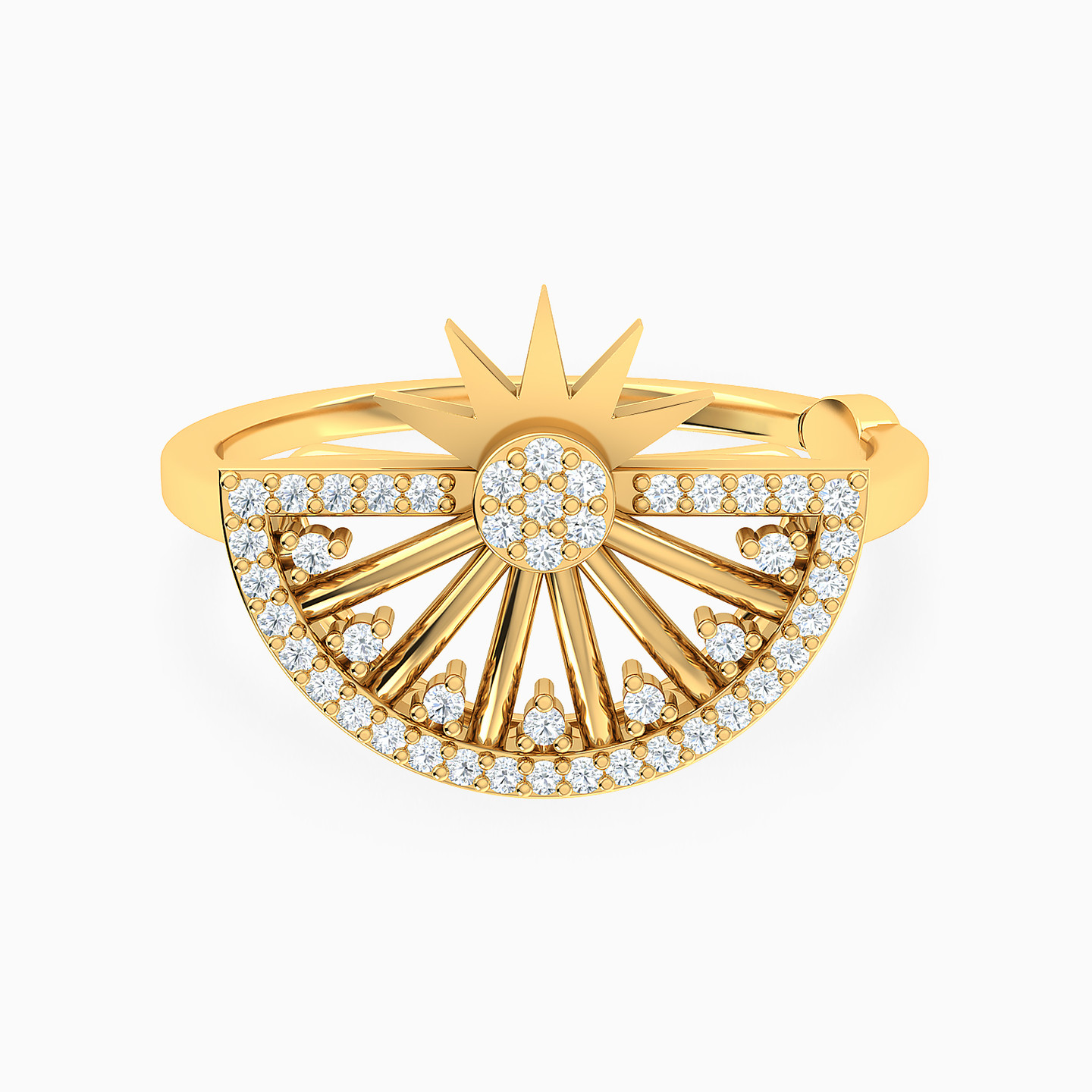 An 18-karat yellow gold ring from L'azurde Diamonds that effortlessly combines modern elegance with a hint of royal charm from Le Soleil Collection ! It features a thin band with a dazzling semi-circular centerpiece framed by brilliant-cut diamonds and adorned with sleek gold bars alternating with prong-set diamonds, while a regal yellow gold crown sits proudly at the top, adding a unique and sophisticated touch. This piece is meant for days when you need to stand out.