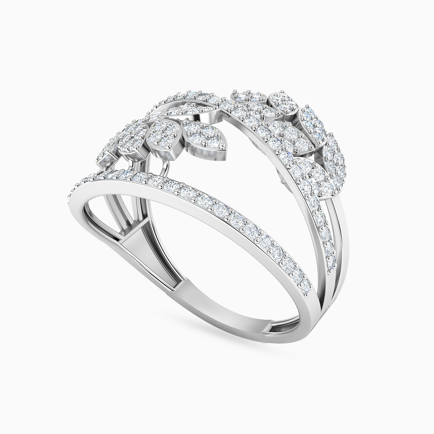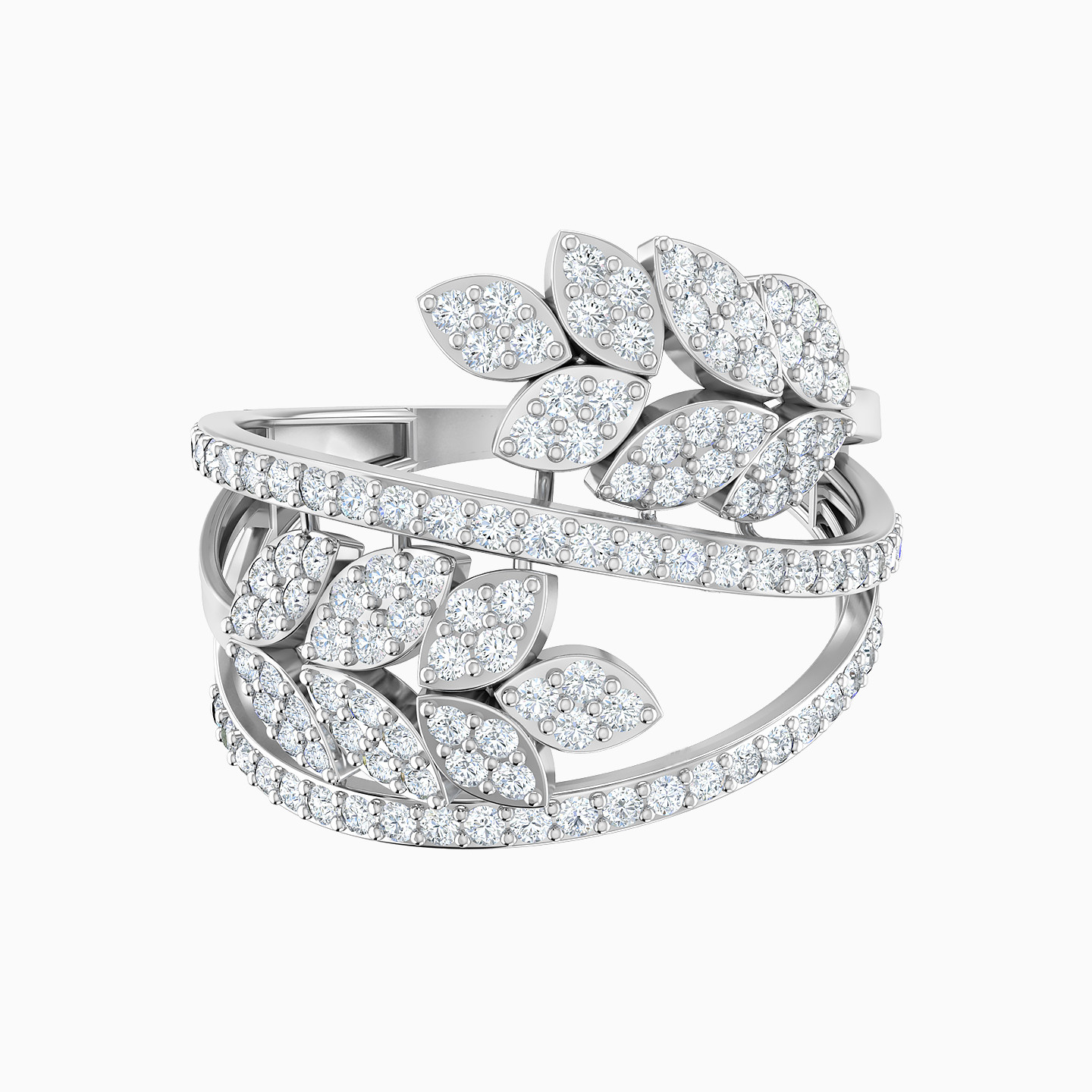Inspired by the beauty and mystery of nature comes this glamorous statement ring by L'azurde Gold. Crafted from 18-karat white gold, it boasts a layered design featuring two swirling rows paved with sparkling cubic zirconia, creating a dazzling and dynamic effect. Nestled in between and on top of these rows are meticulously crafted cubic zirconia-studded leaves, adding a touch of nature’s grace and elegance to this extraordinary piece. Wear this ring when you want to make a bold and glamorous statement wherever you go.