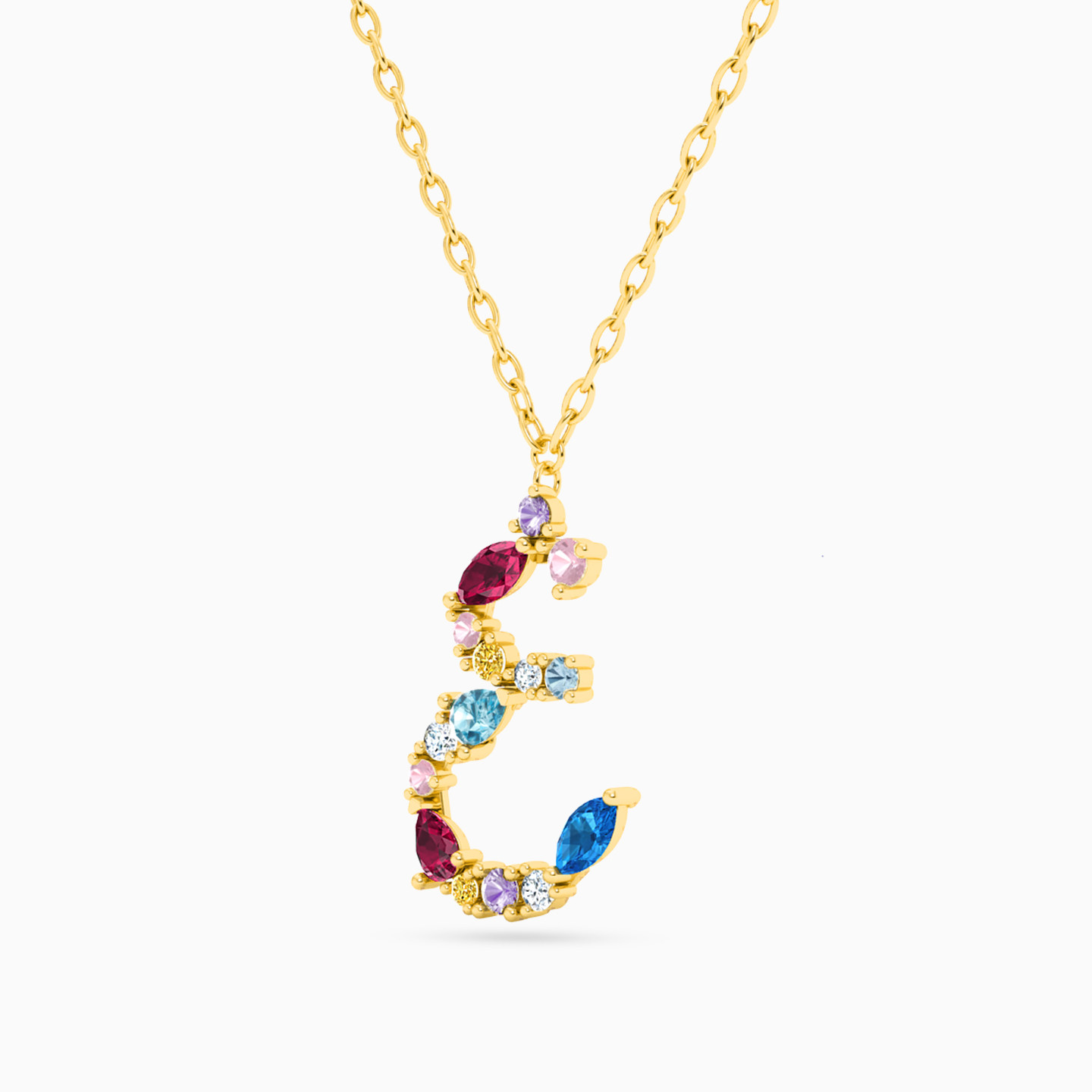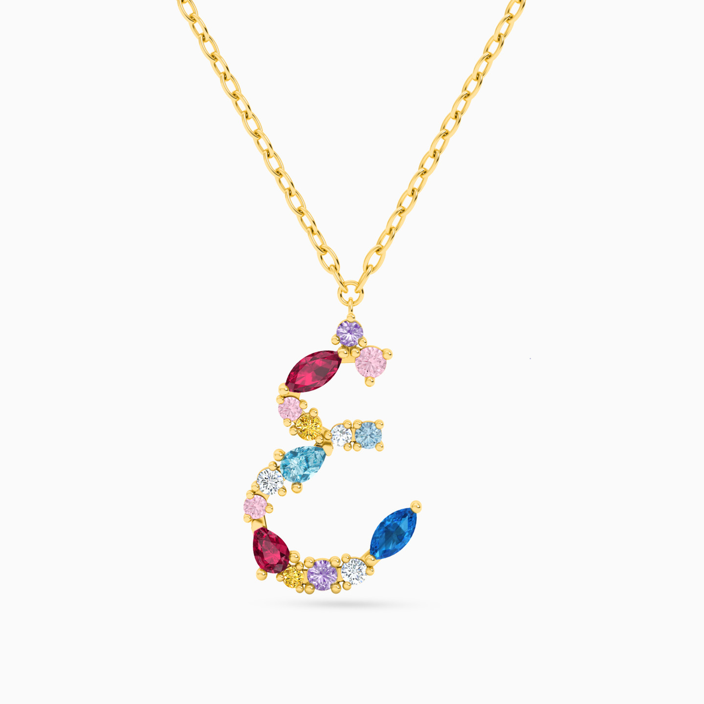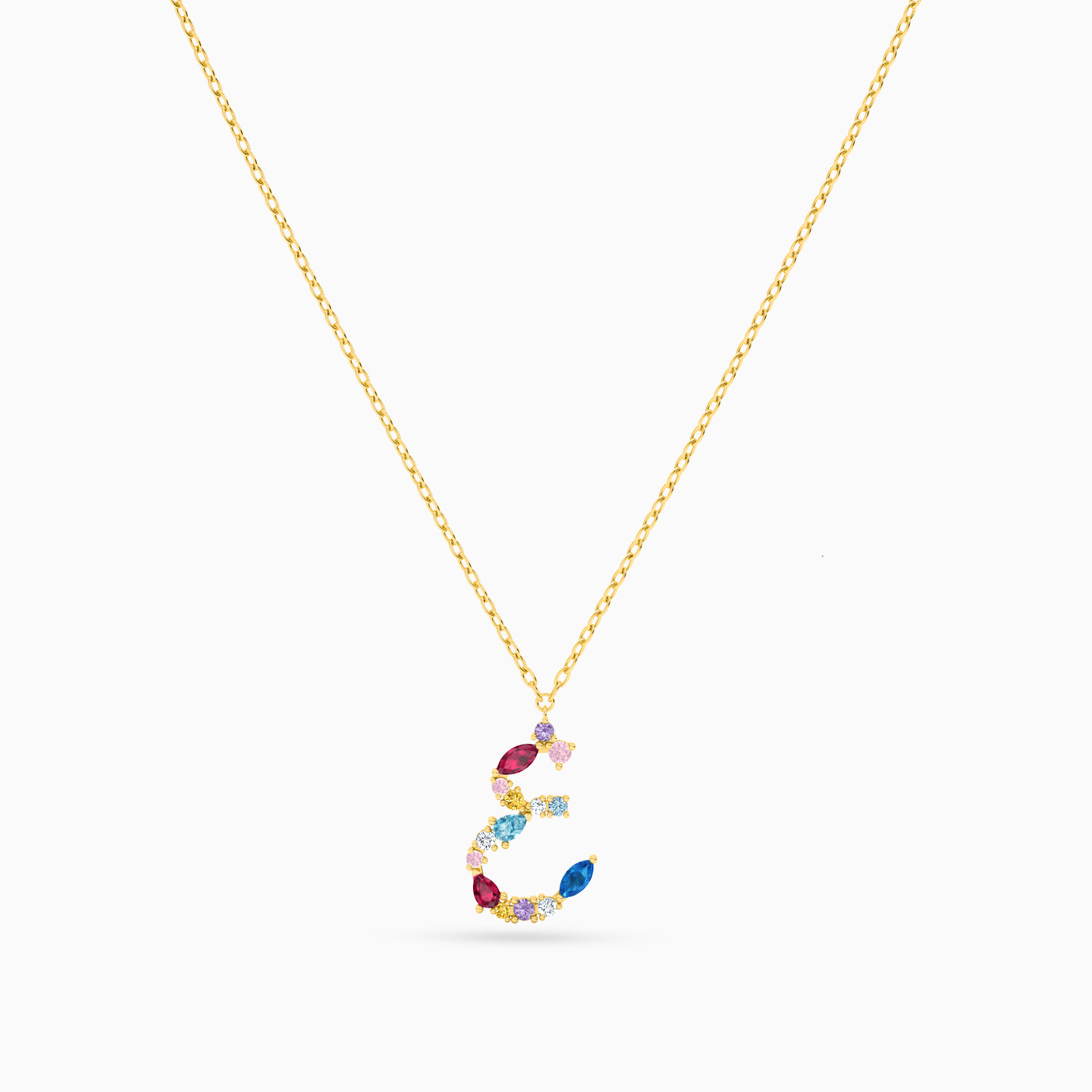 Cut through the clutter with this dazzling Ghayn letter necklace from L’azurde Instyle. It is studded with a bouquet of colored stones in different shapes that shine as you go about your day. The dainty yellow gold chain makes a perfect complement to this piece.