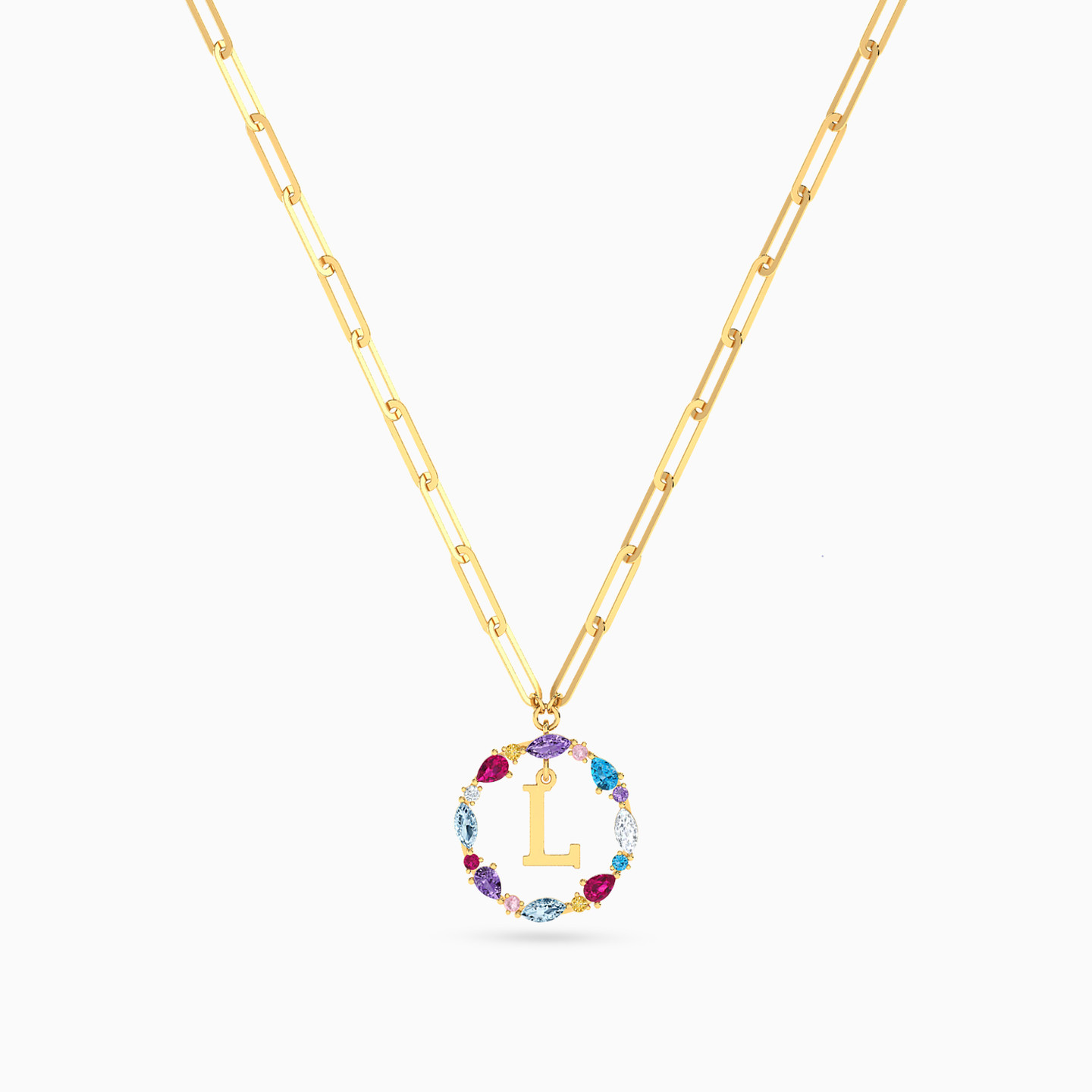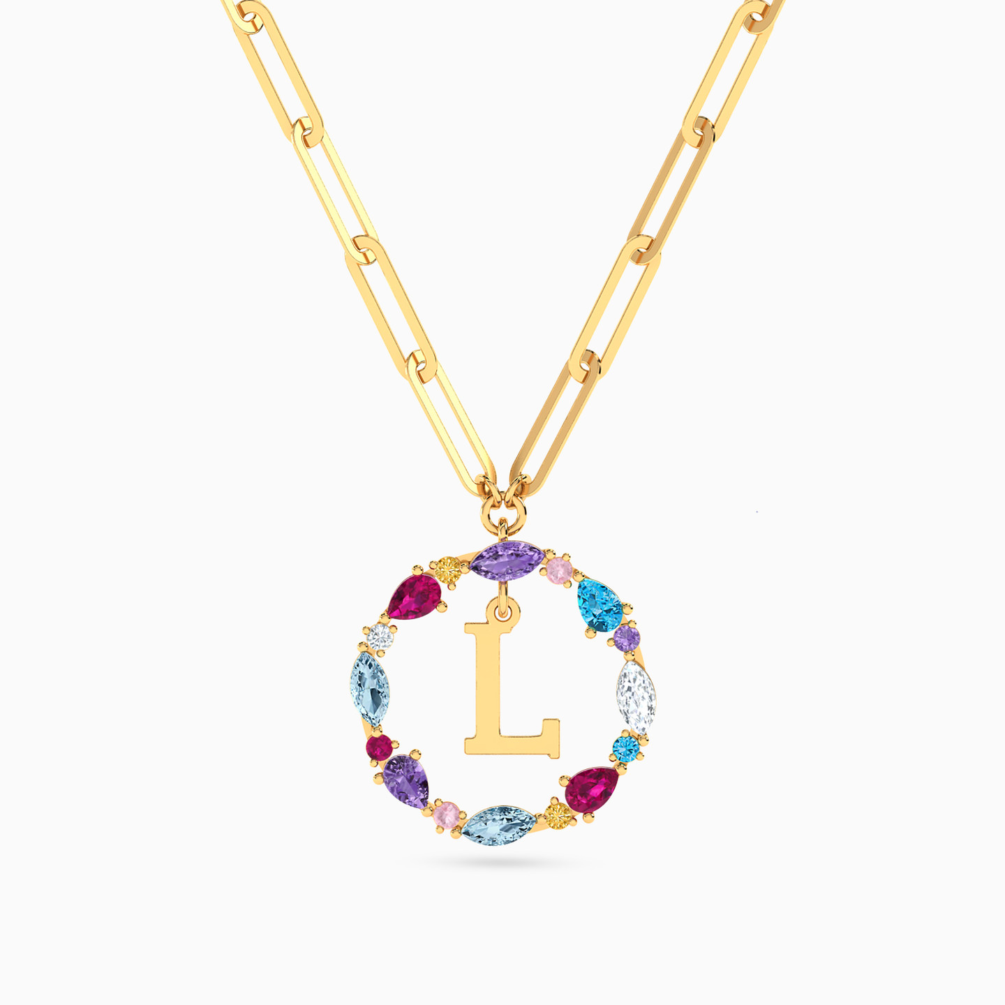 سلسلة ذهب حرف L عيار 18 قيراط مزينة بالأحجار الملونة
