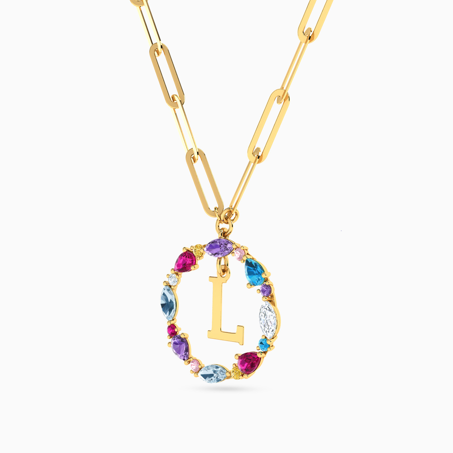 Style your initial with a sparkle when you put on this necklace from L'azurde Instyle. Designed with an L letter to the center and a circle of colored stones all around, this pendant comes suspended from an 18-karat yellow gold link chain. Wear it over a solid white or black dress to allow it to stand out.