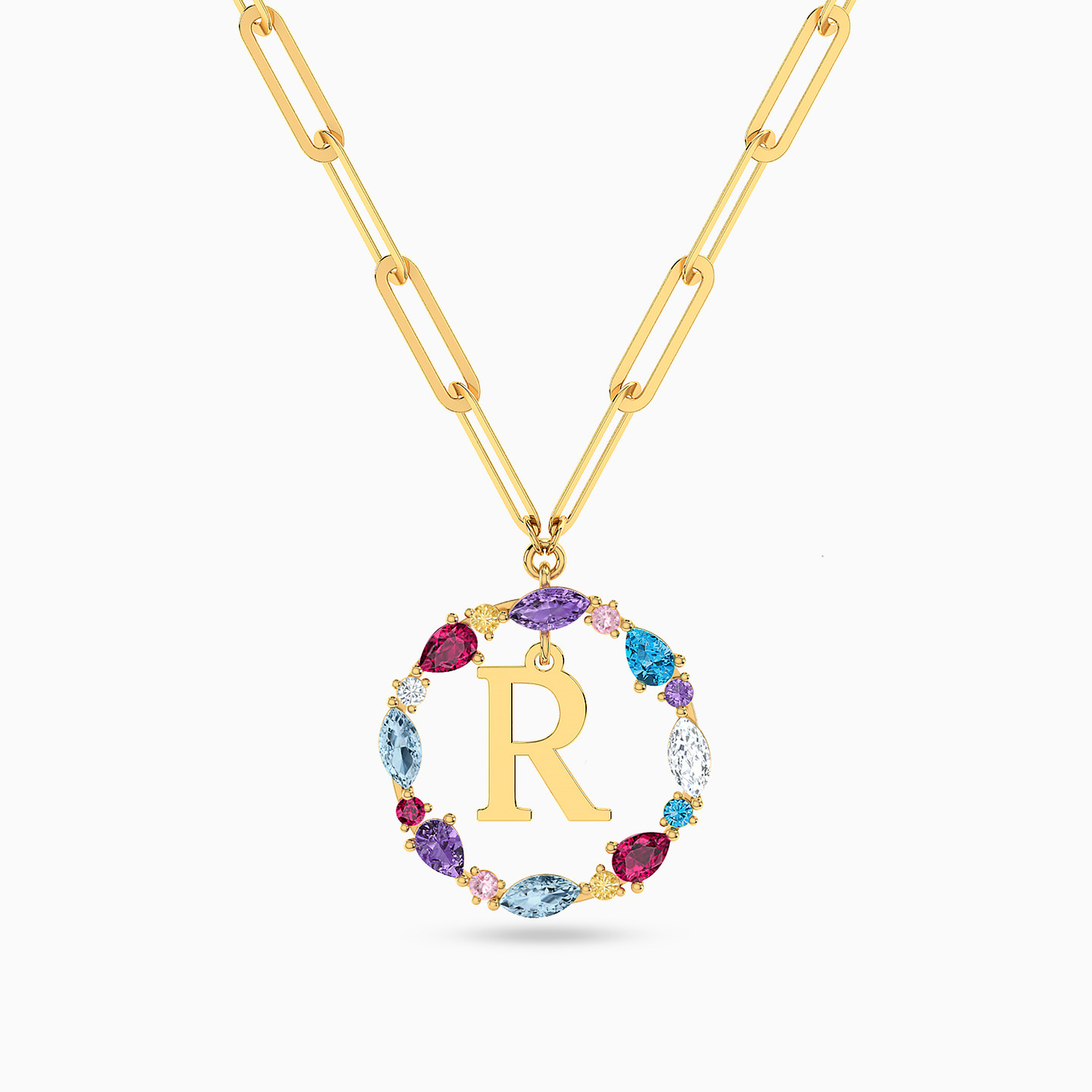 سلسلة ذهب حرف R عيار 18 قيراط مزينة بالأحجار الملونة