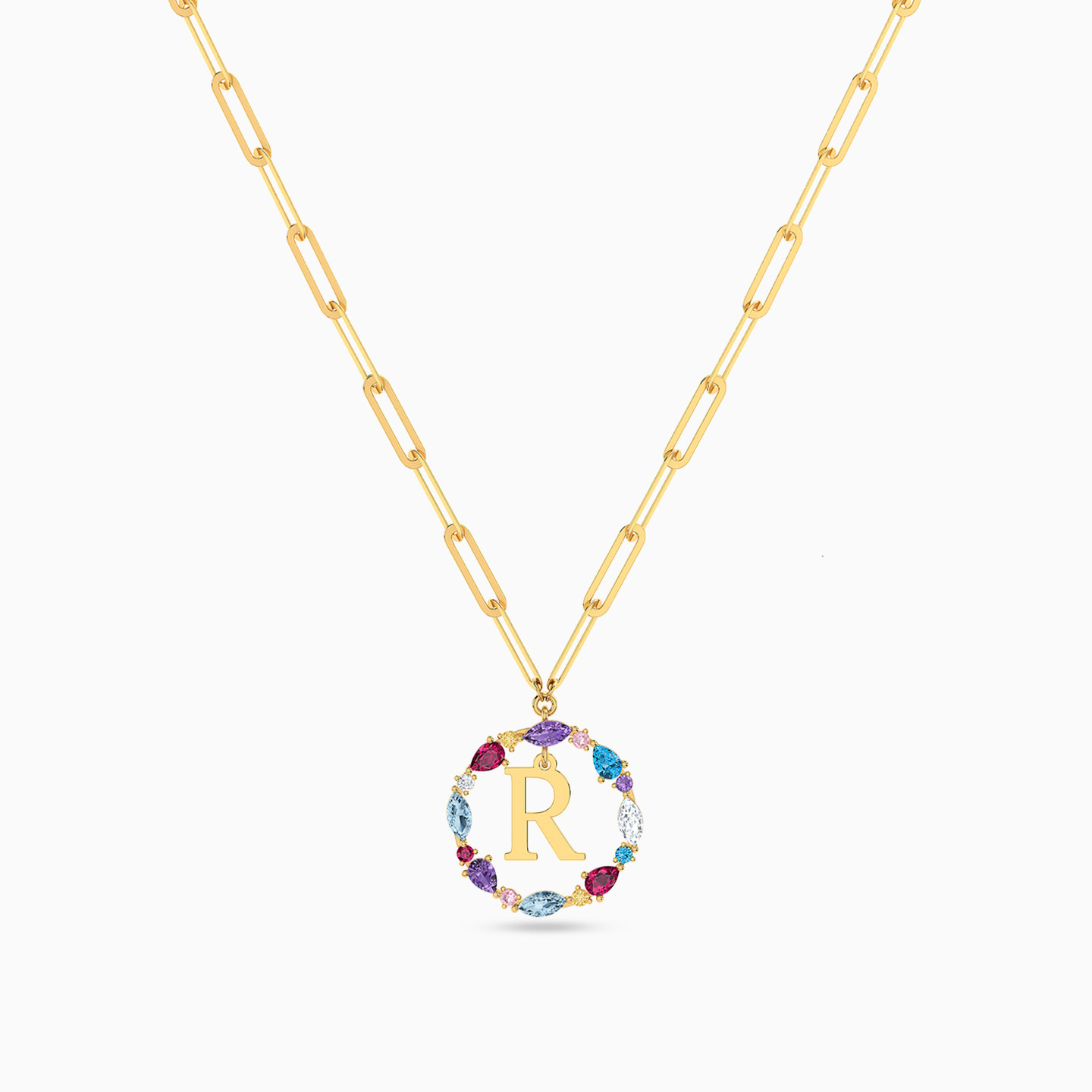 Your name is the only accessory you'll need with this necklace from L'azurde Instyle. We love the R letter pendant that sits in a poised manner amidst the gorgeous circle of colored stones. Suspended from an 18-karat yellow gold link chain, this number will effortlessly transition with you from work to weekend.