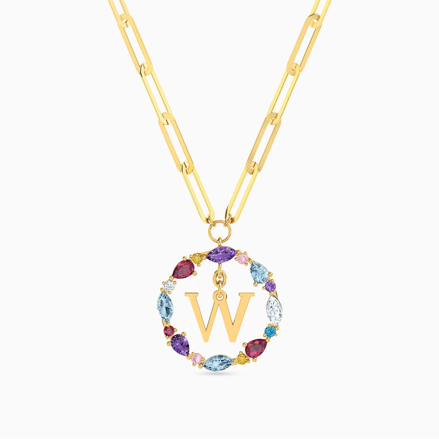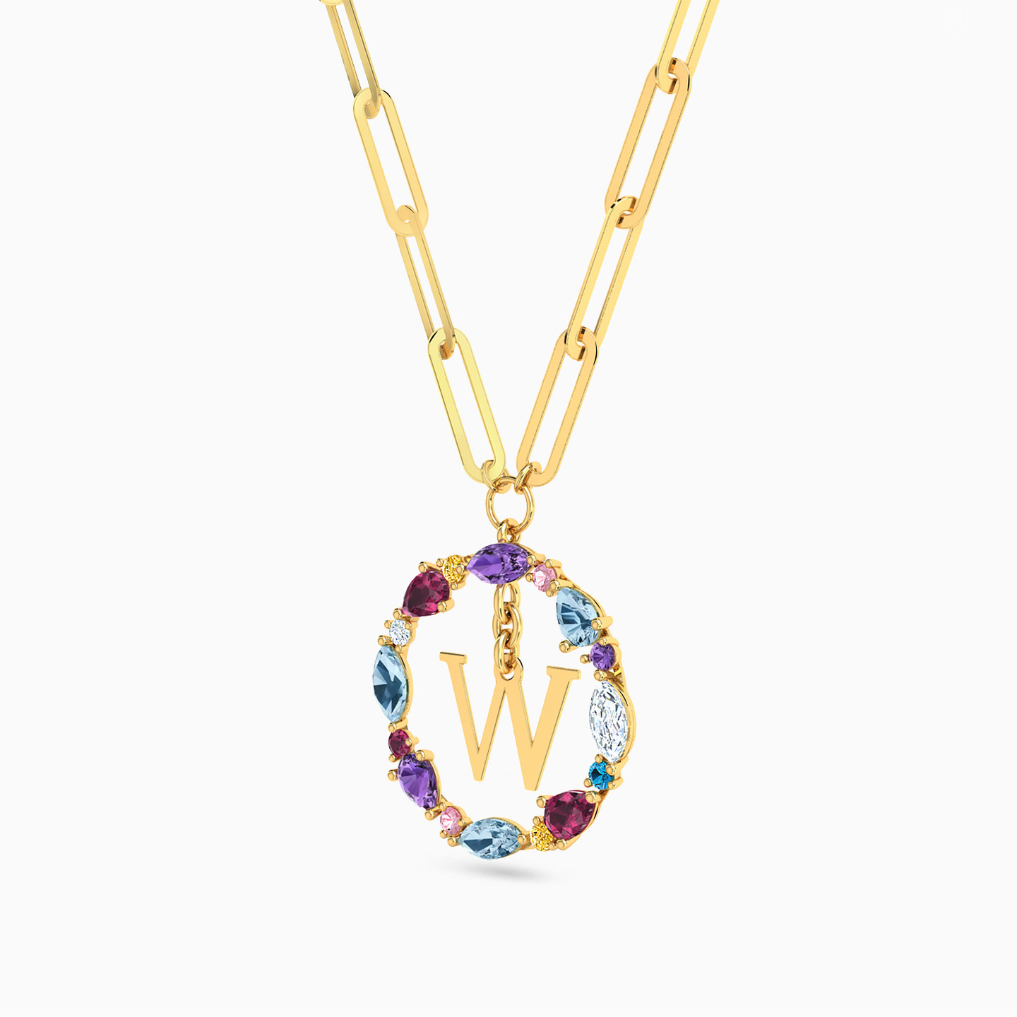 سلسلة ذهب حرف W عيار 18 قيراط مزينة بالأحجار الملونة