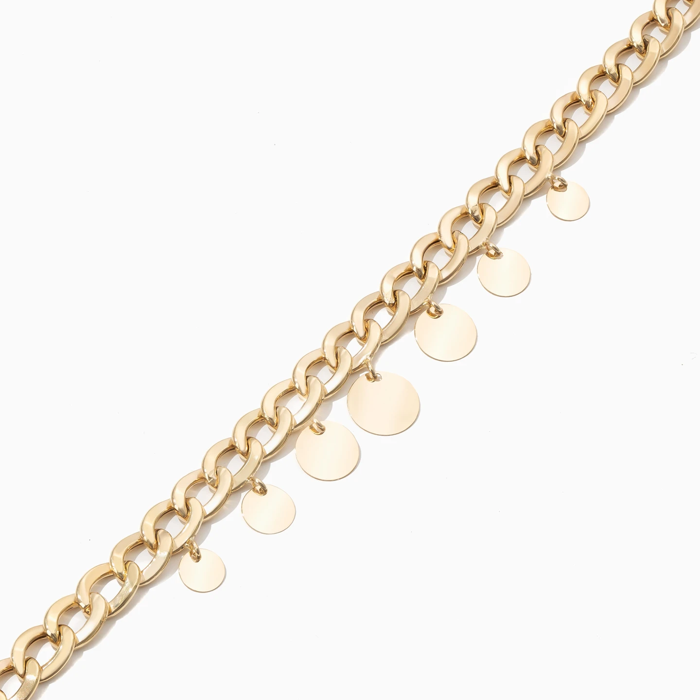 Complement your wardrobe with the elegant look of this shimmering disc bracelet from L'azurde Gold. Fashioned in 18-karat yellow gold, this stylish bracelet features bold chain links with flat gold disc charms in various sizes that dangle along the center. This is a fabulous everyday look to wear to work and for fancy social events.