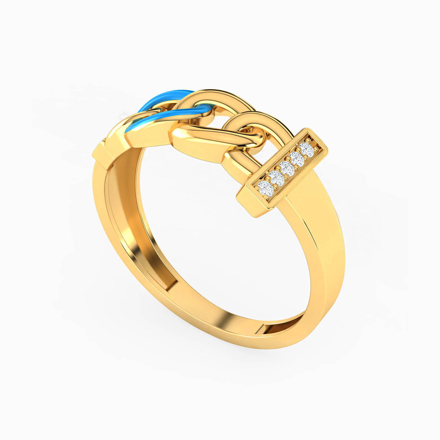 Rev up your style game with this stunning 18-karat yellow gold statement ring from L'azurde Gold, a bold and playful addition to any jewelry collection. At its core, chunky chain links take center stage with one of the links flaunting a vibrant blue enamel coating, exuding an edgy, urban charm. These links connect to a dazzling bar studded with cubic zirconia on either side, making this ring a must-have for those who crave a blend of modern fashion and timeless elegance.