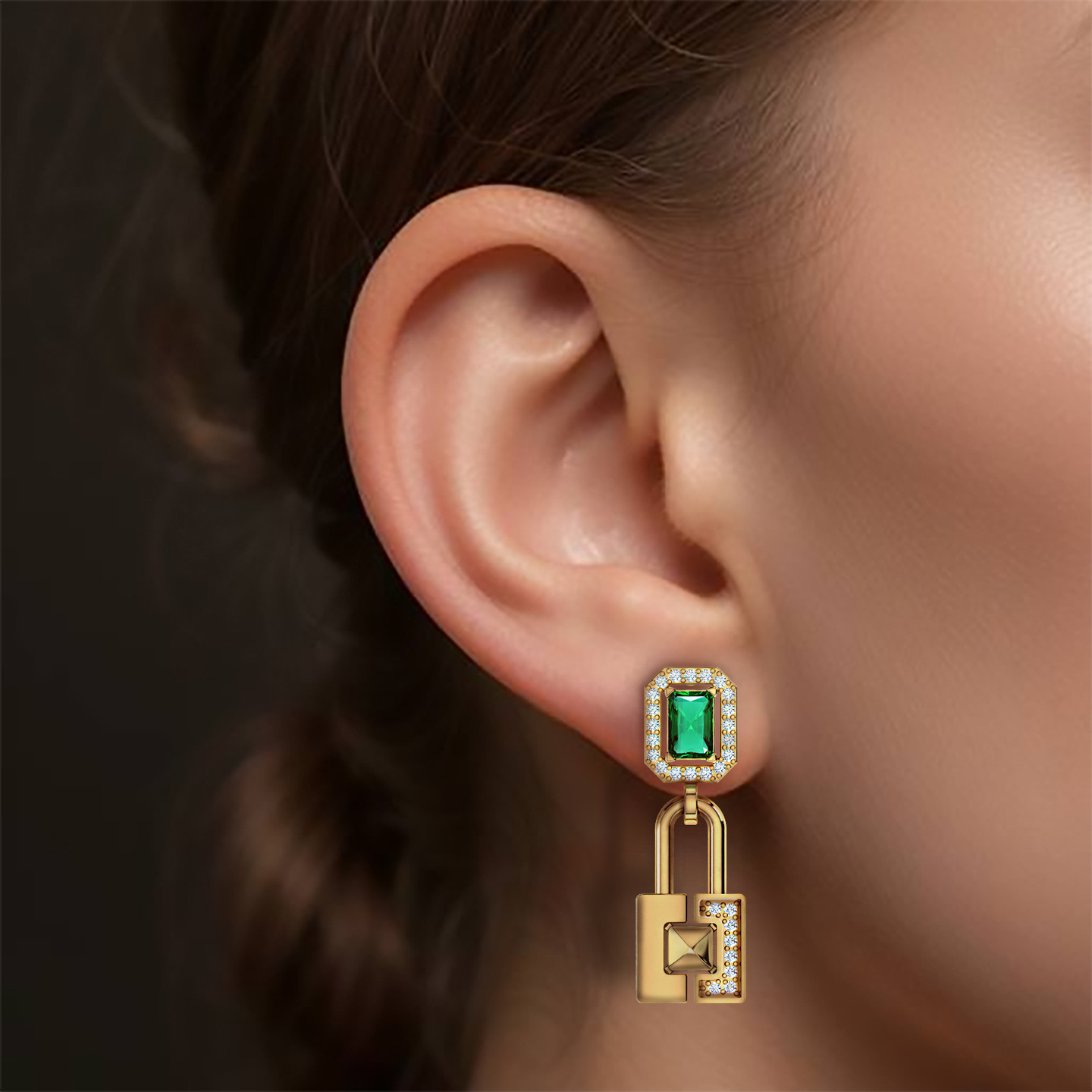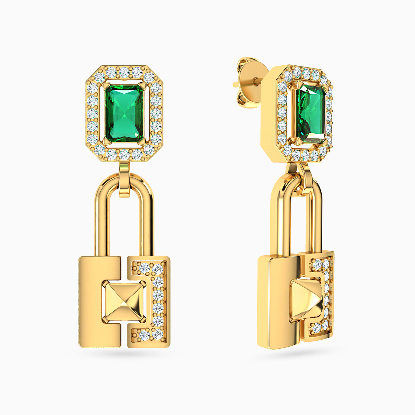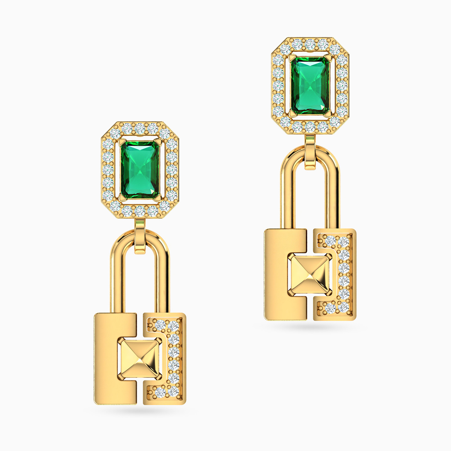 Dress your ears in unparalleled elegance with these 18-karat yellow gold drop earrings from L'azurde Gold. The star of the show is the dazzling rectangle-shaped green stone, securely nestled on four prongs and embraced by a radiant frame of round-shaped cubic zirconia that shimmers with every movement. As a delightful finishing touch, a charming lock dangles from the base, one side adorned with cubic zirconia for added sparkle, and the other boasting a mirror finish, making these earrings the perfect choice for adding a touch of opulence to any special occasion.