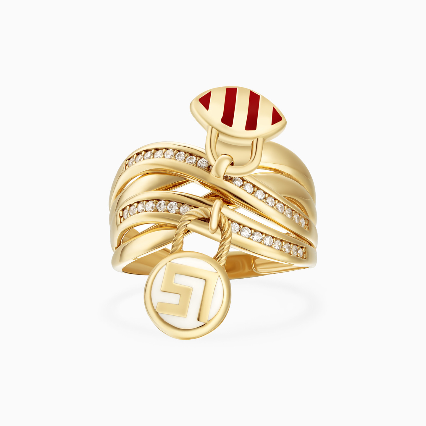 Dress your fingers in a quirky and chic fashion with this 18-karat yellow gold layered statement ring from L'azurde Gold, where playful meets posh! Two layers with a mirror finish are crisscrossed by exuberance by two more layers adorned with dazzling cubic zirconia for that extra sparkle. To add a dash of flair, two locks dangle from intricately braided threads of gold, each boasting a burst of vibrant enamel coating, turning your hand into a canvas of joyful sophistication that's as fun as it is fabulous!