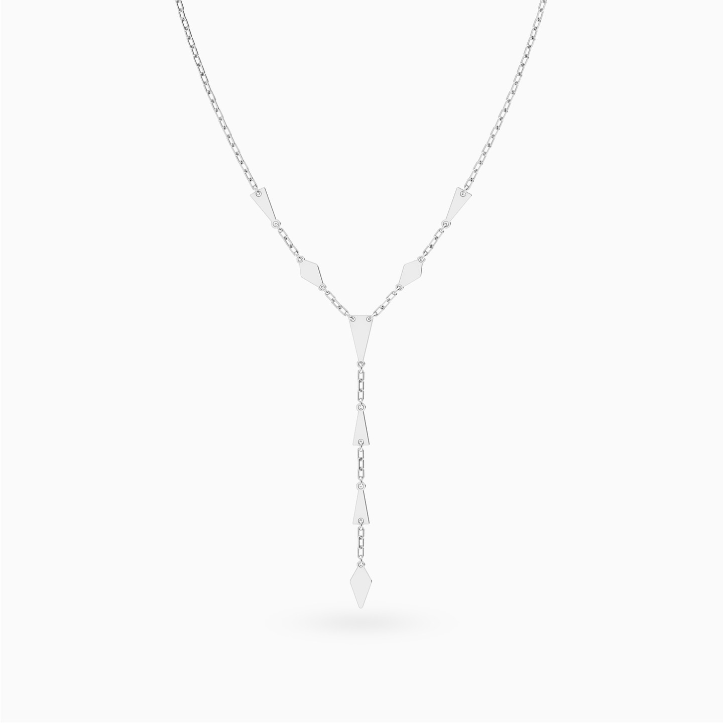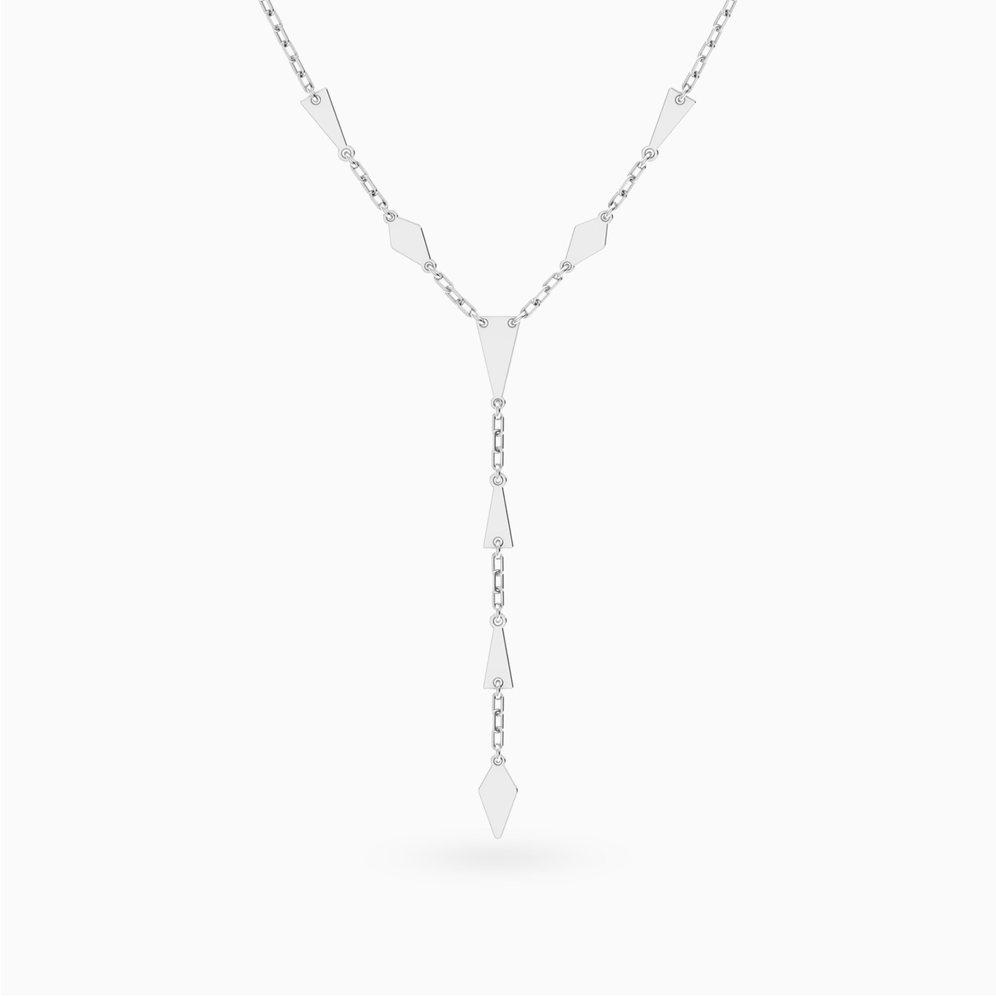 A sculptural rhythm defines this Waves lariat necklace, where fine silver chains are punctuated by triangular & lozenge motifs that lead into a chain drop. The sharp geometry paired with gentle movement creates a balanced, modern expression that feels intentional and fluid. Designed to frame the neckline with ease, it carries elegance without excess. A thoughtful gift for someone drawn to structure softened by graceful motion.