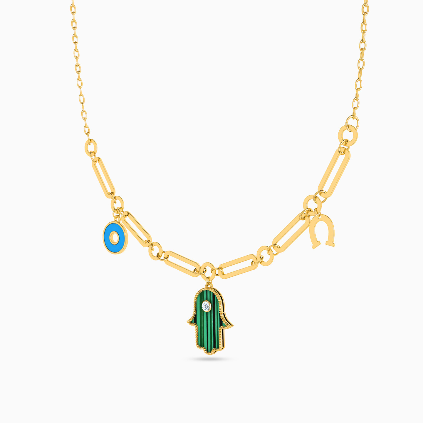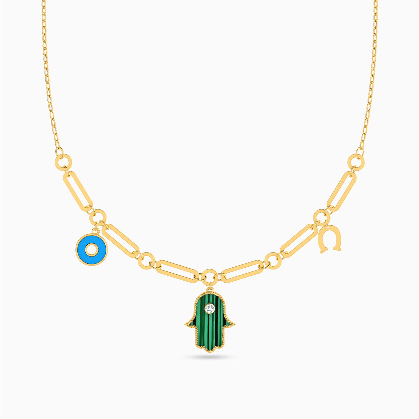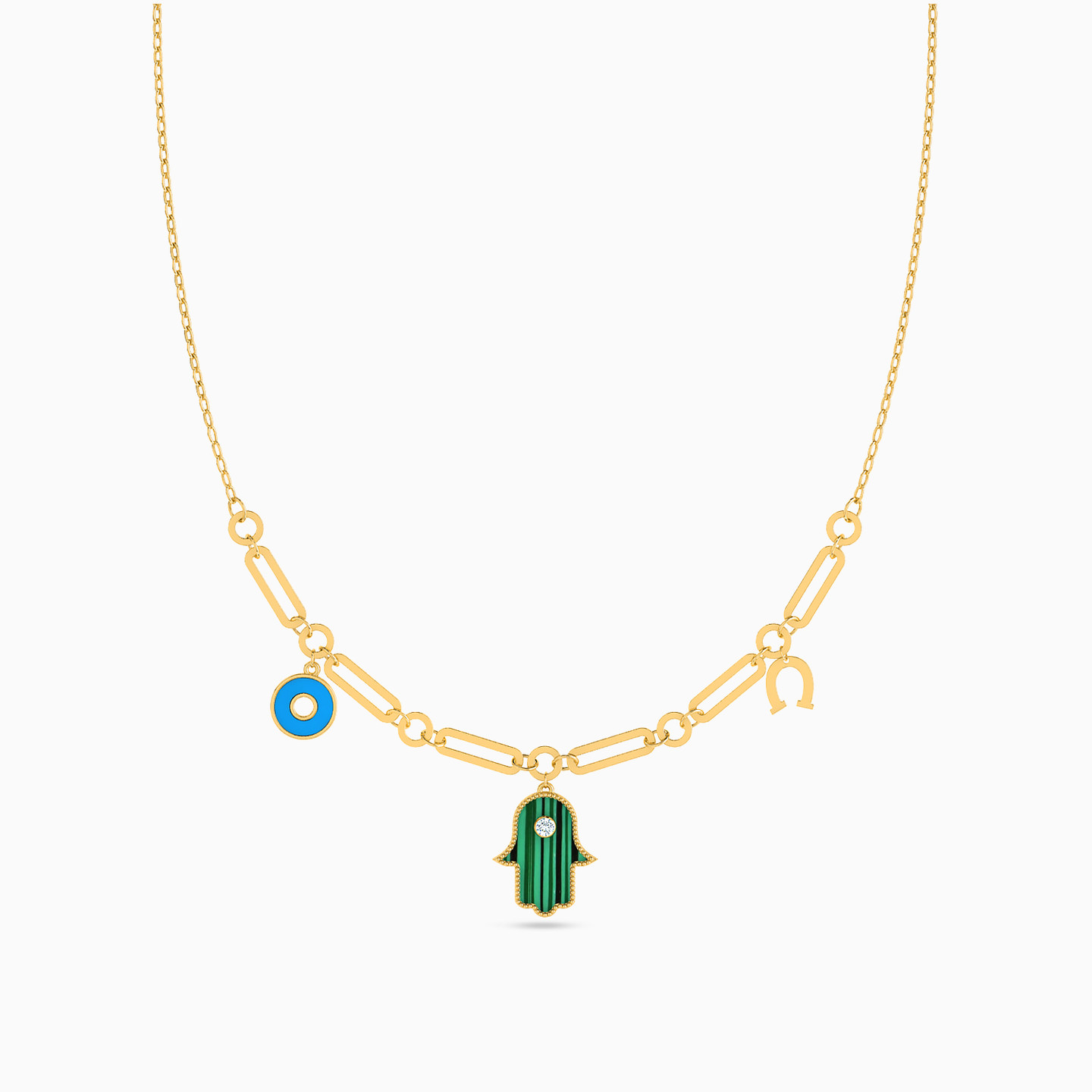You'll never run out of style with this necklace on your side. Featuring a horseshoe charm and malachite accented hamsa and evil eye motifs, that line up on a link chain, this piece will keep you looking contemporary all day. Wear yours with any work to weekend outfit, complemented with a confident smile.