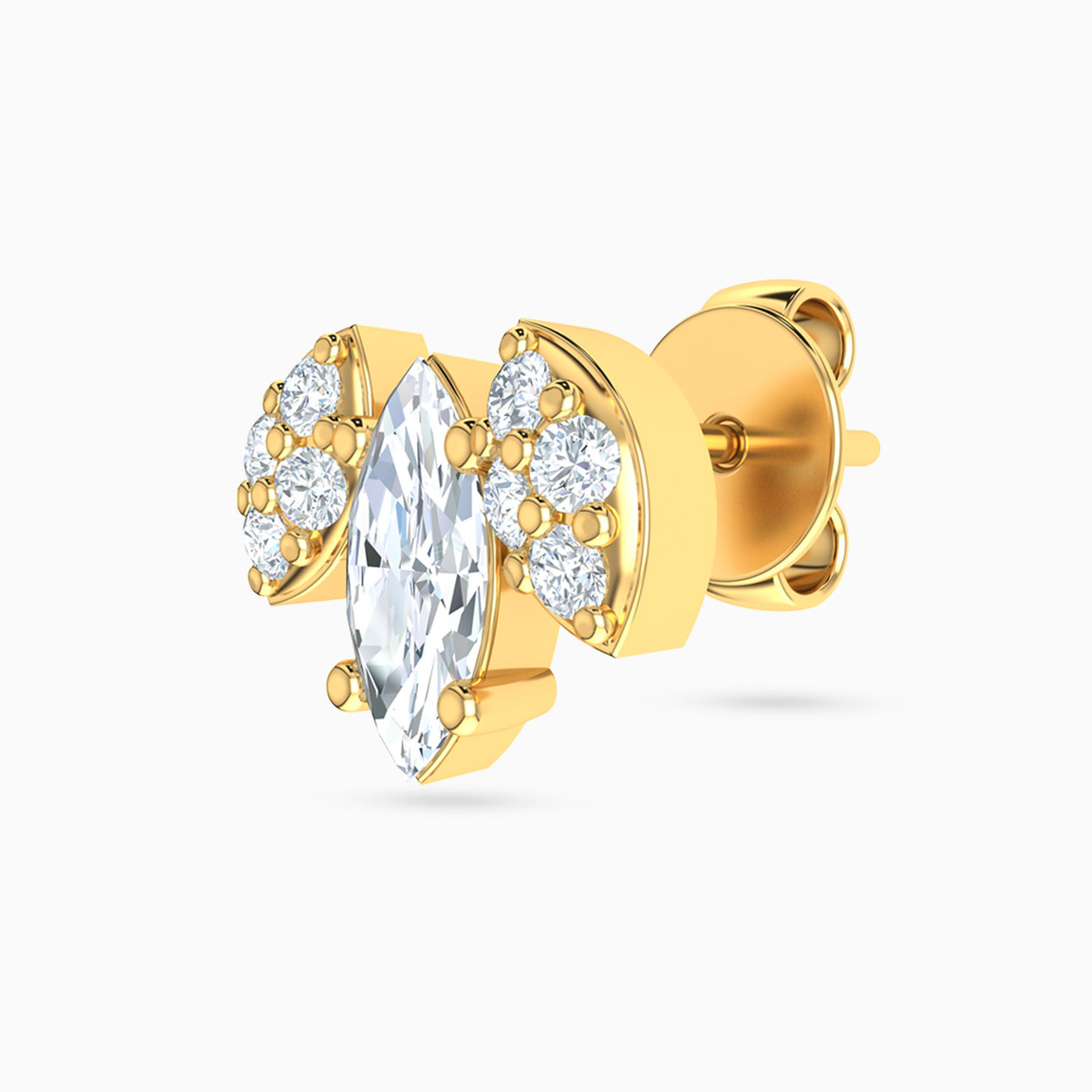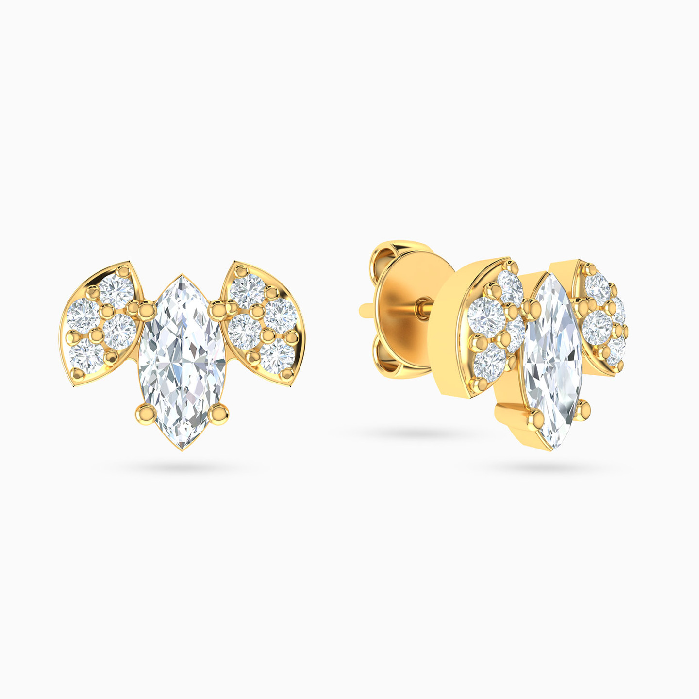 A uniquely designed pair of studs by L’azurde Gold that are perfect for making a statement. These studs feature a dazzling marquise-cut cubic zirconia in the center that is flanked by a marquise-shaped studded motif on either side and set in 18-karat yellow gold. Perfect for styling with a gorgeous cocktail dress.