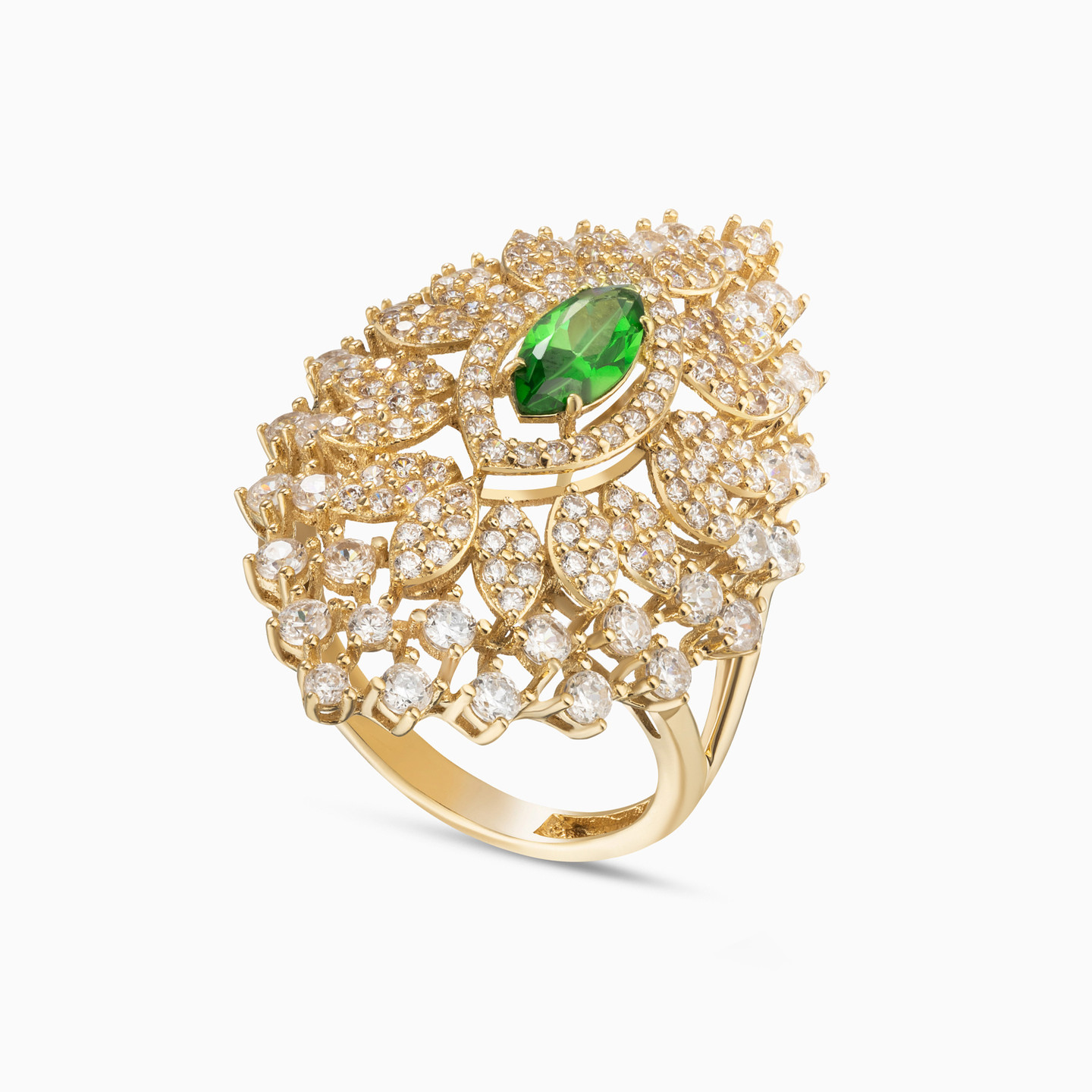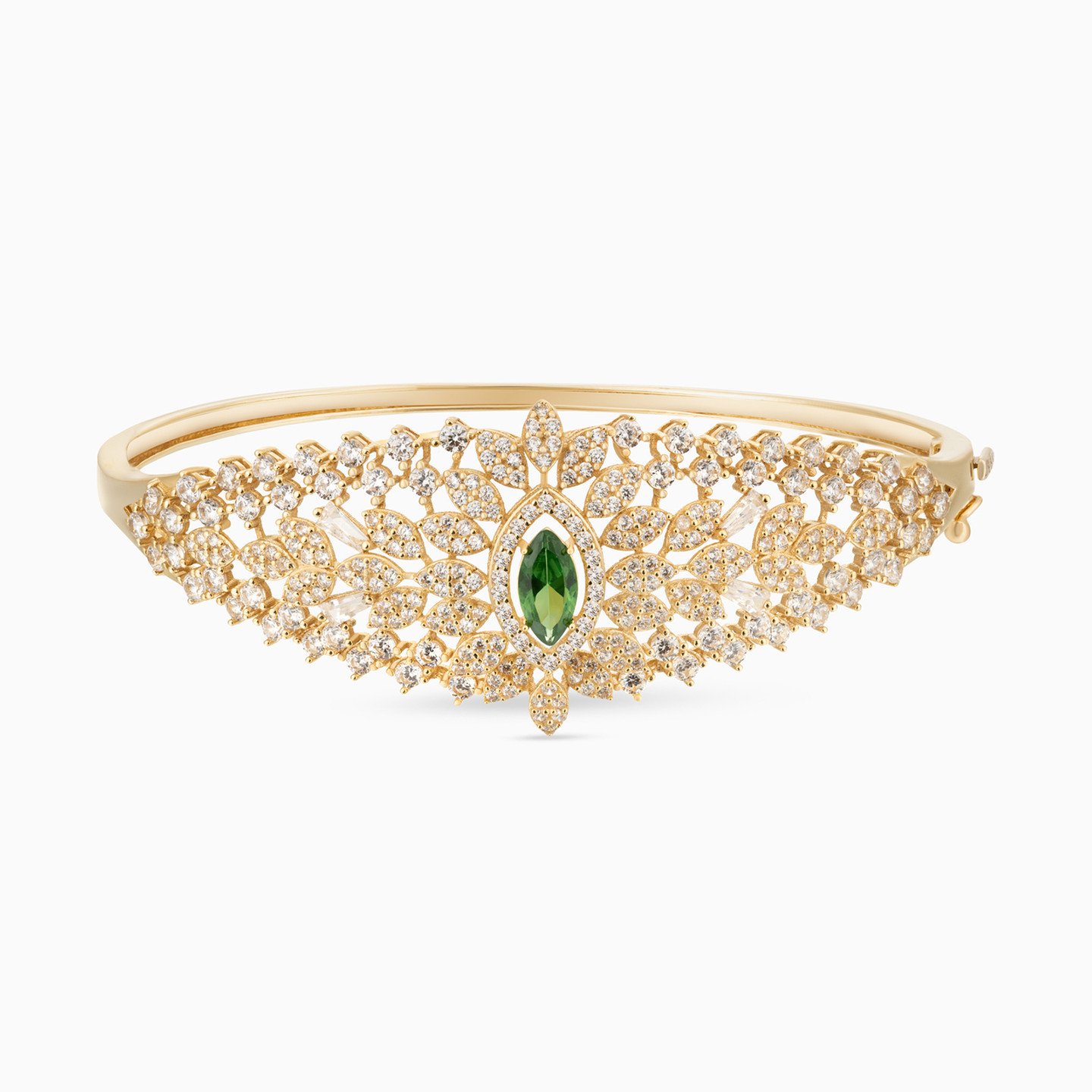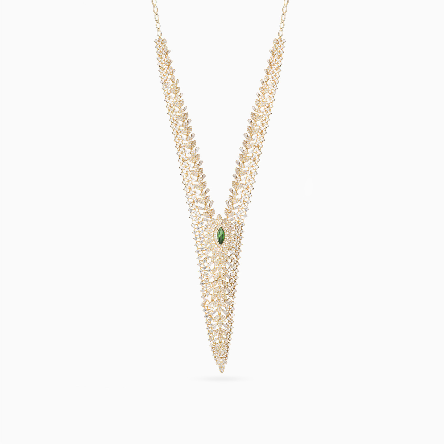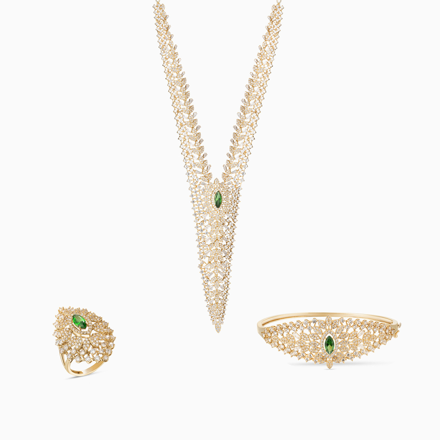 Experience opulence like you have never known before with this regal 18-karat yellow gold jewelry set from L'azurde Gold - a triumphant trio featuring a Y-shaped necklace, bangle bracelet, and ring. At its heart, a resplendent marquise-shaped green colored stone takes center stage, embraced by dazzling marquise motifs adorned with round cubic zirconia. Rows of meticulously studded marquise-shaped motifs and prong-set round cubic zirconia cascade in mesmerizing patterns, creating an ensemble that captivates the eye with its royal allure.