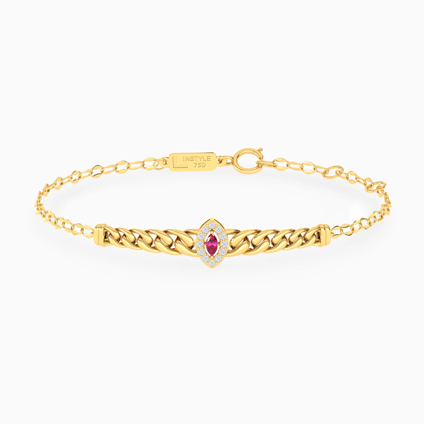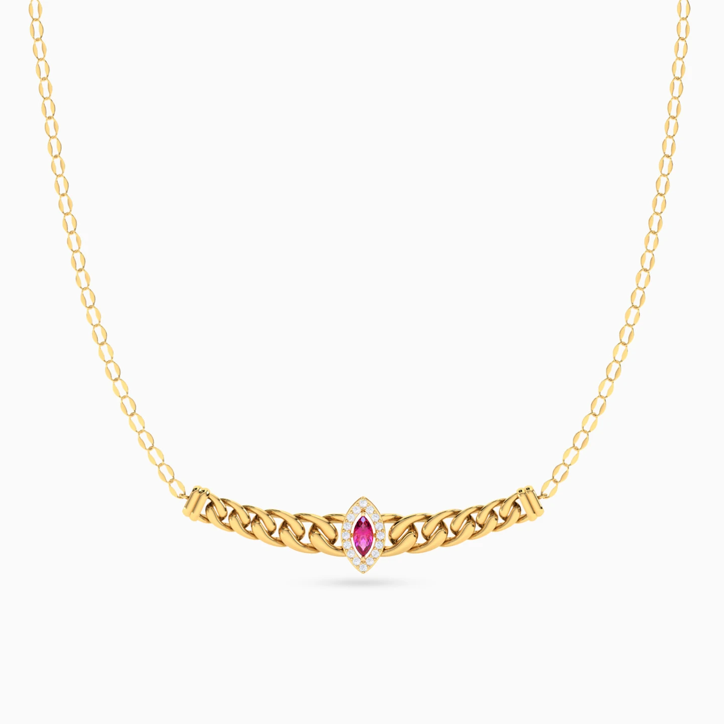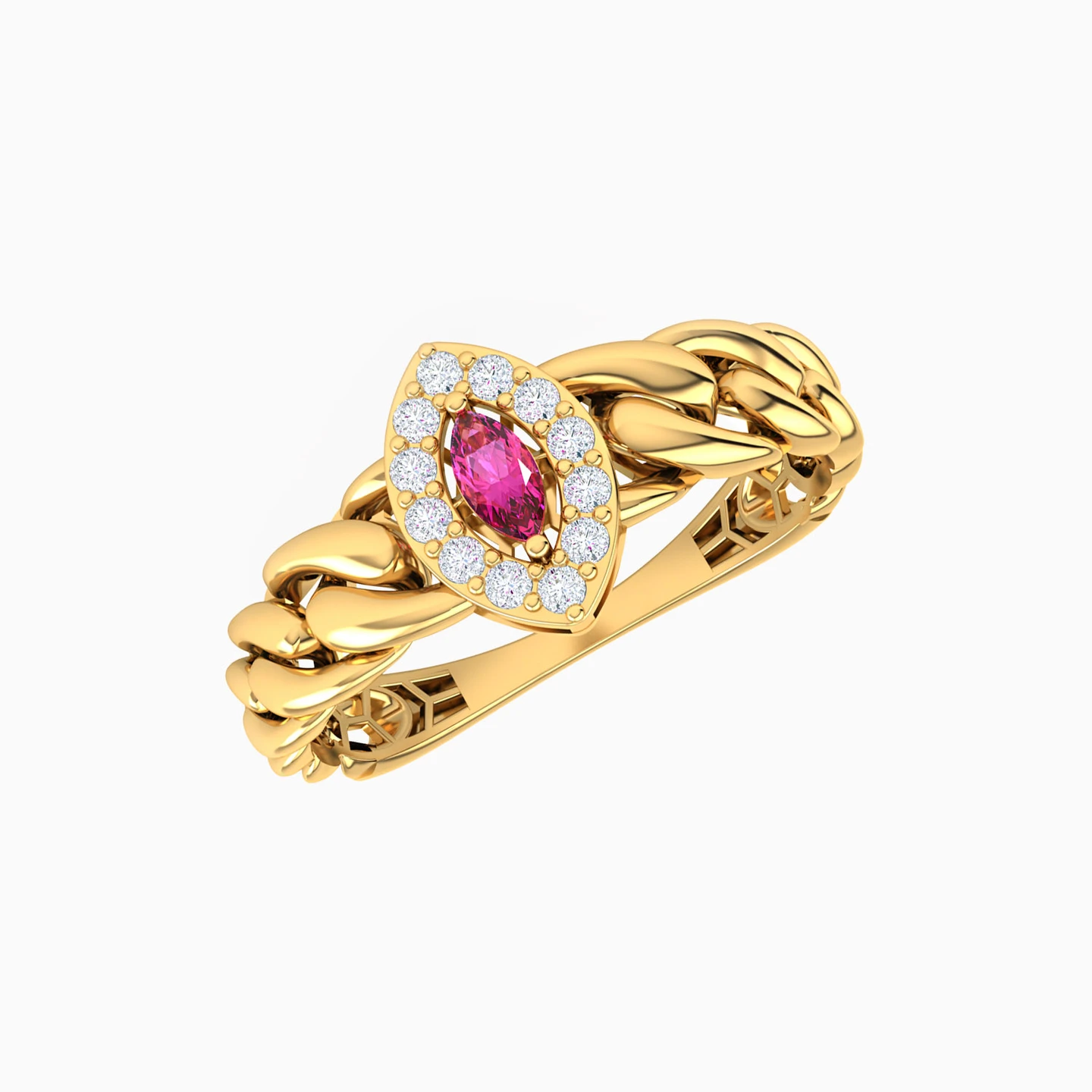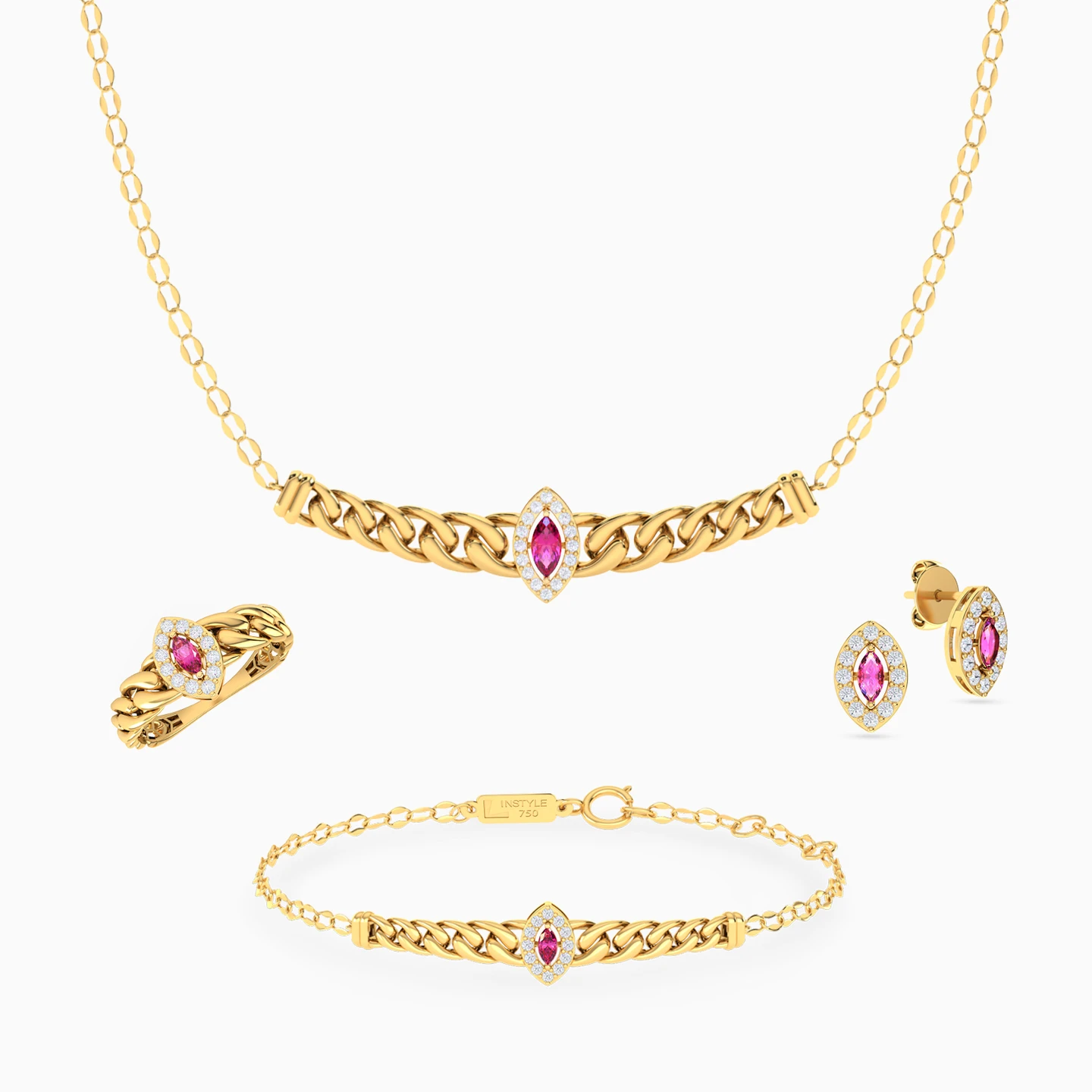 This truly regal jewelry set made from 18-karat yellow gold by L’azurde Instyle comes with a bold and striking design. Featuring a chunky chain links and a dazzling centerpiece featuring a marquise-shaped pink-colored stone, this number is illuminated by a cubic zirconia studded frame. This set includes a gorgeous necklace, chain bracelet, ring and a pair of studs. Perfect for dressing up for a wedding or party.