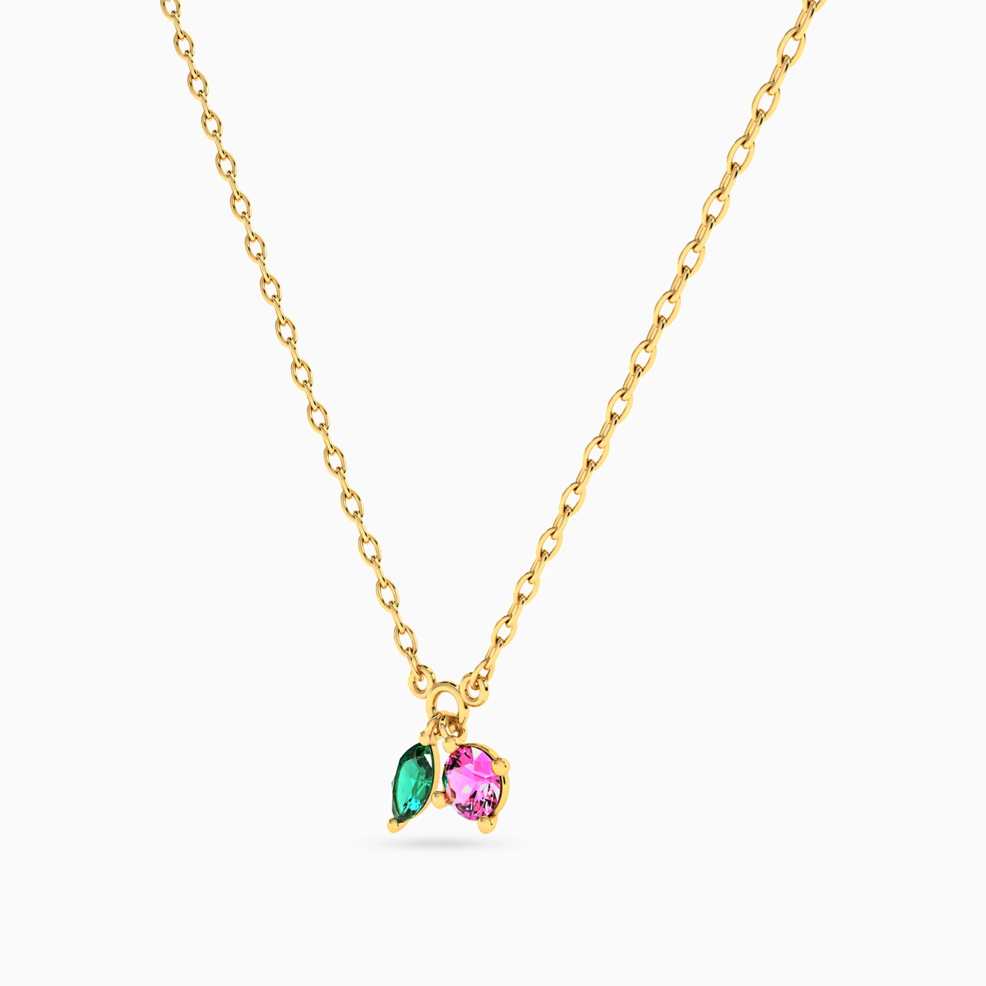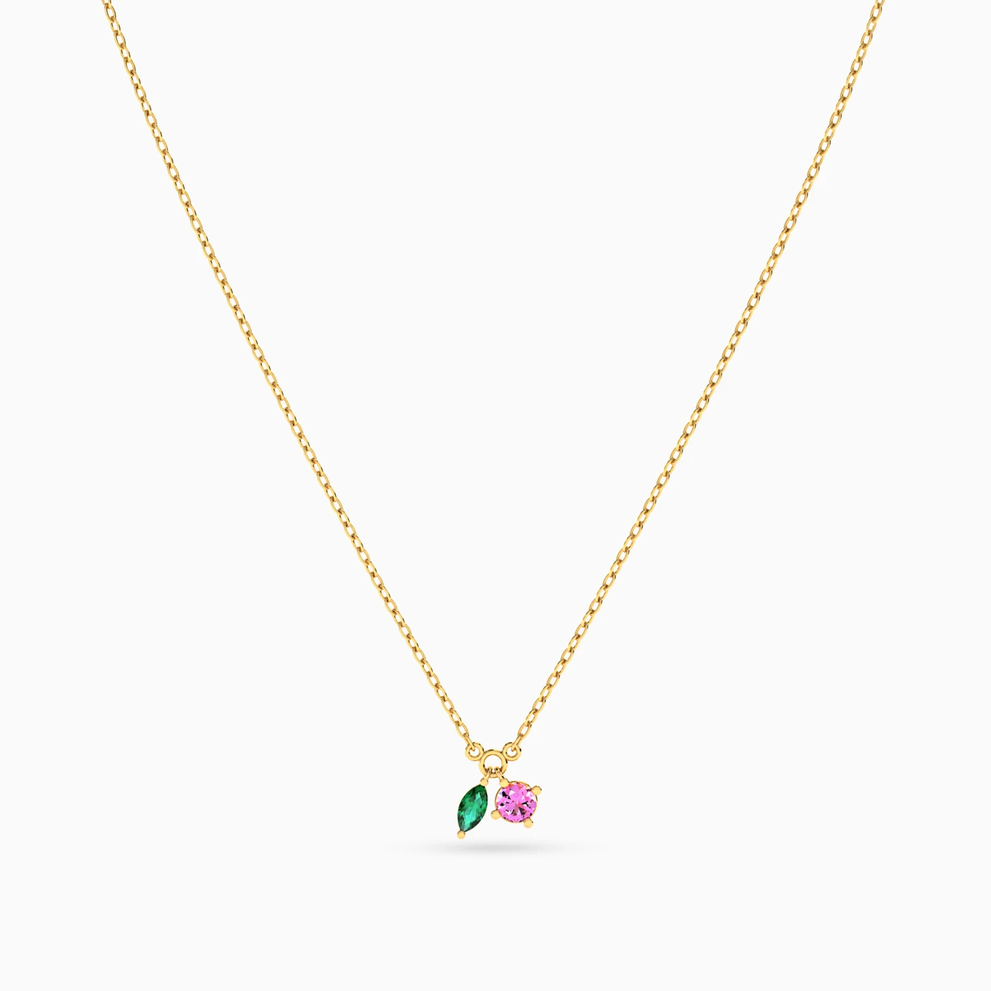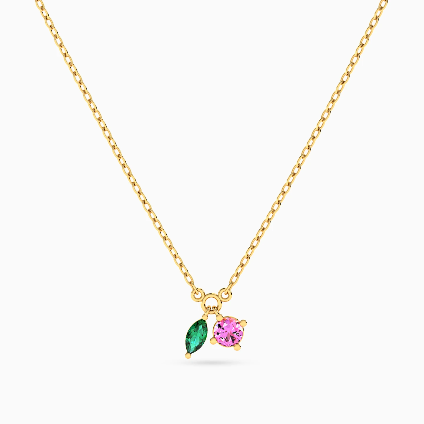 Modern and elegant, this dainty pendant necklace from Instyle complements your minimalist style. Crafted in 14-karat yellow gold, this feminine piece shimmers with a marquise-shaped green stone charm and a round pink stone charm suspended from a dainty chain. Dazzling enough to make co-workers take notice and sophisticated enough to dress up a formal blouse or dress, this pendant necklace is an essential choice for your jewelry collection.