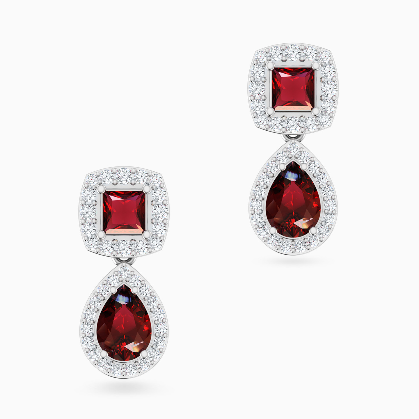 Discover affordable glamour and timeless style with this piece from Waves! These silver drop earrings from the Peonia Collection showcase a dazzling duet of red stones—one square, one pear-shaped—each framed by a sparkling halo for extra brilliance. Whether you're dressing up for an elegant dinner or adding drama to your evening look, this design brings confident charm and rich color to every occasion.
