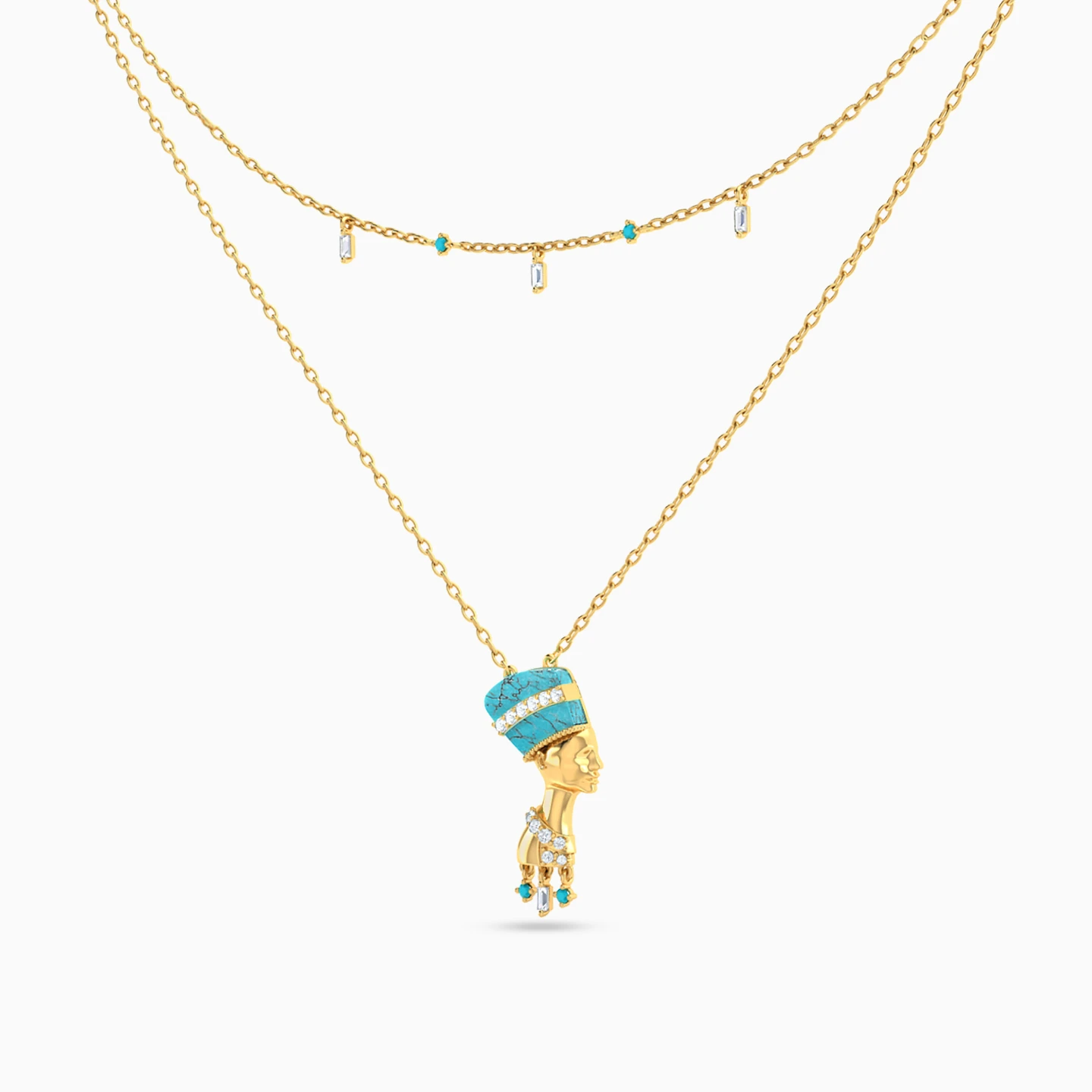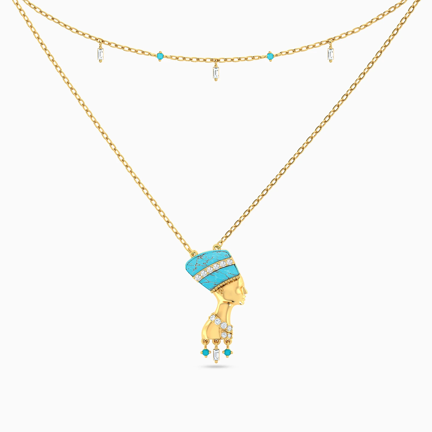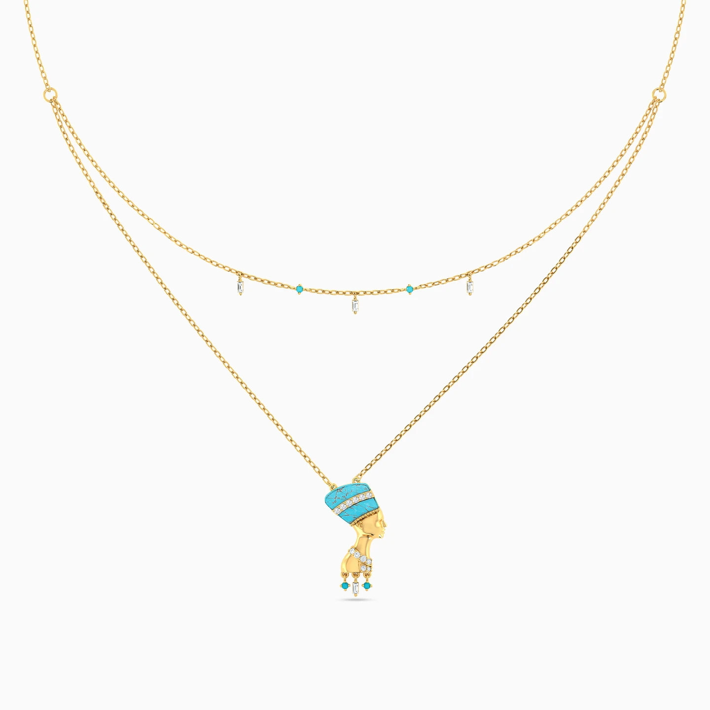 Shine like a queen by wearing this gorgeous layered necklace from L'azurde Instyle for daytime and evening glamour. This statement-making necklace shimmers in 18-karat yellow gold depicting Queen Nefertiti, known for her elegance, confidence and power. Dazzling with turquoise stones and shimmering clear accents, this captivating layered necklace is an essential for every woman’s jewelry repertoire.