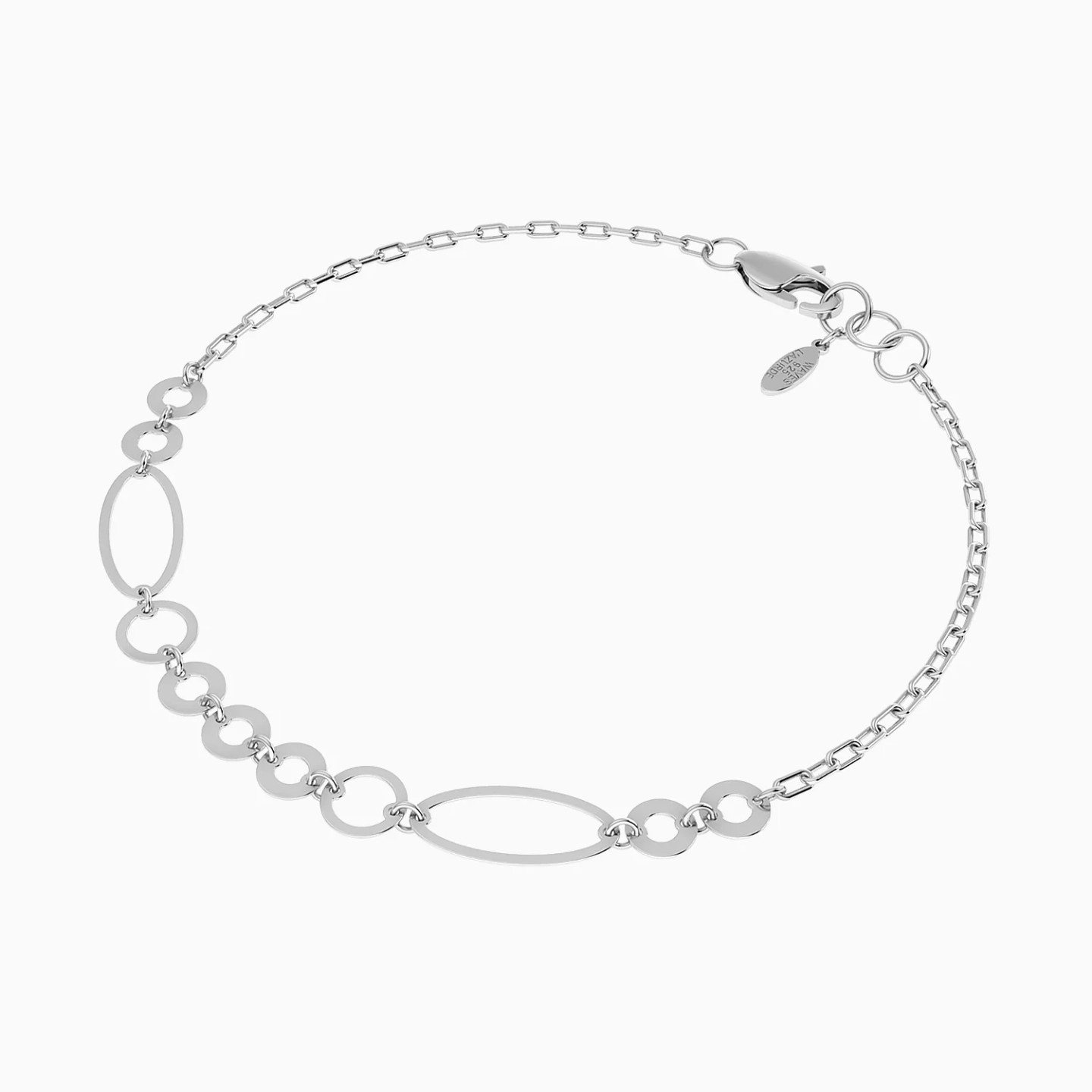 Balance drawn through delicate repetition. This Waves silver chain bracelet from the Equinox Collection features a flowing chain adorned with a sequence of small oval and round loops, creating a subtle rhythm that catches the light with every movement. Modern and refined, it reflects individuality and quiet confidence—an elegant everyday piece and a thoughtful gift for someone who appreciates minimal, fluid design.