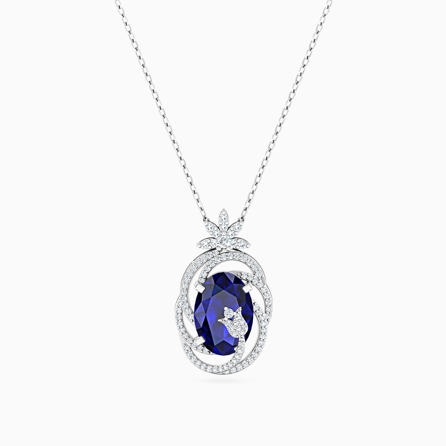 Be captivating wearing this stunning pendant from L'azurde Diamonds. Simply breathtaking, this gorgeous 18-karat white gold pendant features diamonds in a scalloped design that wraps around to form an exquisite diamond flower. The diamonds dazzle against a mesmerizing deep blue oval stone at the center. The ultimate luxury, this magnificent accessory is the perfect choice for formal or informal gatherings.