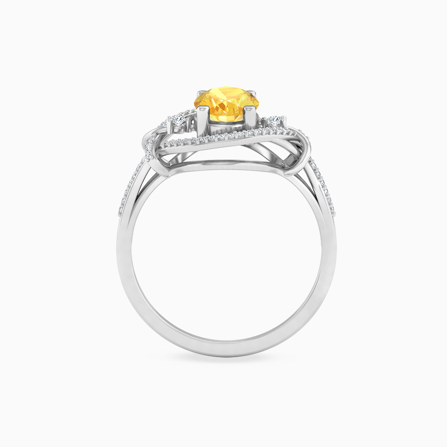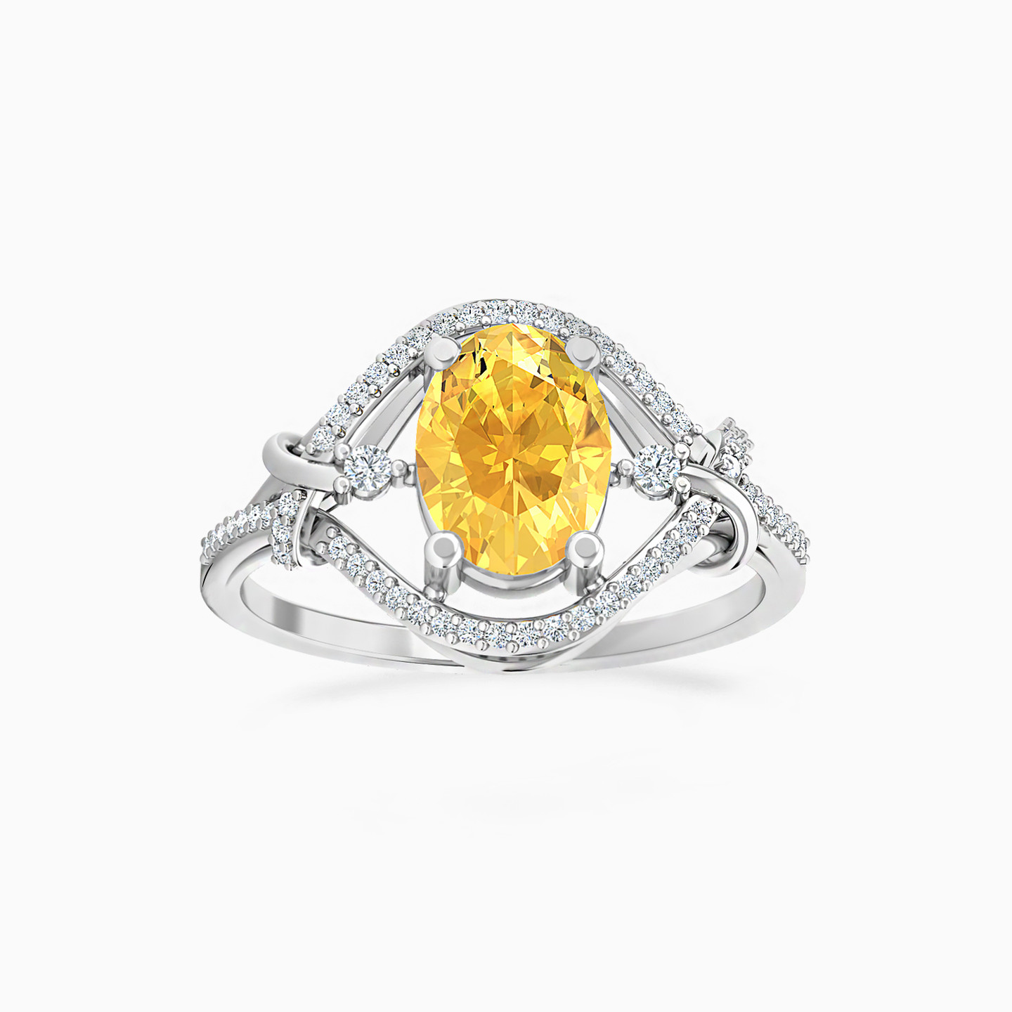 Exuding warmth and sunshine, this statement ring by L'azurde Diamonds is a beautiful combination of beauty and elegance. It features a stunning 0.94-carat oval-shaped yellow colored stone set on four prongs in the center flanked by waves of bands studded with 0.14-carat brilliant cut diamonds forming a beautiful knotted oval-shaped halo around it. The sparkle of the diamonds combined with the warmth of the center stone makes this 18-karat white gold ring a sight to behold! Style it with a sunshine yellow gown for a sizzling look.