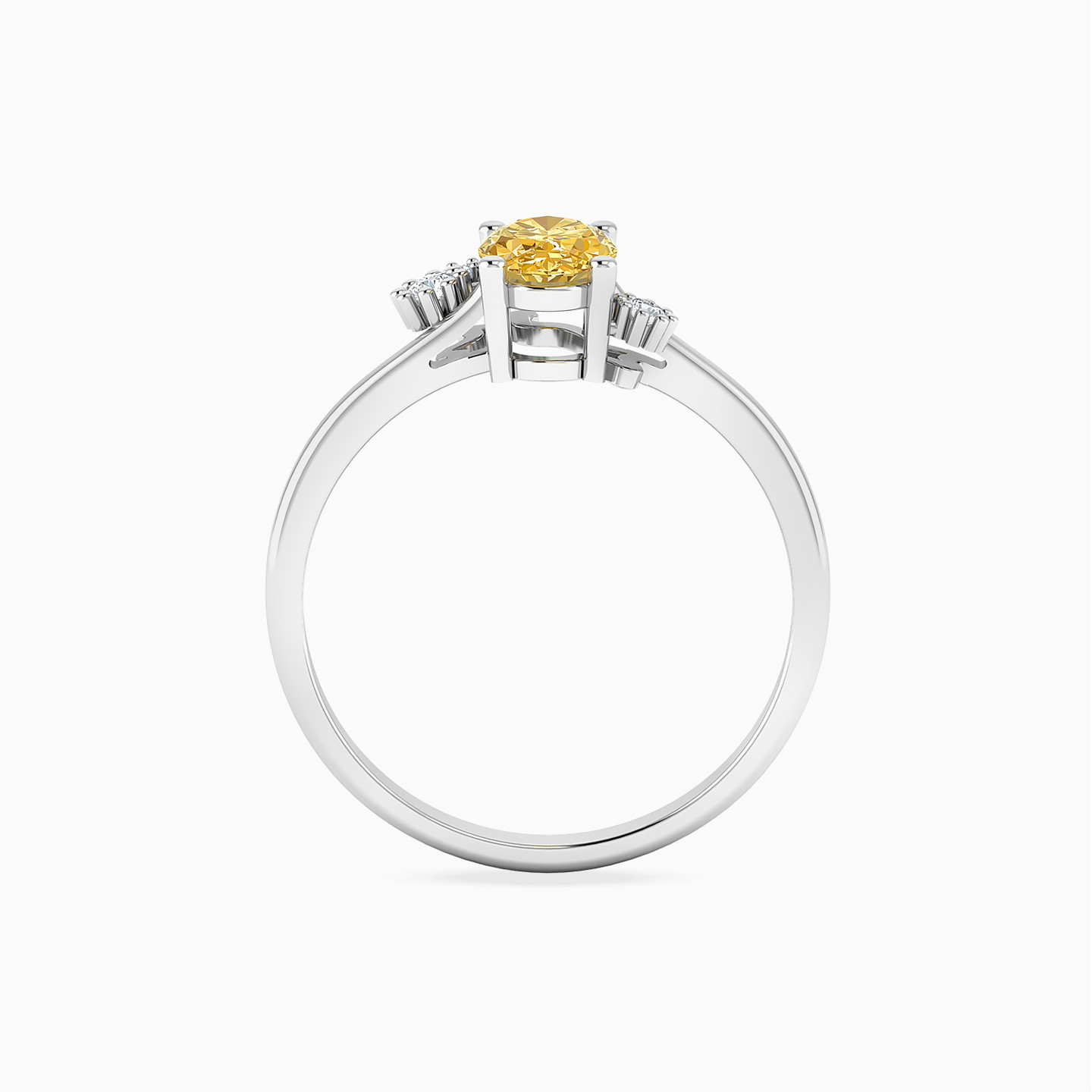 Make a bold and vibrant statement with this 18-karat white gold ring from L'azurde Diamonds. The centerpiece of this exquisite piece features a captivating 0.63-carat oval-shaped yellow colored stone, set securely on four prongs, emanating a warm and radiant glow. On one side of the stone, three brilliant cut diamonds weighing 0.07-carat and on the other side, a single diamond, set on prongs creates a blossoming flower-like effect. This ring is a perfect fusion of vibrant color and exquisite craftsmanship, capturing attention and admiration wherever it goes.