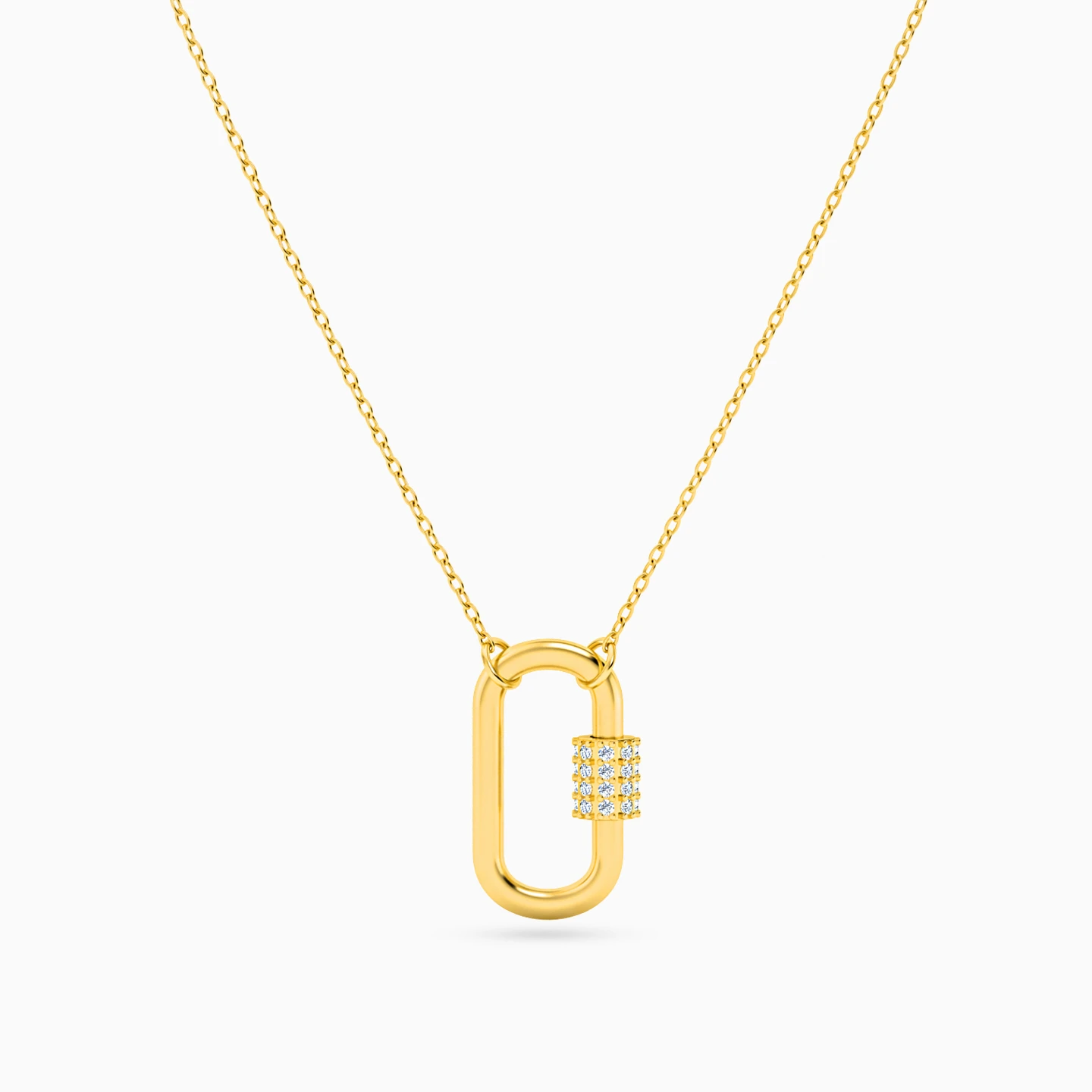 Here's the classic we all need. This signature unlockable element in vertical construct is lightly accented with diamonds and drops from an 18-karat yellow gold chain. Wear this piece from our collection as it is or add in your favorite charms to the mix.