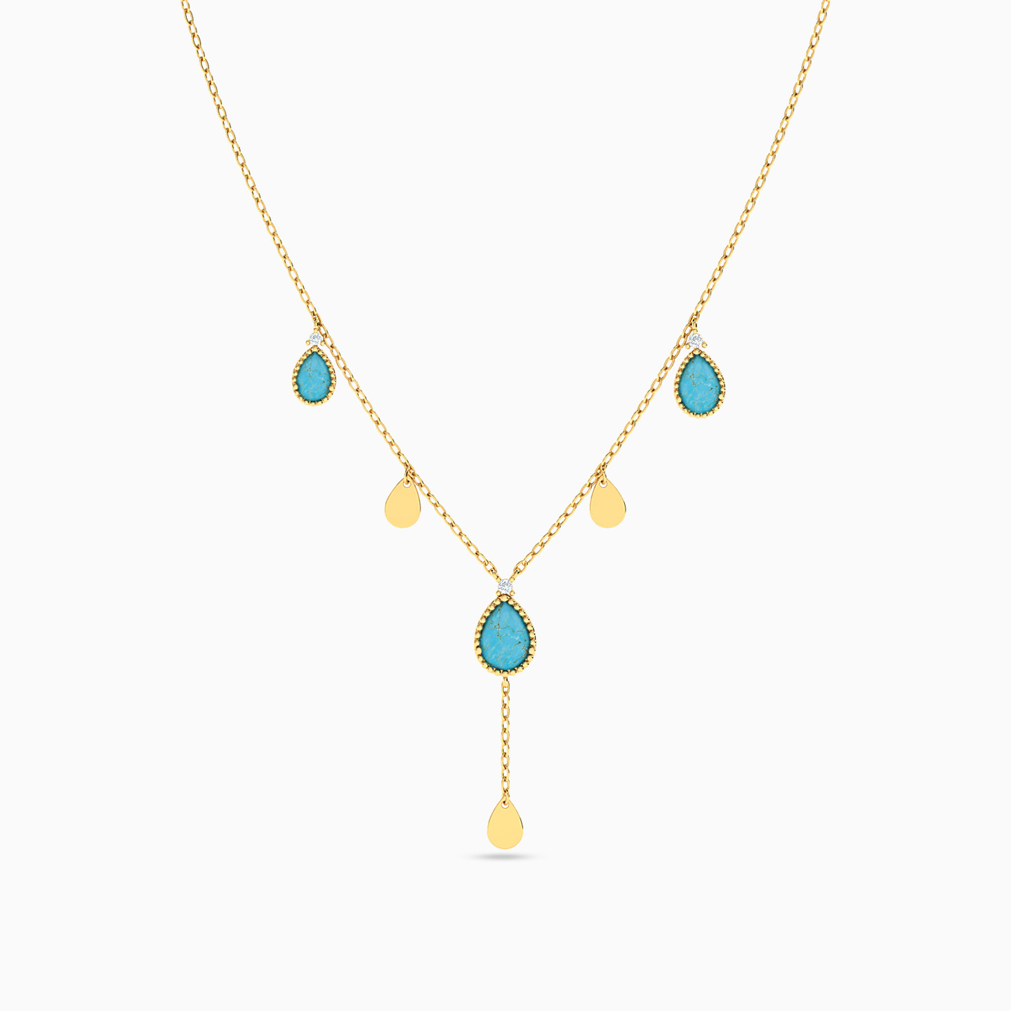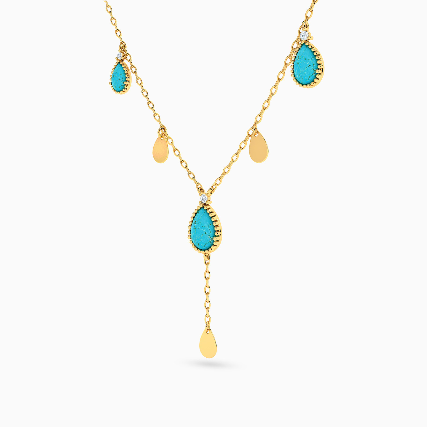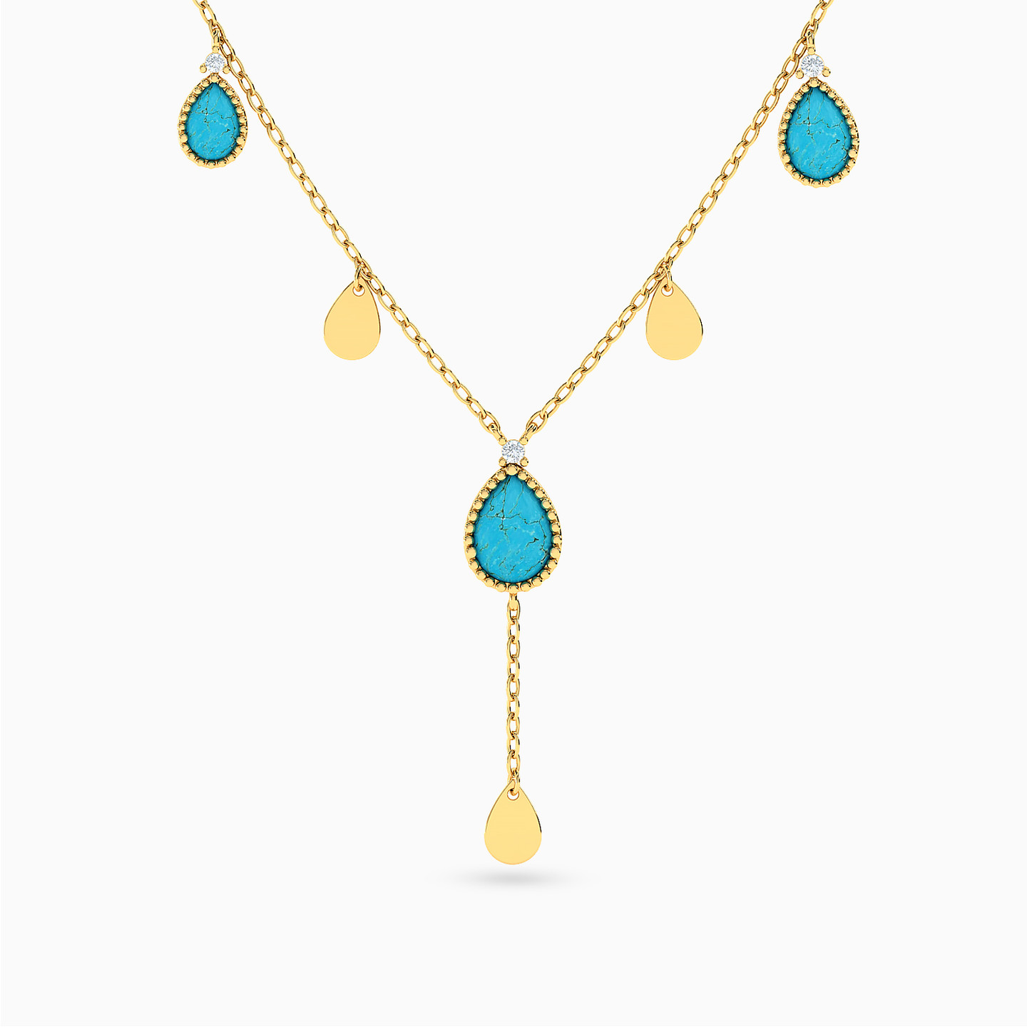 Capture the feminine elegance in your everyday appearance with this dainty necklace from L'azurde Instyle. Dotted with pear shaped turquoise stones alternating with tear drop motifs on a slim 18-karat yellow gold chain, this number features a subtle drop that will accentuate any low neckline. Style it solo or with matching earrings to complete the set.