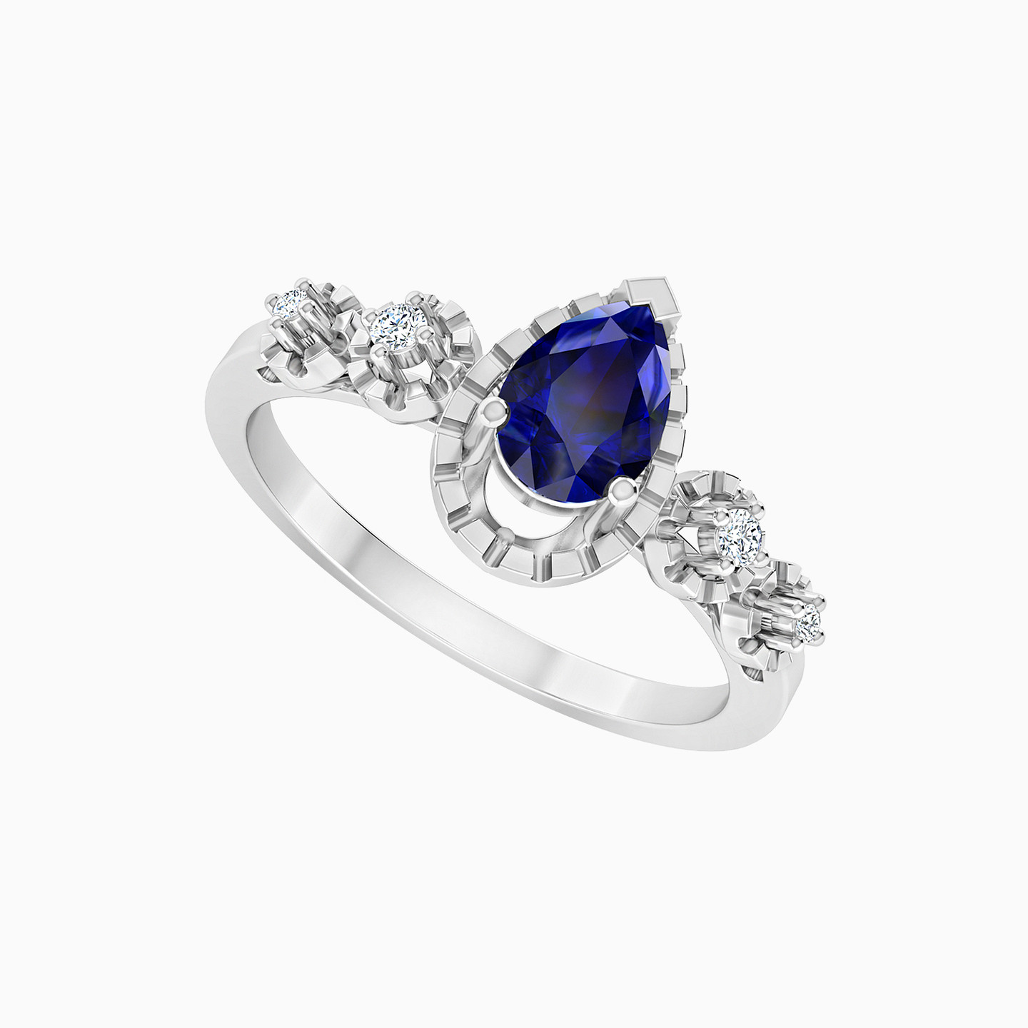Let the shine take over your style with this sparkling ring from L'azurde Diamonds. Set in 18-karat white gold with a distinct pear-shaped blue stone to the center and diamonds on either sides, this piece ought to get you noticed. We love the textured framing and the sleek band that give it a weightless feel.