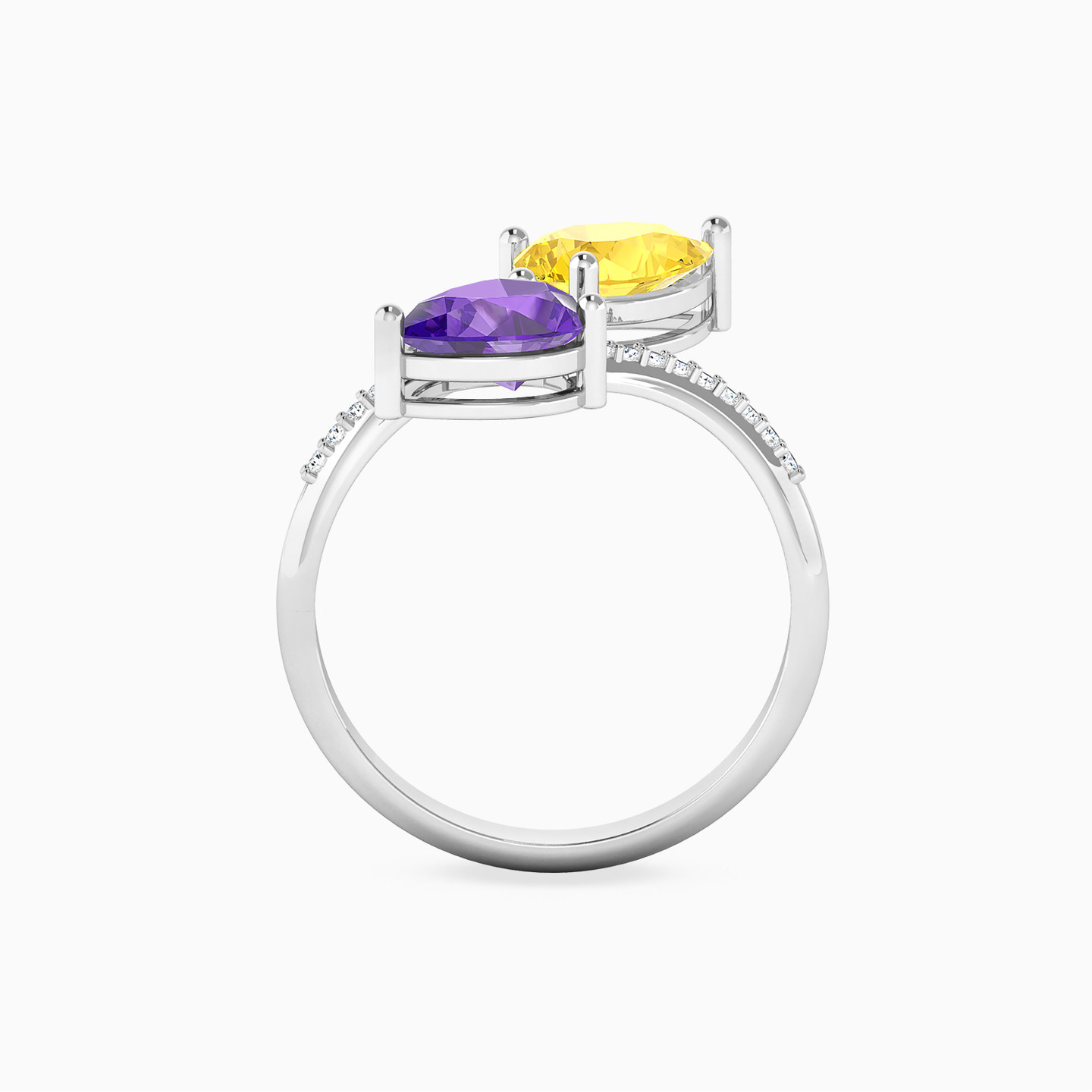 This 18-karat white gold two-headed ring from L'azurde Diamonds showcases how two vibrant colors can come together to create something stunningly beautiful! It features a 1.71-carat pear-shaped yellow-colored stone frame set on one head and a captivating purple-colored stone on the other. The sleek band of the ring is elegantly adorned with 0.07-carat brilliant cut diamonds, adding a touch of sparkle and luxury. This striking and versatile piece offers a bold and eye-catching statement, perfect for those who appreciate distinctive and contemporary jewelry.