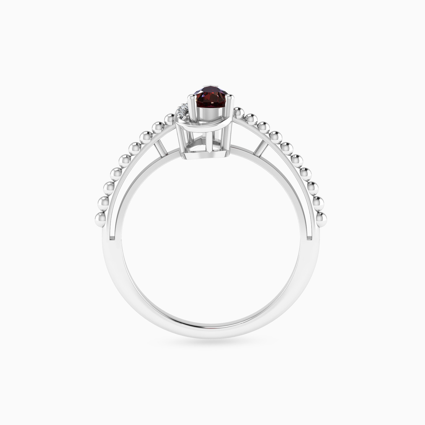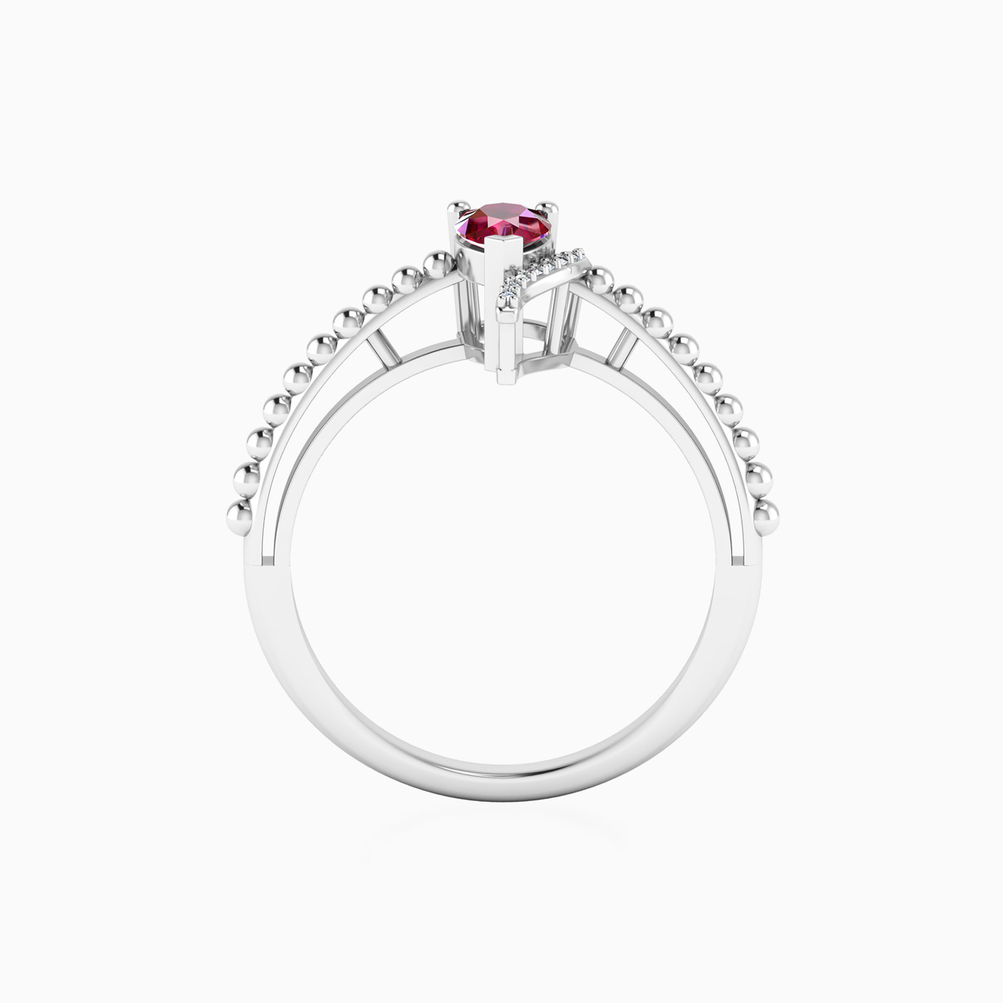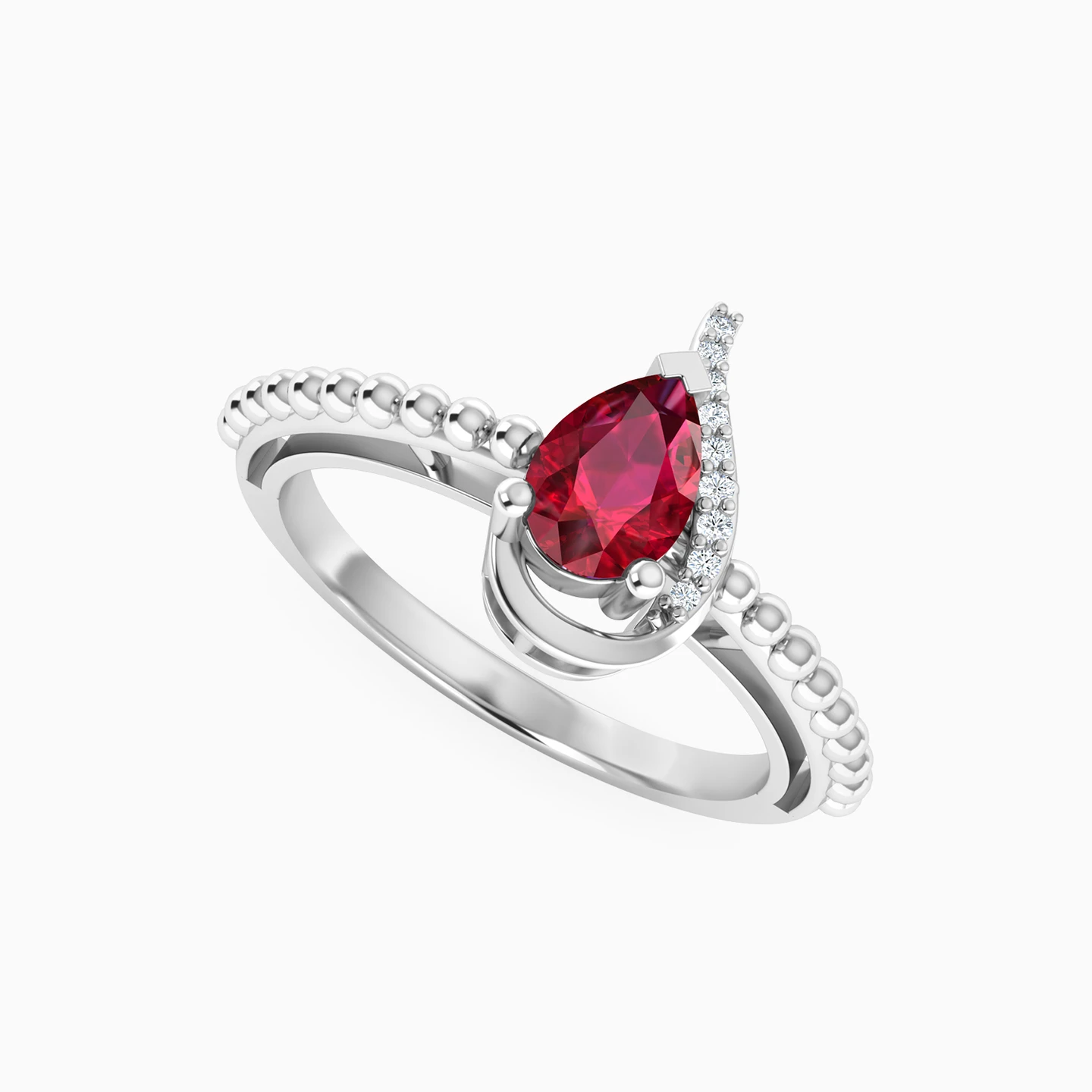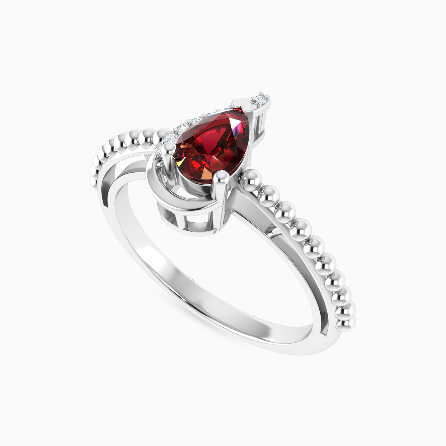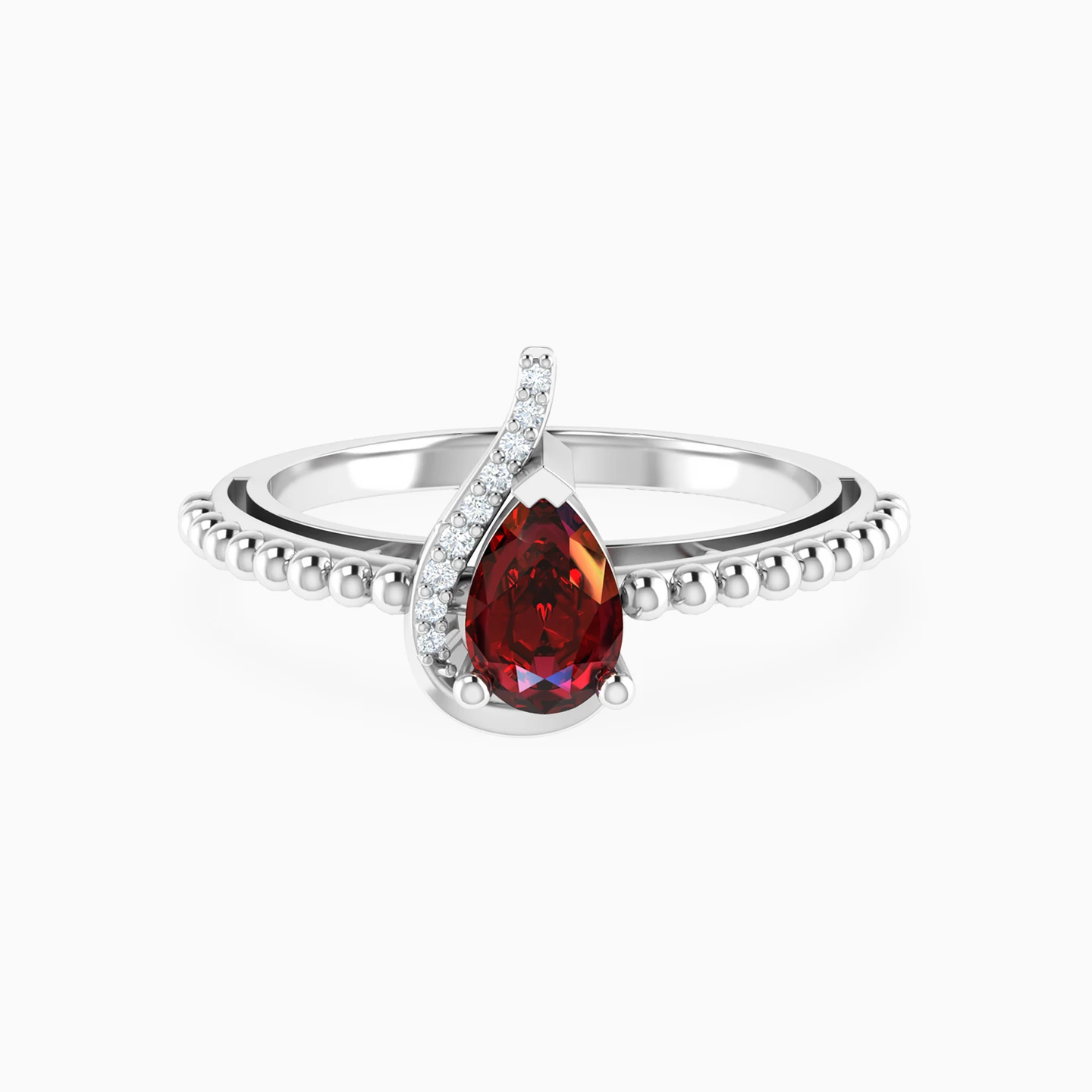 Add sparkle to your already-beautiful daytime or evening looks with this gorgeous red stone ring from L'azurde Diamonds. We love the richness of the pear-shaped red stone at the center of this ring, enhanced by a ribbon of brilliant cut diamond accents and an elegantly detailed 18-karat white gold band. You'll always garner attention when wearing this divine piece.