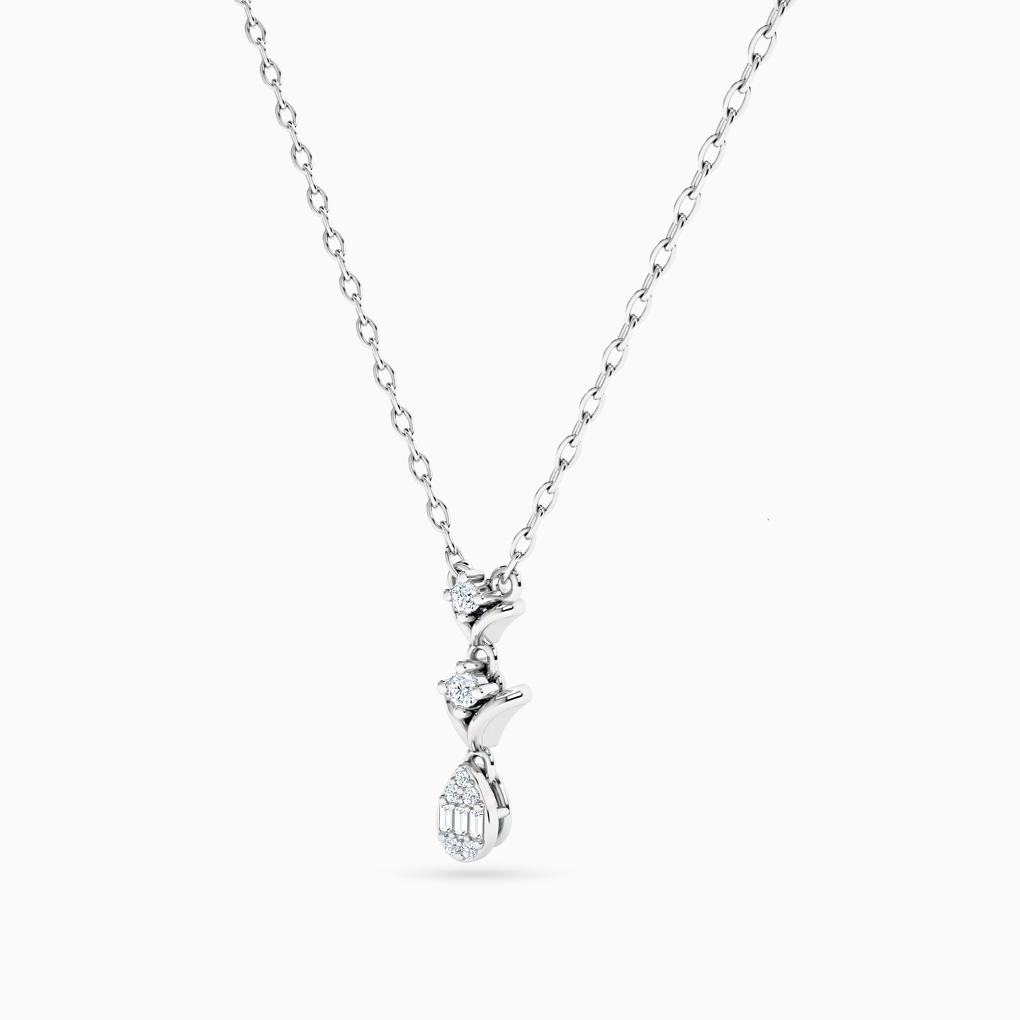 Elevate your neckline with the timeless allure of this 18-karat white gold pendant necklace from L'azurde Diamonds. It features a delicate chain that leads to a captivating cascading pendant, featuring two mesmerizing 0.09-carat brilliant cut diamonds gracefully embraced in a v-shaped arc. Completing the exquisite design is a dazzling pear-shaped drop, adorned with radiant diamonds, adding an elegant finishing touch. Style this necklace with a sweetheart neck dress to show off the sparkle.