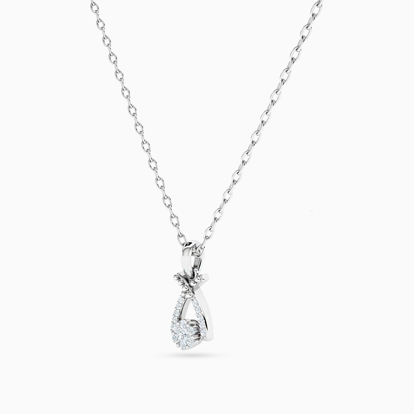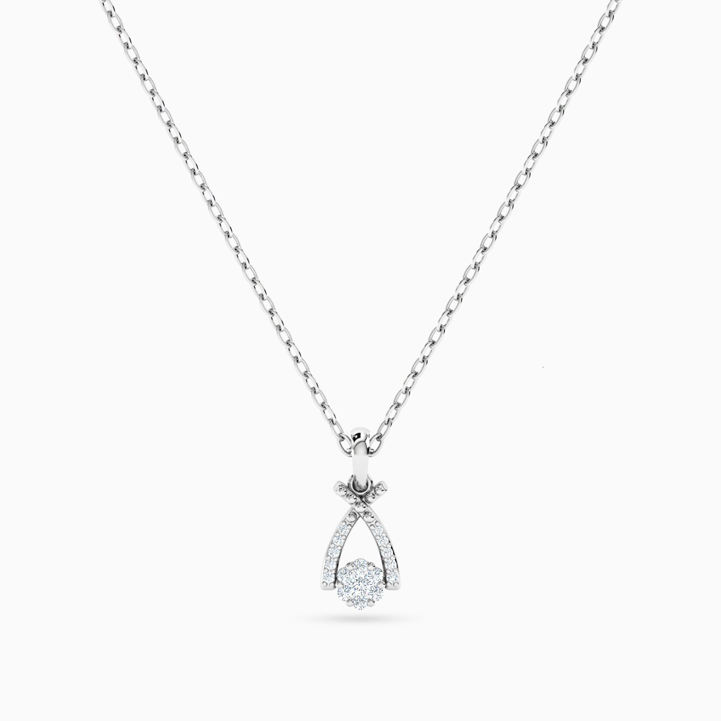 Adorn yourself with nature's elegance with this 18-karat white gold pendant necklace from L'azurde Diamonds. It showcases a captivating flower crafted from 0.09-carat brilliant cut diamonds resting within a v-shaped frame, which is also meticulously studded with sparkling diamonds, creating an enchanting masterpiece. This pendant necklace embodies both delicate beauty and graceful sophistication making it a must-have.