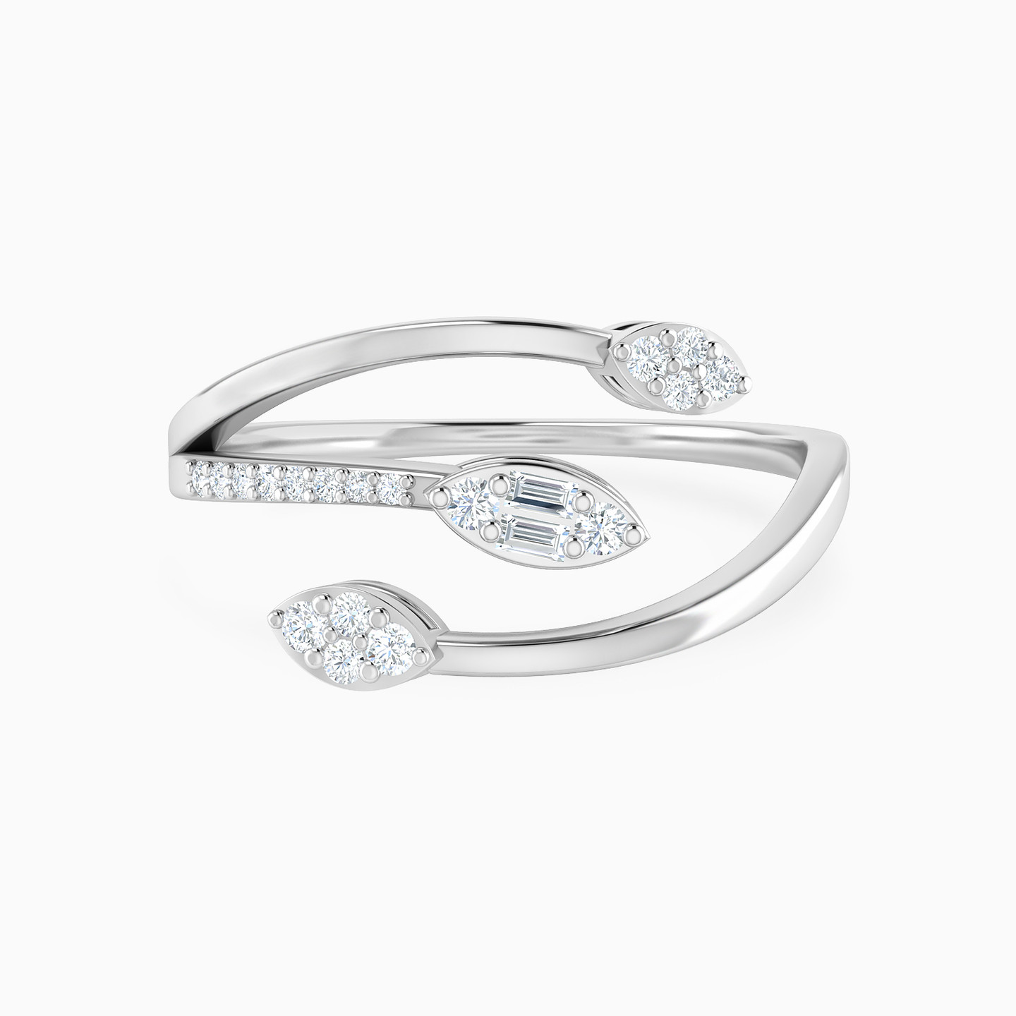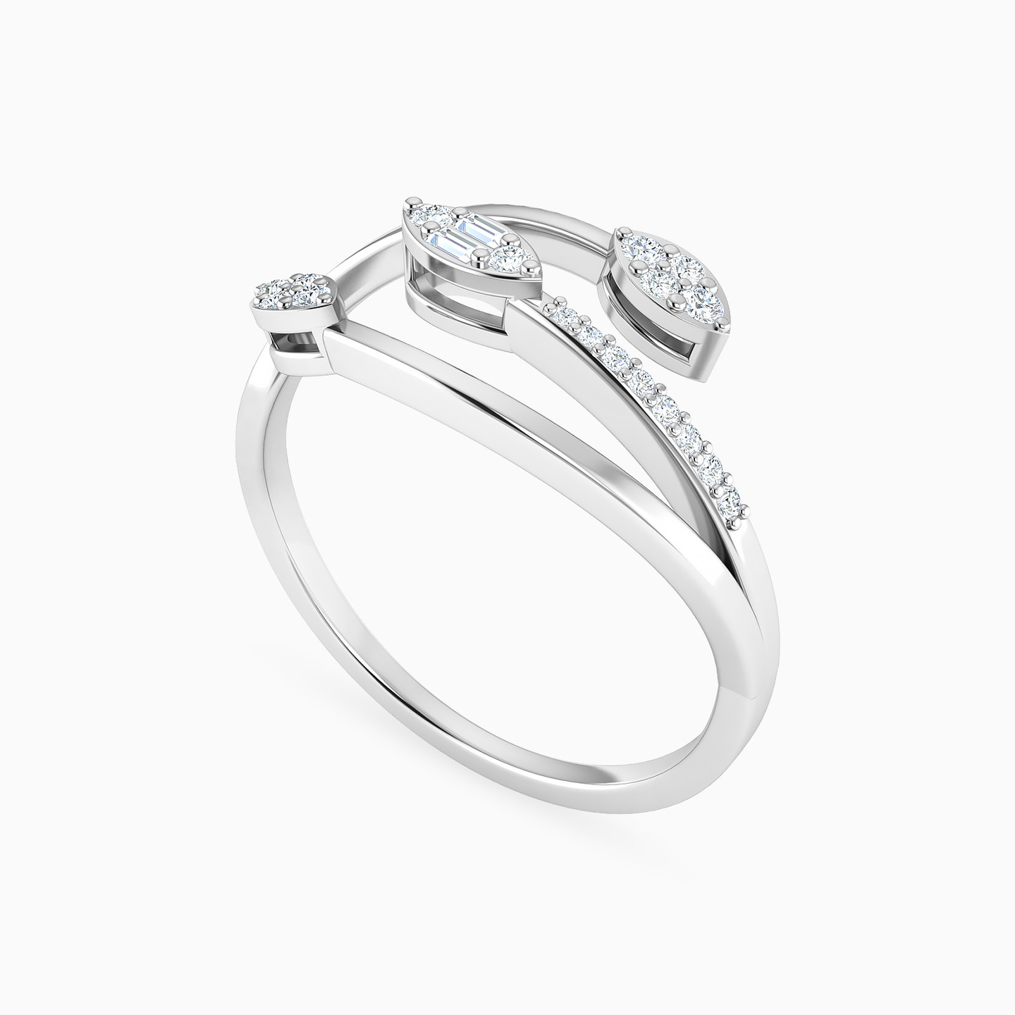A contemporary style ring from L'azurde Diamonds celebrating the beauty of the marquise shape. It features three rows of sleek 18-karat white gold bands, with one of them studded with diamonds, in a classic bypass-style design adorned with marquise-shaped heads that are studded with 0.13-carat brilliant cut diamonds. This captivating ring makes a perfect pick for days when subtle won’t do!